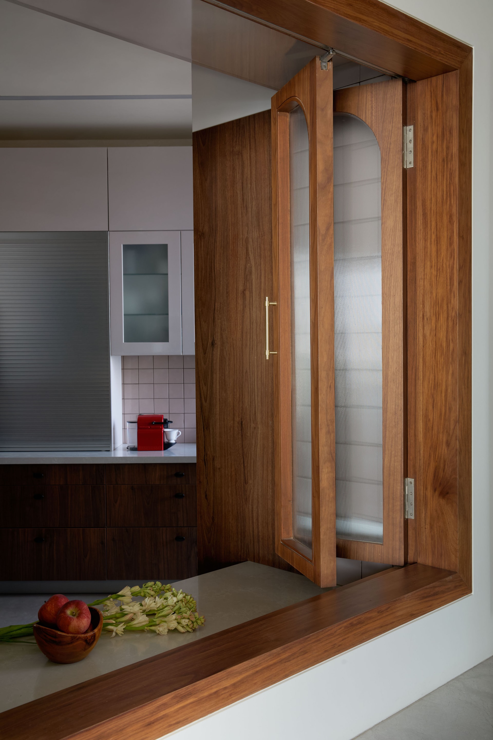 Adjacent to the living space, the dining area is a study in versatility, enclosed by floor-to-ceiling sliding doors that offer both openness and privacy. A wooden ceiling infuses warmth, while a sliding-folding window visually connects the dining and kitchen areas, enhancing the sense of fluidity.
