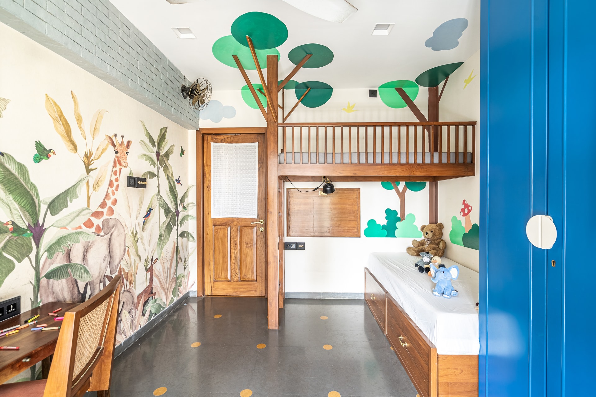 Within the children’s bedroom, a truly enchanting atmosphere unfolds. The walls of this space are adorned with an artful portrayal of a charming tree and a delightful array of animals, forming a captivating motif that instantly captures the imagination. As a complementary touch to this artistic scenery, the bedroom is thoughtfully furnished with a bunk bed, ingeniously designed to maximize space and offer a haven for rest and play. Alongside this, a dedicated study space is thoughtfully incorporated, ensuring that young minds have a conducive environment for both learning and creative exploration.