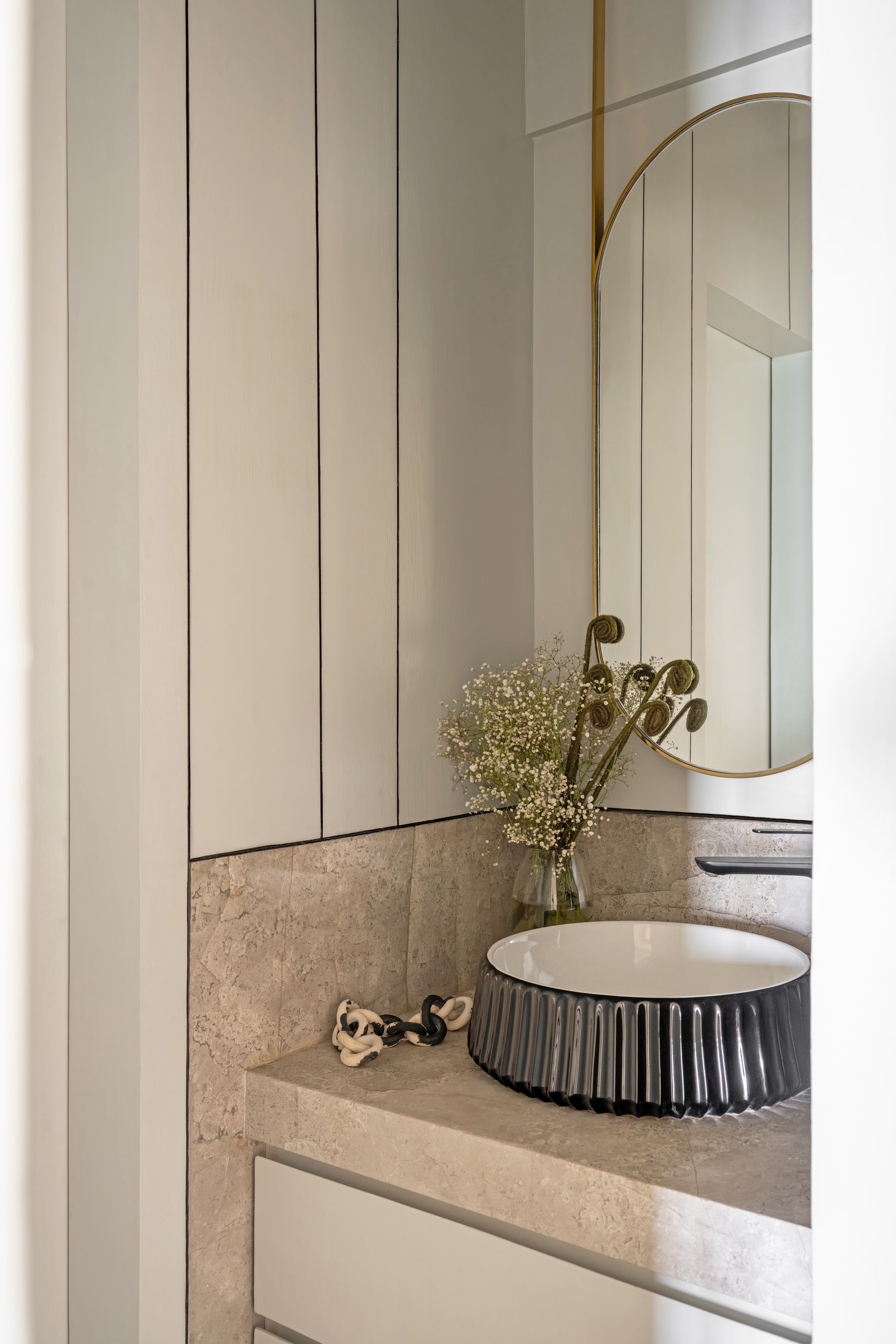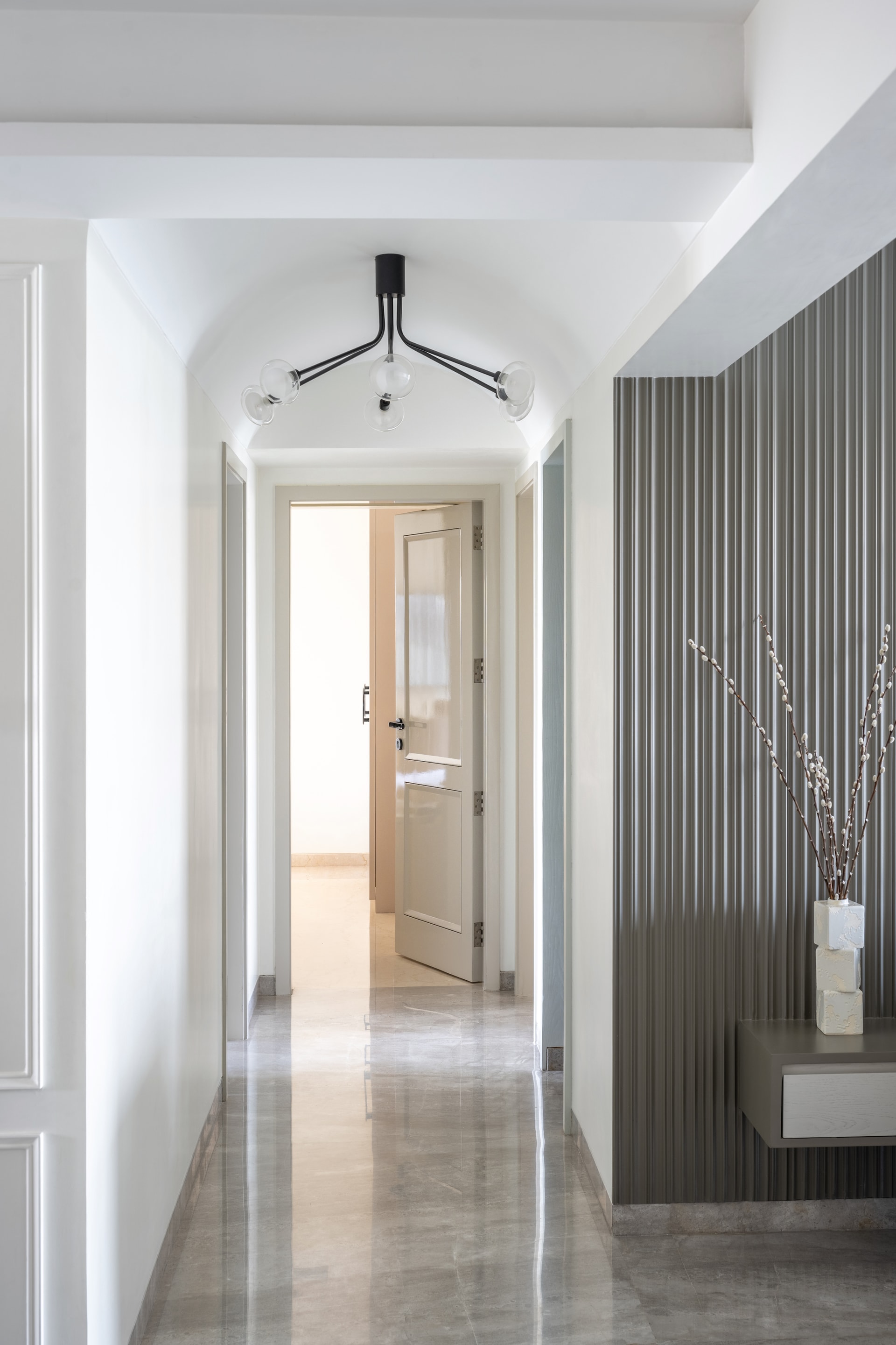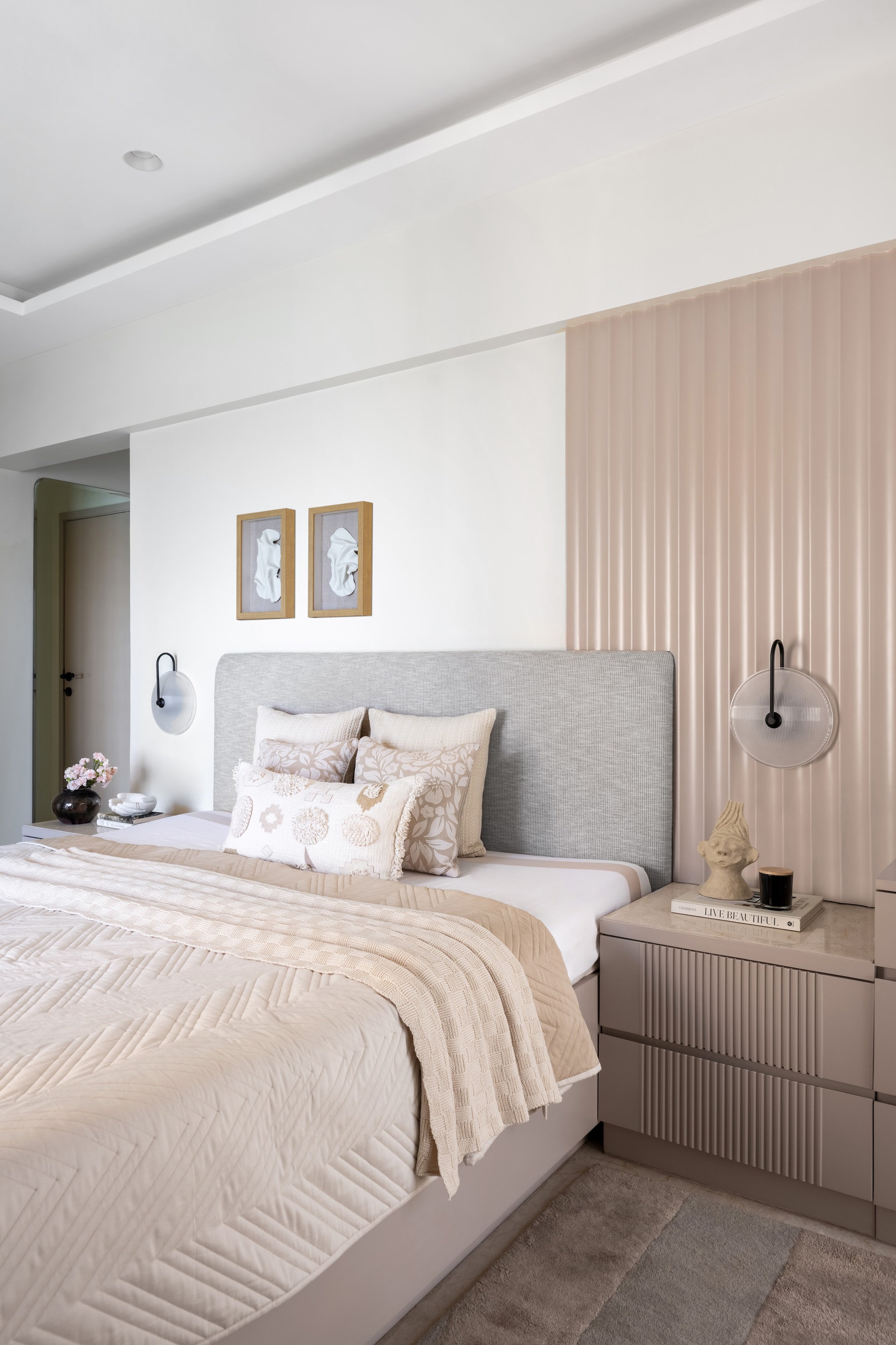 The master bedroom epitomises refined simplicity. Fluted wall paneling conceals the bathroom door, maintaining the room’s seamless flow and visual serenity. Here, a luxurious bed, paired with a minimalist dresser, anchors the space, creating a retreat that is as calming as it is elegant. Textures and prints—carefully curated in muted greys and pastels—add a tactile richness, ensuring the room remains both inviting and visually engaging.