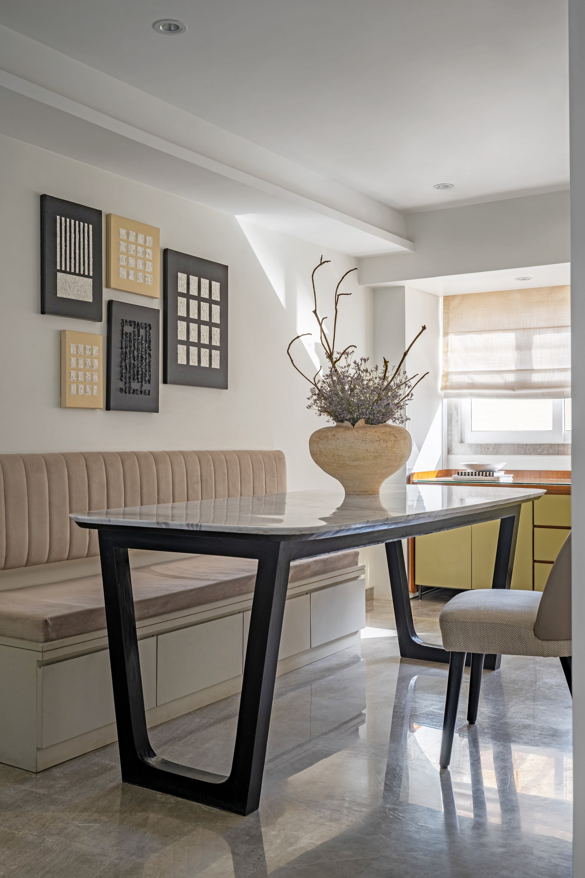 The dining area, thoughtfully designed with a combination of a bench and loose chairs, enhances the sense of spaciousness while fostering connection. The continuation of box paneling onto the internal bedroom doors, finished in a glossy off-white, reinforces cohesion and amplifies the apartment’s airy feel.