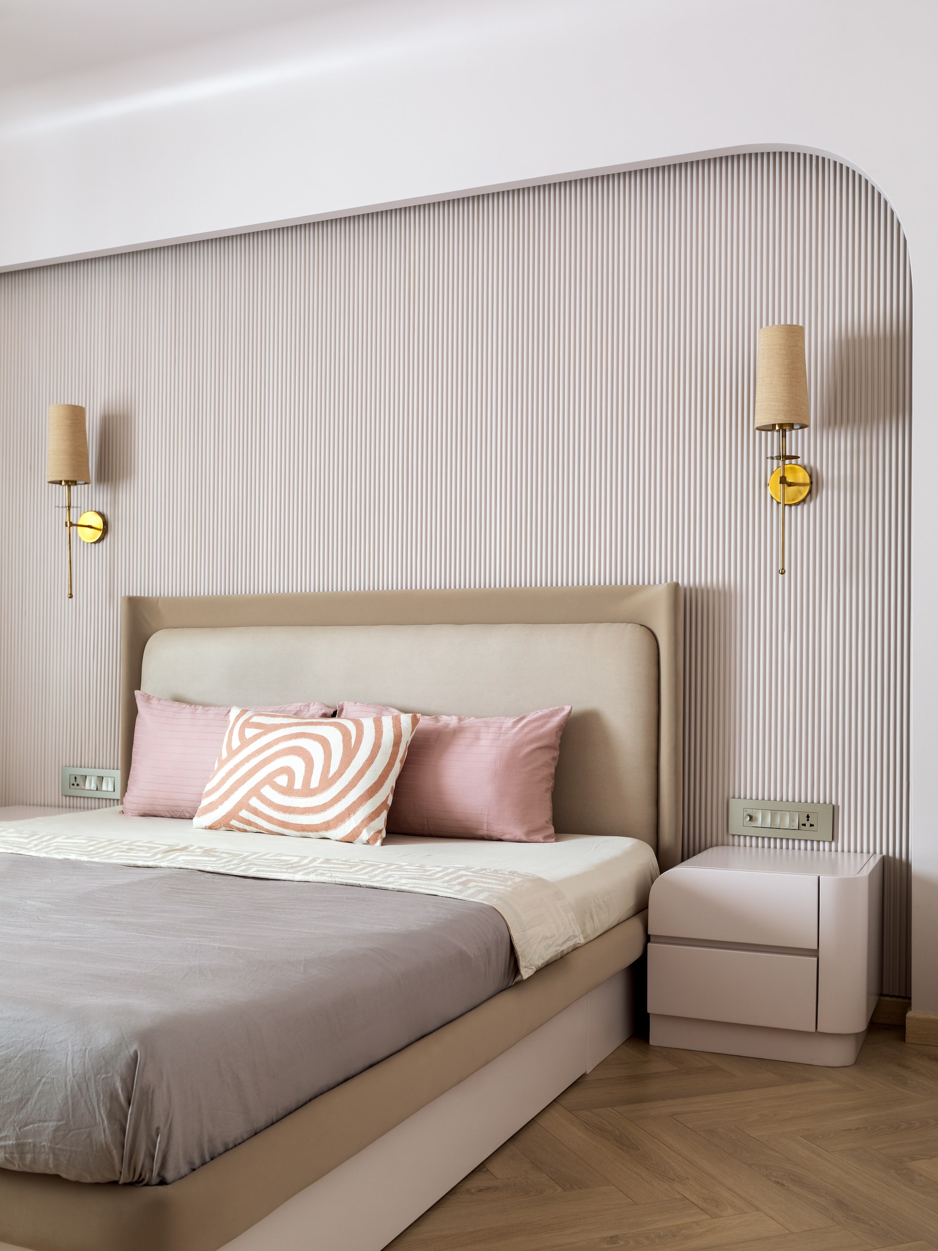 The master bedroom here is a retreat from the world where intimacy and comfort are paramount. In designing this space, the team focused on creating an environment that envelops its occupants in warmth and a place where the stresses of the day melt away the moment one steps inside. The use of warm mushroom shades on the walls and furnishings creates a soft, enveloping atmosphere that soothes the senses. Lighting plays a crucial role in this space, with soft, glowing lights carefully placed to highlight the room’s textures and create a warm, inviting ambience. These lights are not just functional; they are an integral part of the room’s design, casting gentle shadows that add depth and dimension to the space. The design of the master bedroom is also a study in practicality. Ample storage solutions are integrated thoroughly into the room’s layout, ensuring that the space remains clutter-free. Every element, from the choice of materials to the placement of furniture, is designed to enhance the room’s sense of calm and intimacy, making it a true sanctuary within the home.