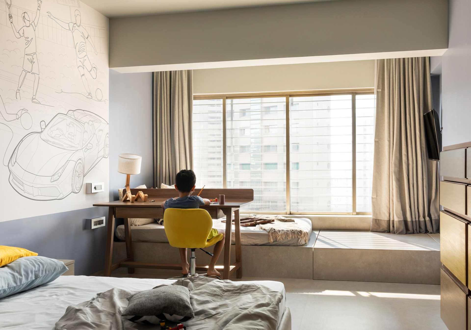 The kid’s bedroom here is a vibrant, playful space that reflects the boundless energy and imagination of its young occupant. The design team understood the importance of creating a room that not only meets the child’s current needs but also has the flexibility to grow and evolve over time. This was achieved through the use of a custom football-themed backdrop, a nod to the child’s passion for the sport. The vibrant colours and dynamic design infuse the space with a sense of fun and energy, making it a place where the child can play, learn, and dream.