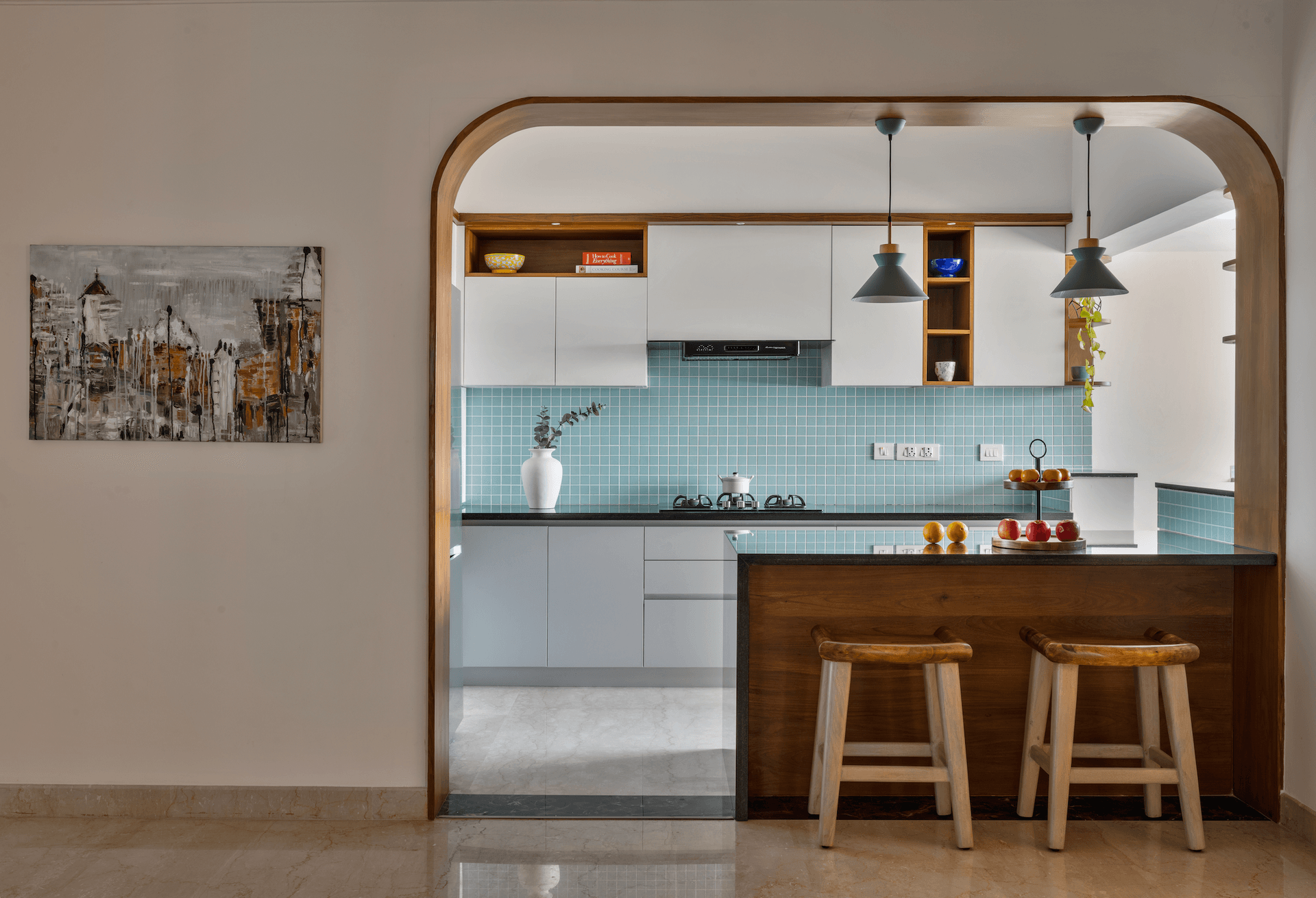 The living room resembles a courtyard with every room, including the kitchen, dining room, and foyer, looking into it, and vice versa. The design team suggested veneer panelling around the arches for a warm appearance, while maintaining an airy feeling throughout. The natural teak finish ties all the veneer-based units and elements together, from the crockery to the TV unit, study/side ledges, wooden slats, and breakfast counter fascia.