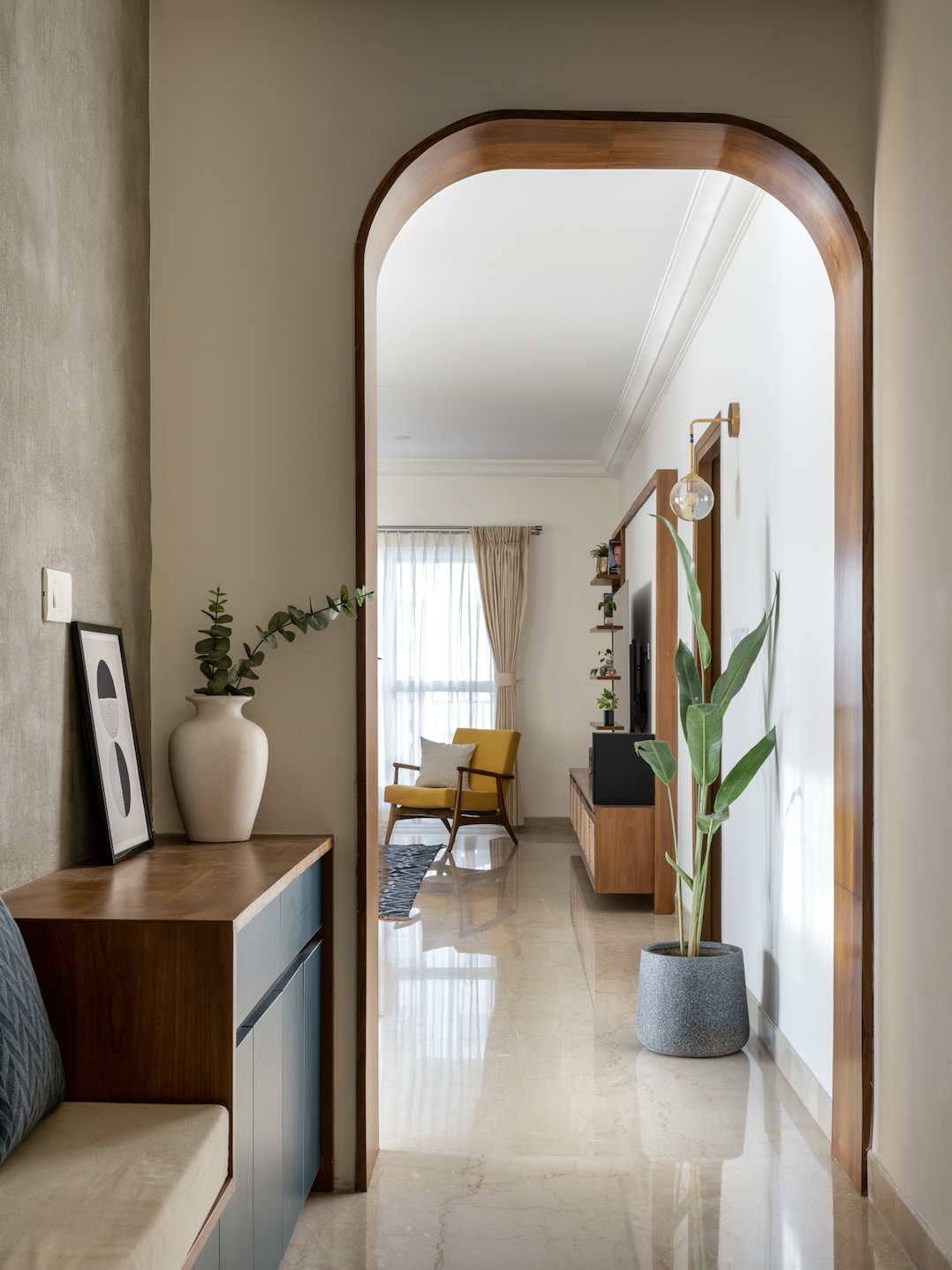 The home of a young couple is a reflection of their unbridled modern outlook and informal, easy-going warmth. The couple’s unique style leans towards a blend of contemporary and Indian-folksy aesthetics, which is reflected in every nook and space of their home. The design brief was for an open, airy, and warm home, and the design team delivered with a proposal of arches across all openings to accentuate the courtyard impression.