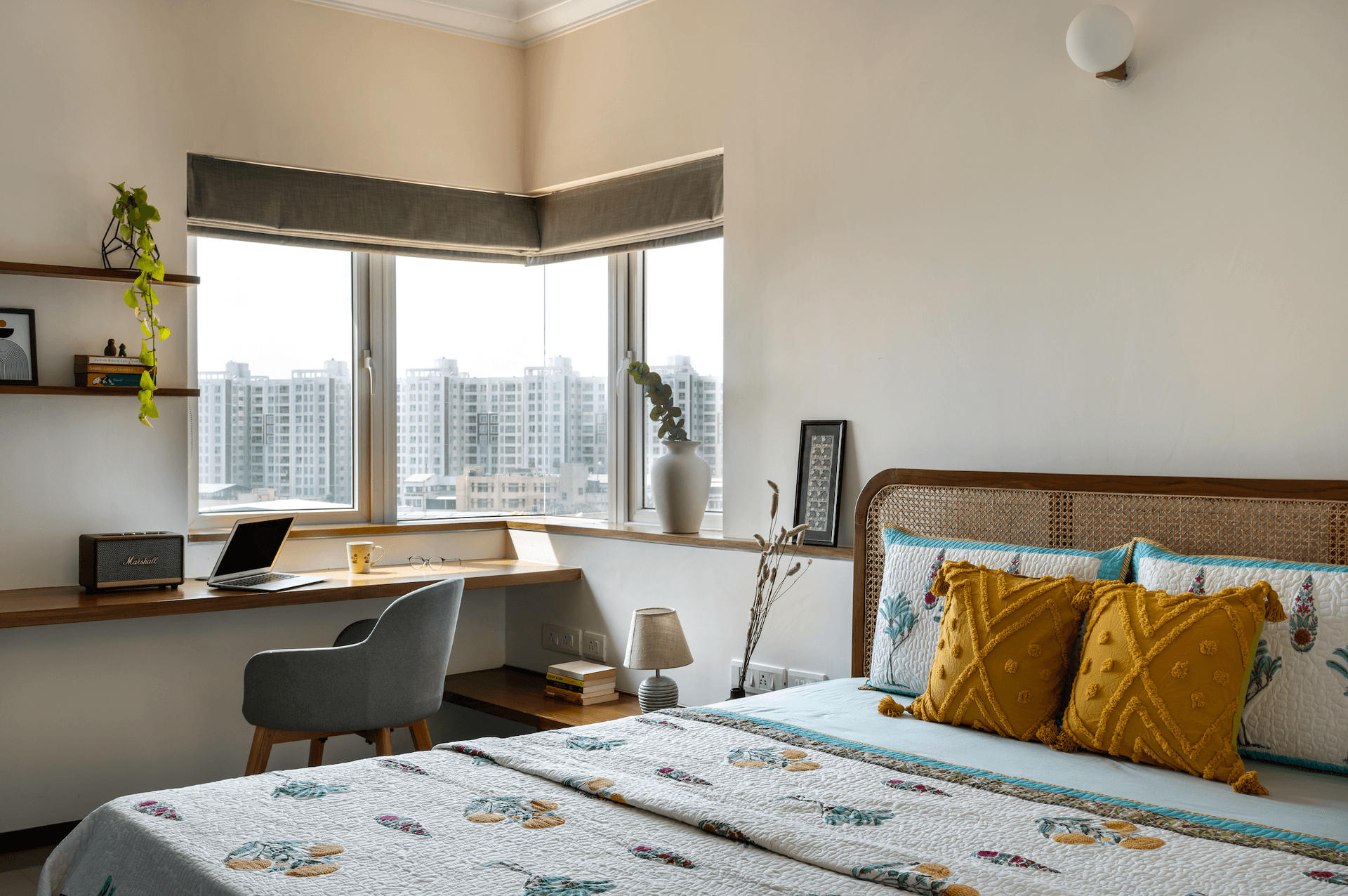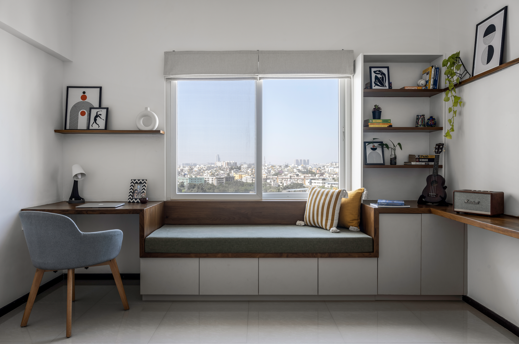 Next in the geography of the home is the study cum media den, which follows a contemporary palate. The study ledge unfolds to a window seating on one side and continues as a TV ledge on the perpendicular wall. This area is where the clients wind through work and unwind after work. Besides, it also doubles as a gaming zone for a passionate gamer in the client. Twilight is a sight to behold here, giving the impression that the sun is setting right into the window’s lap. All one needs is a chai and an immersive mindspace.