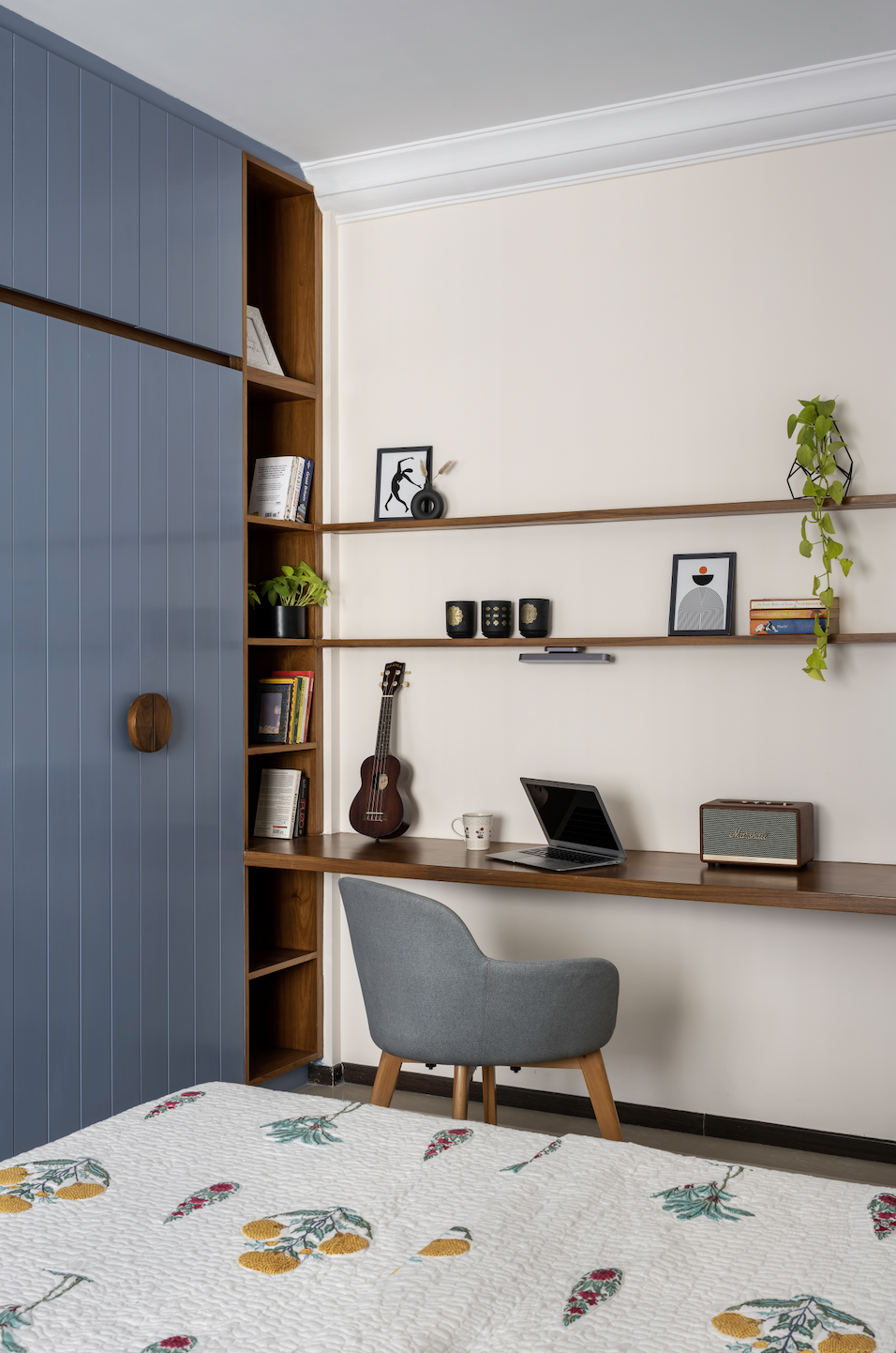 The guest bedroom follows the same contemporary palate and features a royal blue PU-polished wardrobe with a TV ensconced within it on one side. This room also doubles as a second work-from-home room, and an elaborate study ledge is provided for. A rattan headboard bed was added last minute during the design process, and the combination of the royal blue wardrobe and rattan weave of the bed makes the space very earthy. It’s a perfect addition to the room.