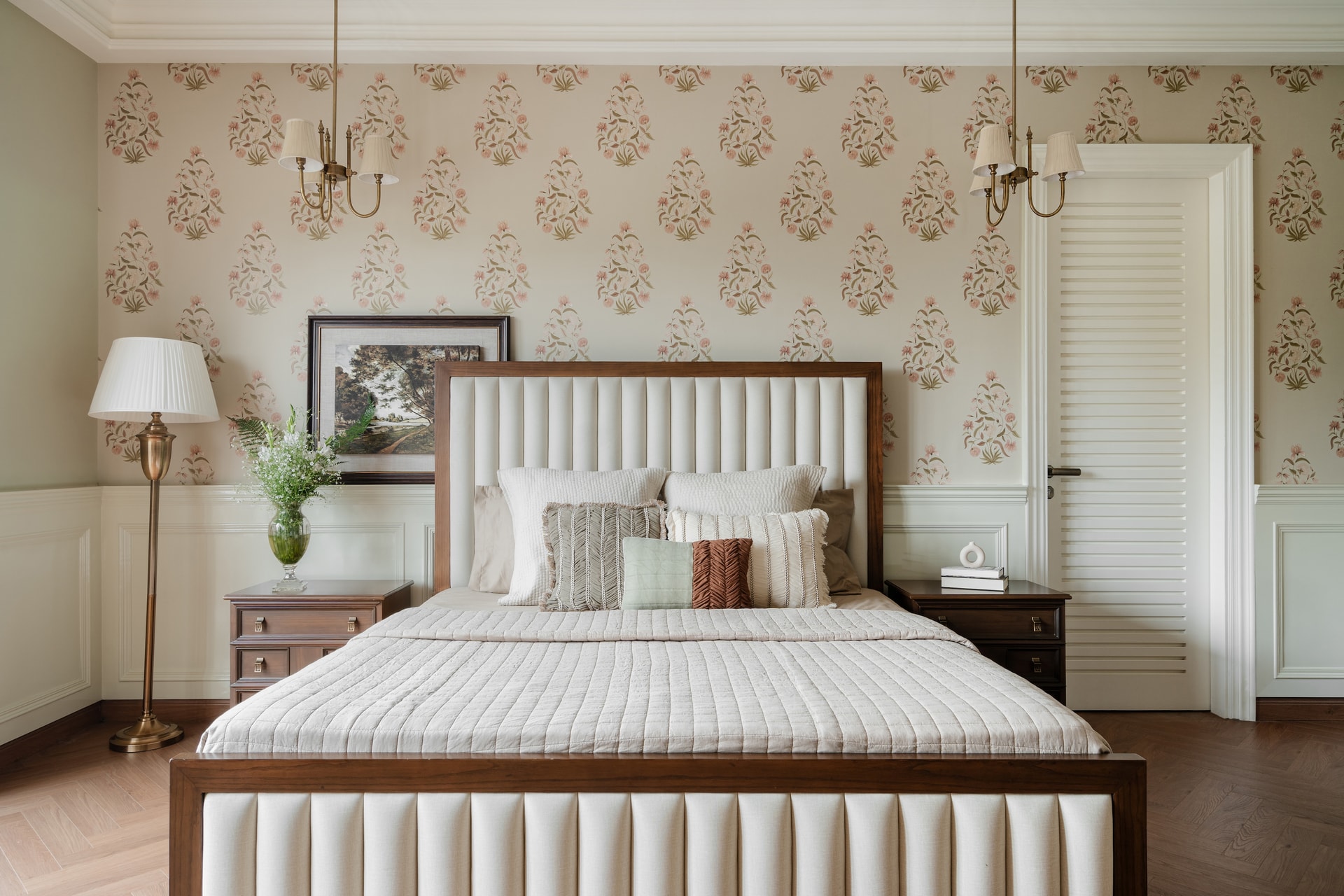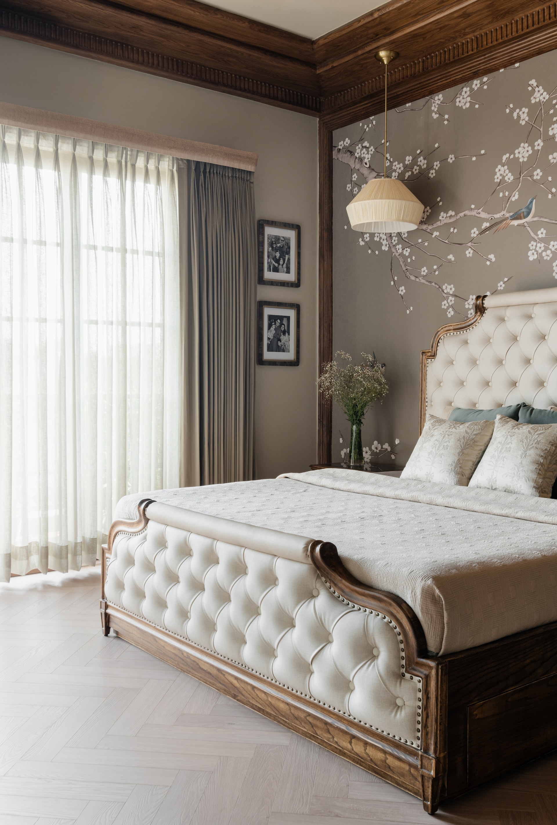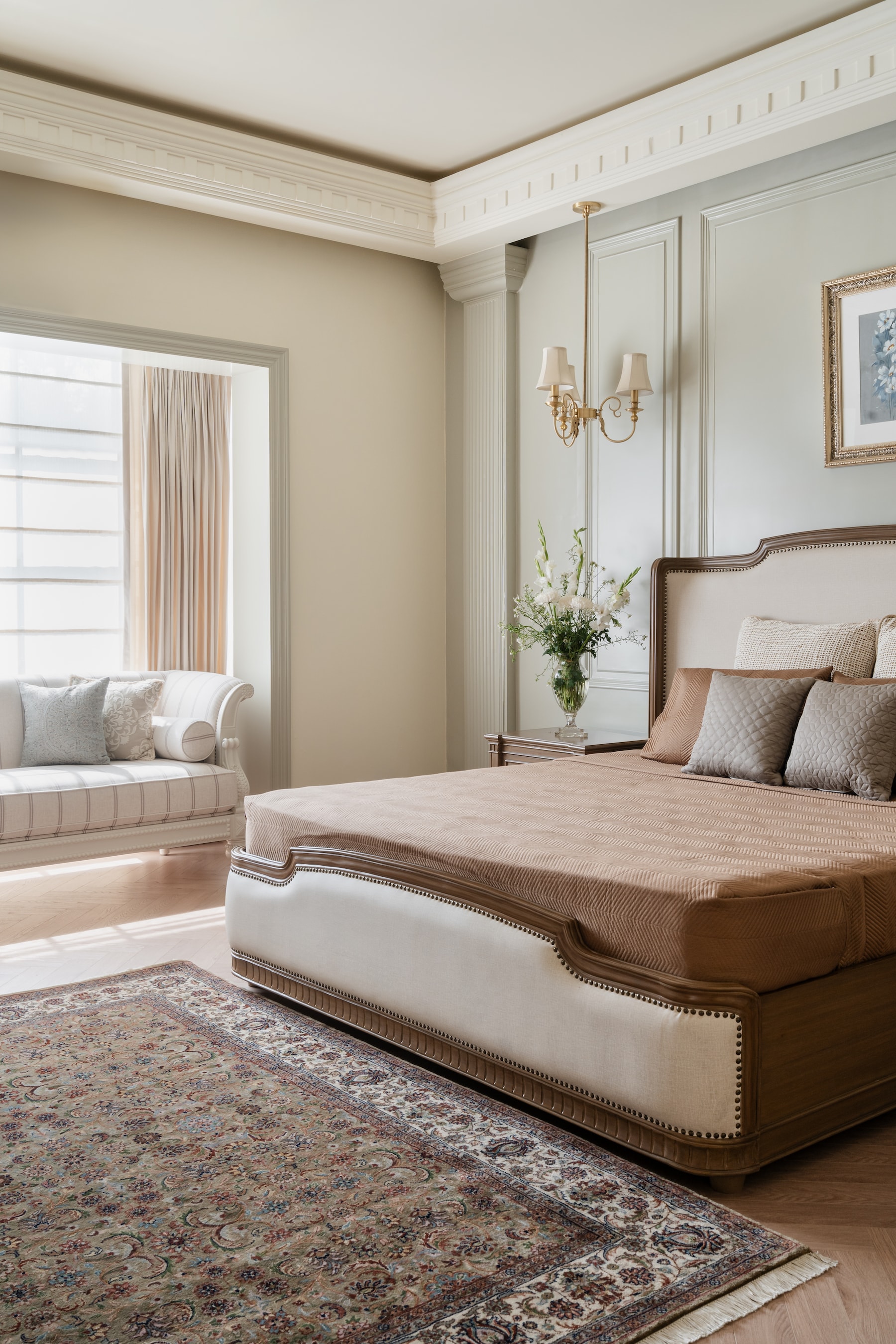The master bedroom on this floor offers a serene escape, adorned with soft linens and earthy tones. This blend of French and English sensibilities creates a calming, luxurious environment, perfect for rest and rejuvenation. The integration of pastel colours and minimalistic wall treatments enhances the floor’s light, airy feel, making it a tranquil retreat within the home.