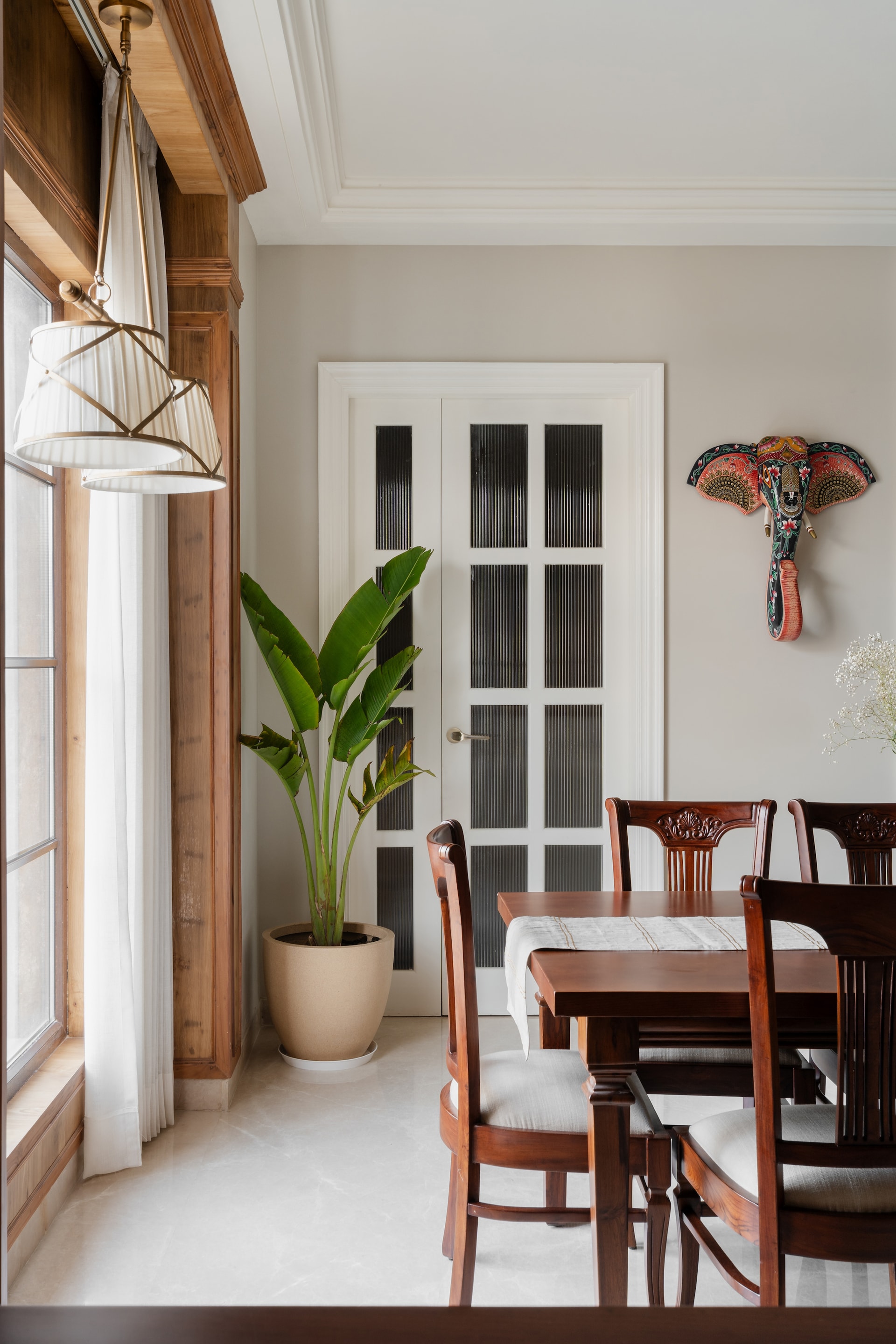 The introduction of rustic elements, collected from the family’s travels, adds a unique character to the Georgian theme, preventing it from feeling too flat in the Indian light. The drawing room, opening into an expansive study, is bathed in natural light, creating a dramatic and inviting effect. The study, furnished with dark teak and Stanley pieces, serves as a sophisticated workspace, rich with character and conducive to focus.
