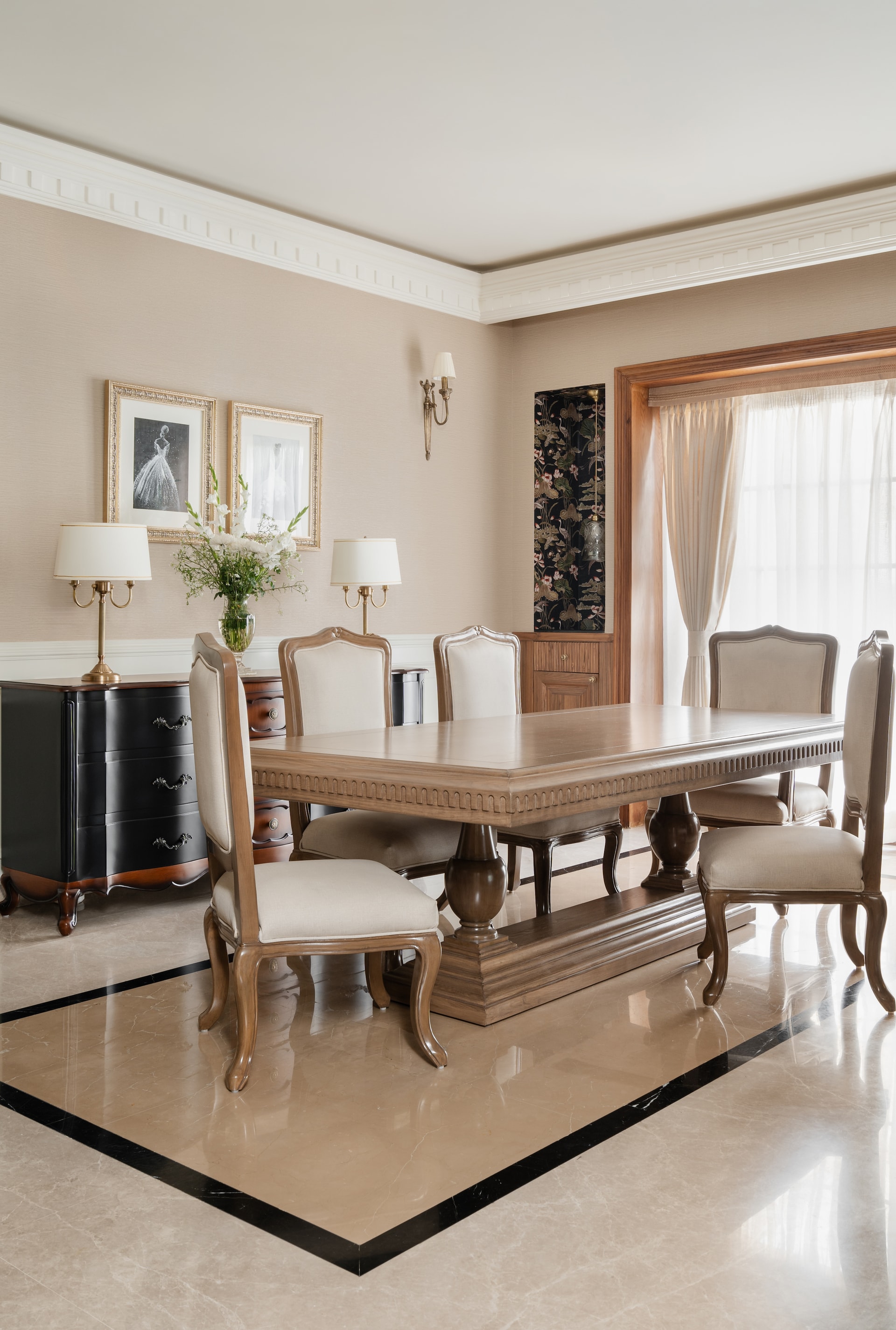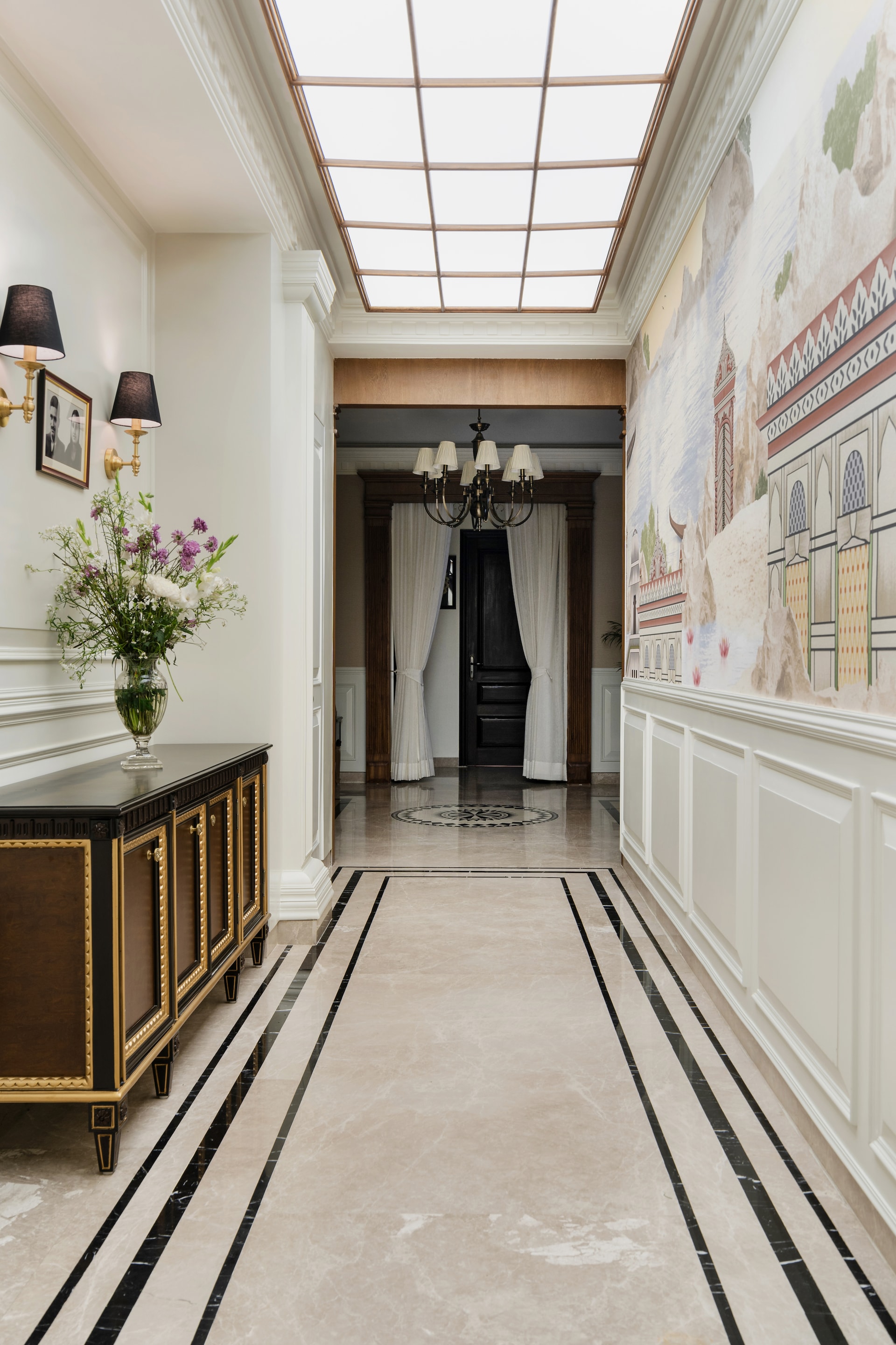 Ascending to the first floor, one enters a realm of Georgian elegance, where the aesthetic continuity of European influences is maintained yet distinctly expressed. The floor is characterised by its immaculate black and white polished floors, reflecting light with a mirror-like finish and adding a sense of drama and sophistication.