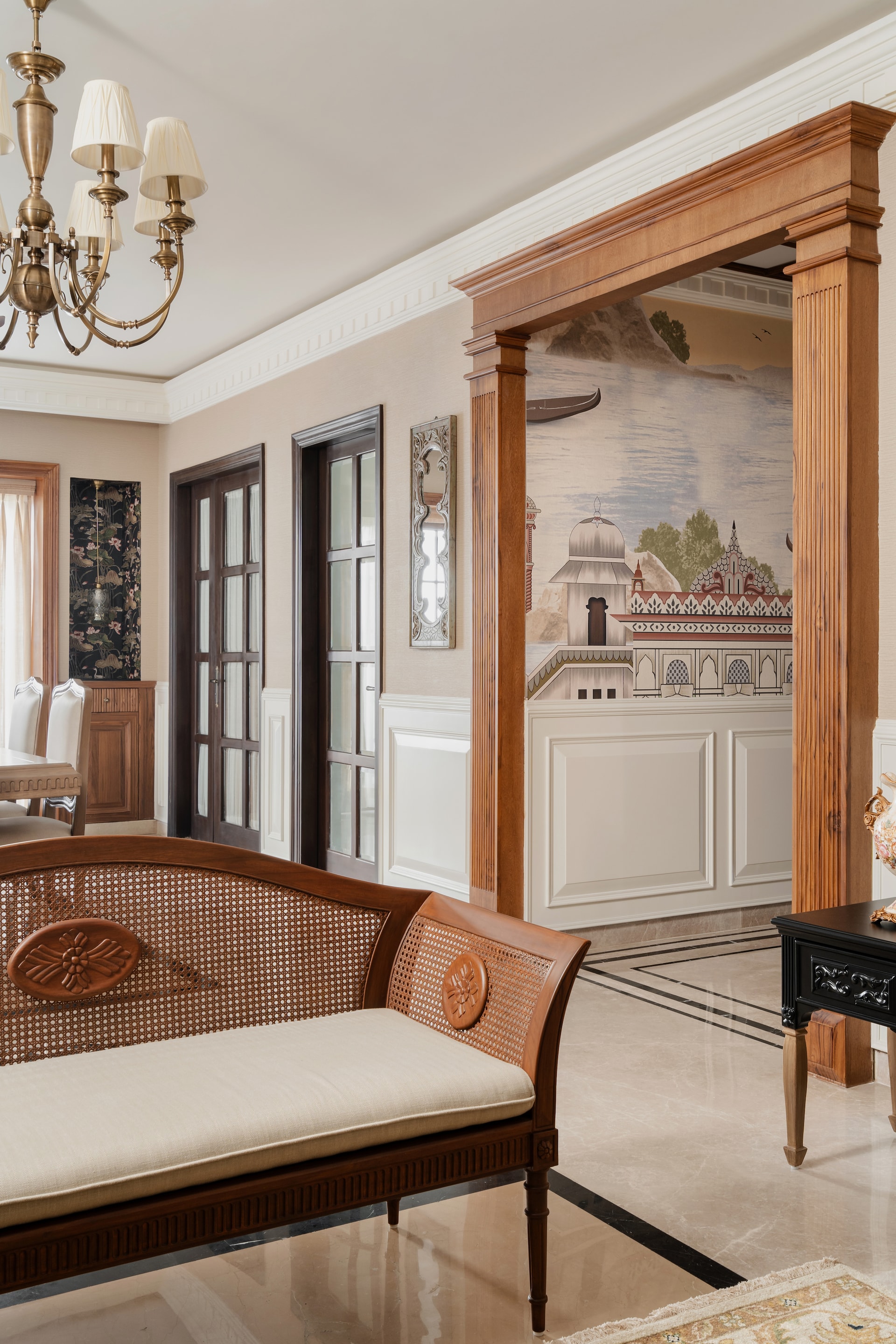 Entering the drawing room, one is immediately drawn to a magnificent French tapestry, an artefact from the family’s travels, which serves as the room’s pièce de résistance. Surrounding this piece, the room’s design incorporates rich, dark teak and oak woods, imbuing the space with a sense of regality. The bespoke black cabinet, crafted by the in-house team, boasts a shadowed polish effect, showcasing meticulous craftsmanship and ensuring that every element contributes to the overall aesthetic harmony.