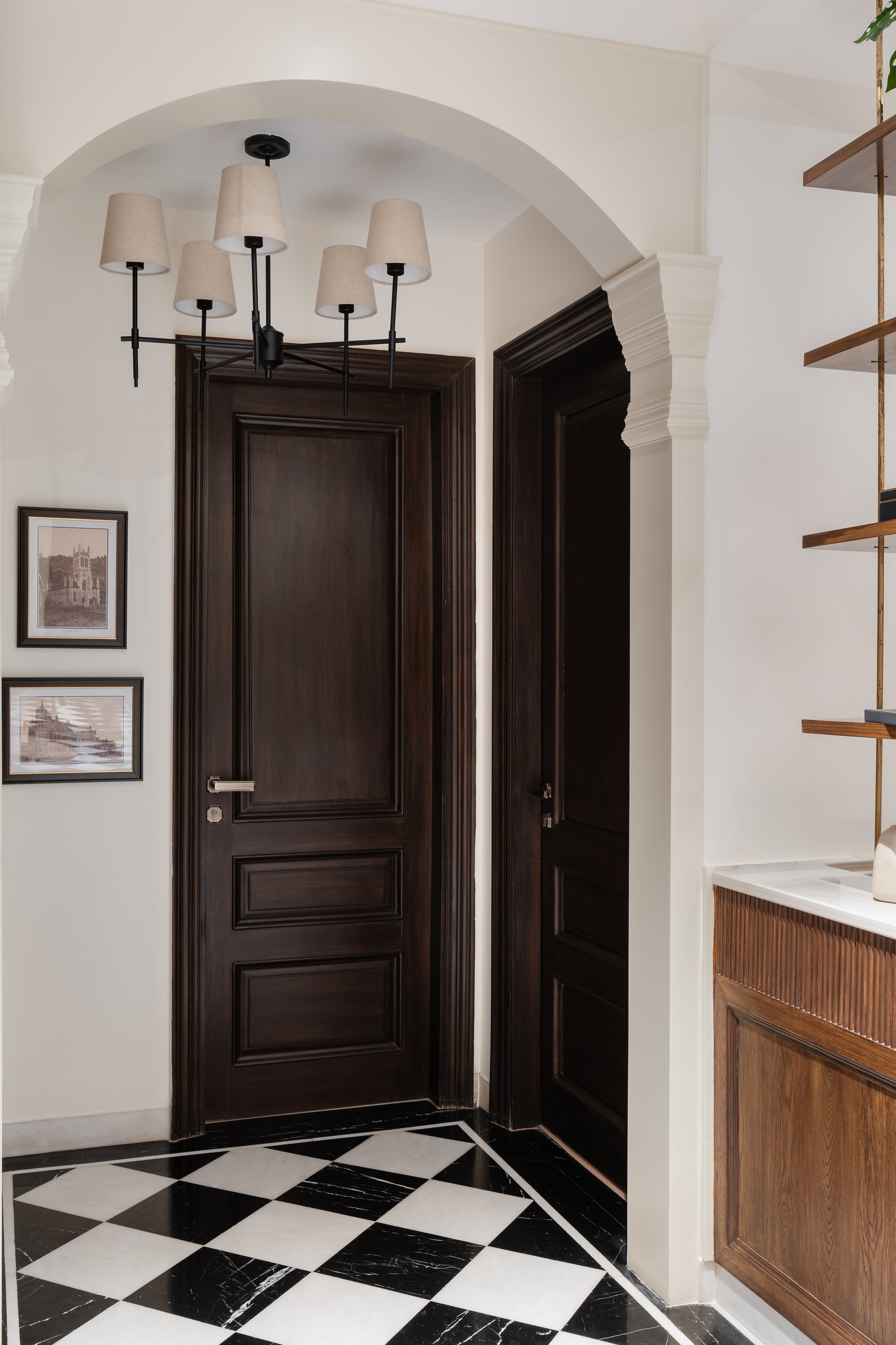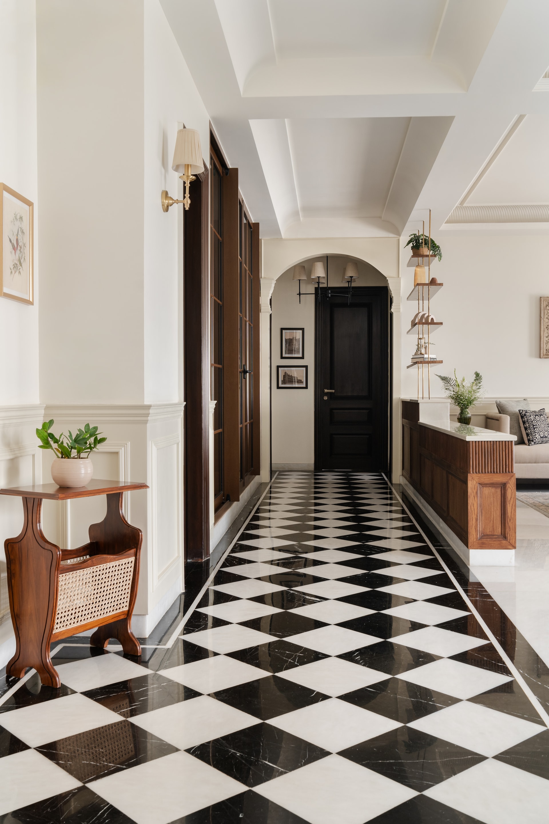 The second floor, a personal favourite of the design team, is envisioned as a distinct world unto itself. High arches greet visitors upon entry, creating an immediate sense of grandeur and anticipation. This floor features a staircase leading to a half-floor study and terrace, both of which are bathed in natural light. The black and white flooring, a nod to classic European design, reinforces the timeless aesthetic.