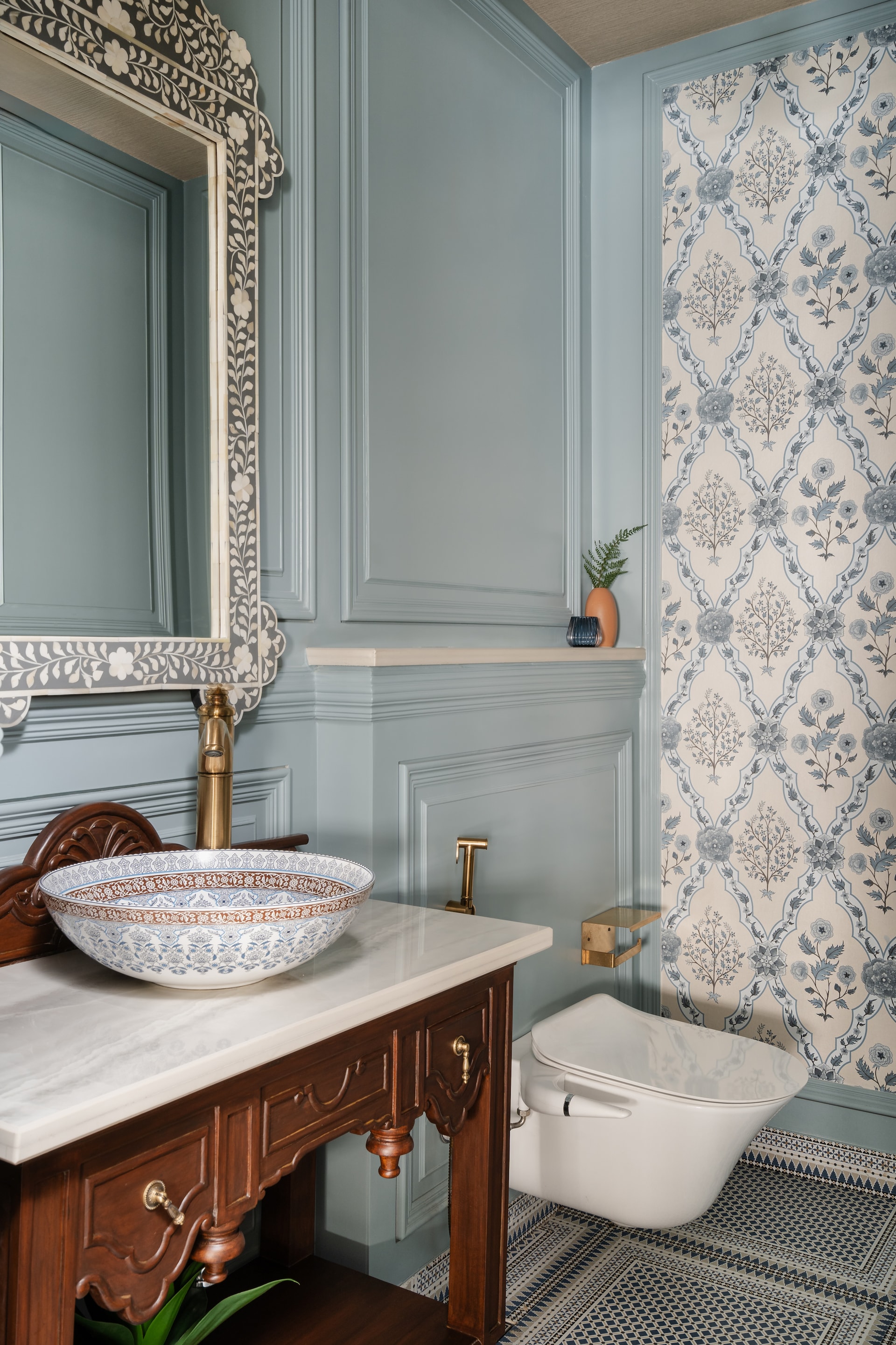 A charming powder room, cleverly concealed within the lobby’s wall panelling, surprises guests with its understated elegance. The lobby itself, featuring an artificial skylight, transitions from a well-lit entryway to the softly lit drawing room, creating a dramatic yet welcoming atmosphere. The guest room and kids’ room continue the theme of elegant practicality, ensuring both comfort and adaptability for the evolving needs of the family.