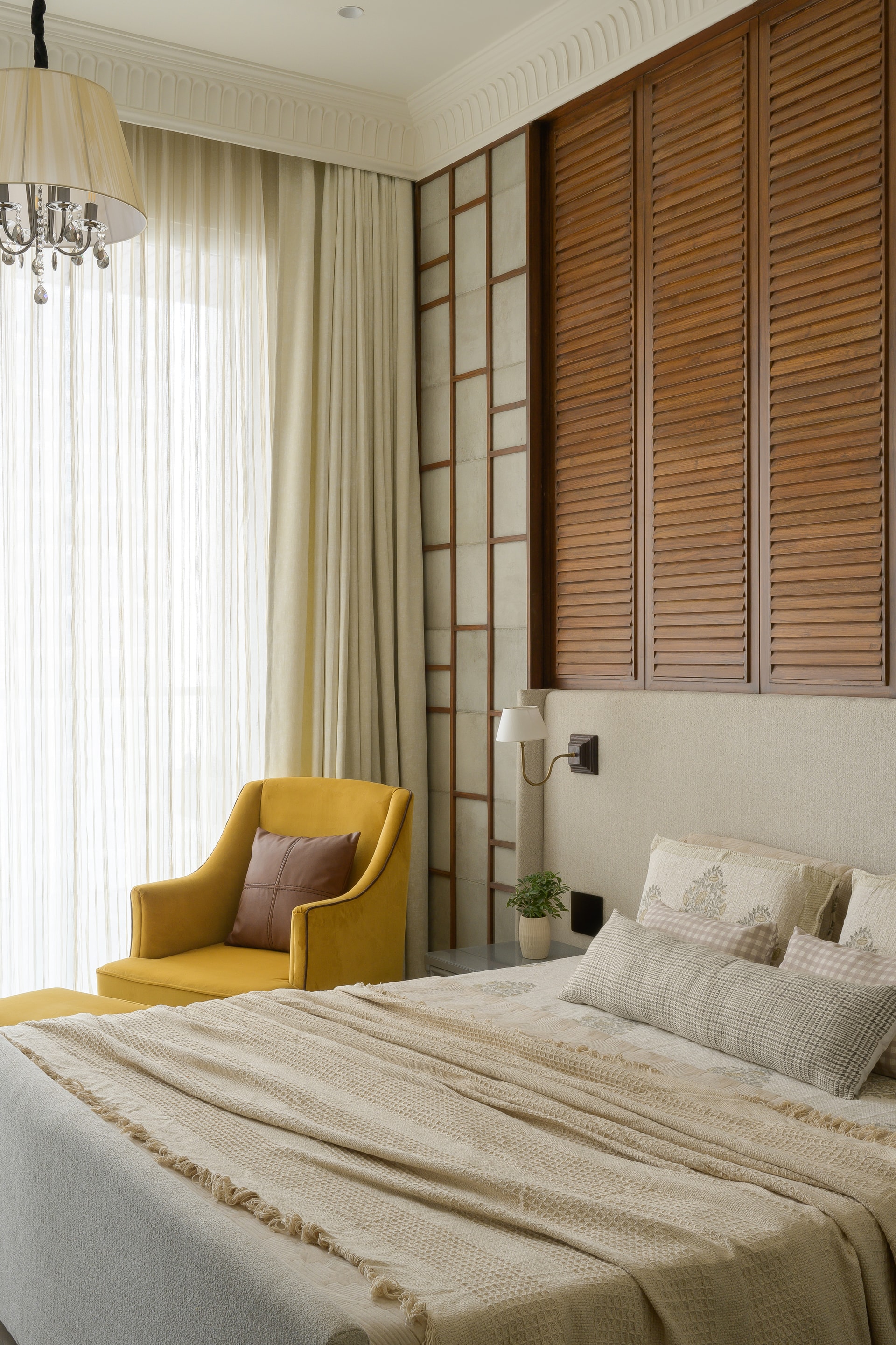 In the master suite, material interplay takes center stage. A wooden louvered panel serves as a warm backdrop to the bed, while the adjacent walls are clad in grey textured tiles, their cool tones balancing the warmth of the wood. Framing the tiles is a custom brick-pattern wooden strip, an architectural detail that draws the eye upward and plays with scale. Perimeter moulding adds a classical edge, softening the otherwise modern framework of the room. Beside the bed, a sleek chest of drawers and dresser unit stand out with their intricate geometric detailing, finished in soft PU paint. A gold-rimmed mirror completes the ensemble, amplifying light and lending a final touch of elegance.
