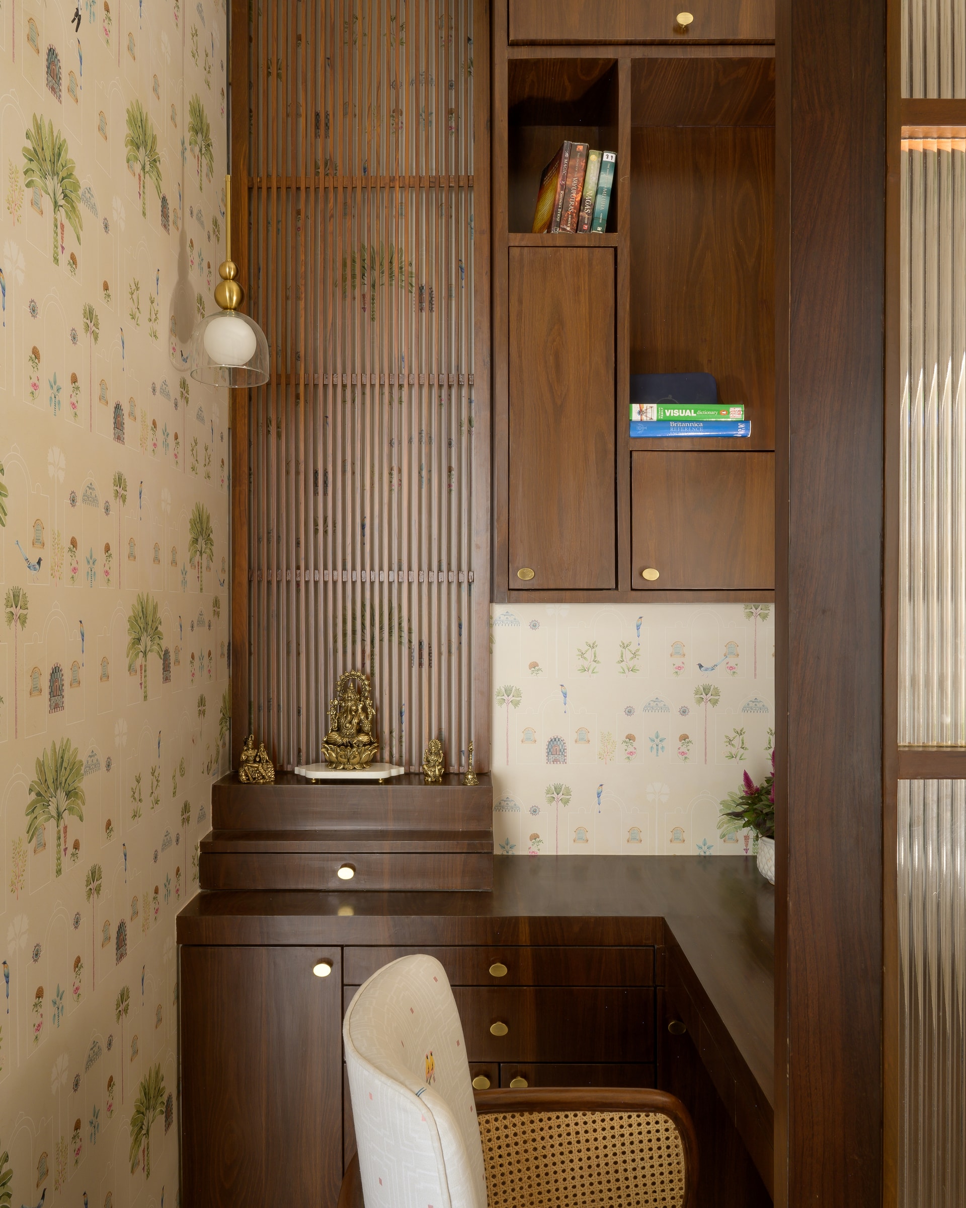 Opposite the kitchen lies a unique dual-purpose space: a tranquil pooja corner that transitions into a compact study area. Framed by a fluted glass and veneer partition, this niche is visually distinct yet remains connected to the overall layout. The backdrop features a custom-designed wallpaper overlaid with a wooden louver panel, bringing together spiritual symbolism and contemporary detailing. A dark veneer study desk with concealed cabinetry adds practicality, making this one of the most versatile pockets of the home. The space is meditative without being austere, perfect for both moments of prayer and focused work.