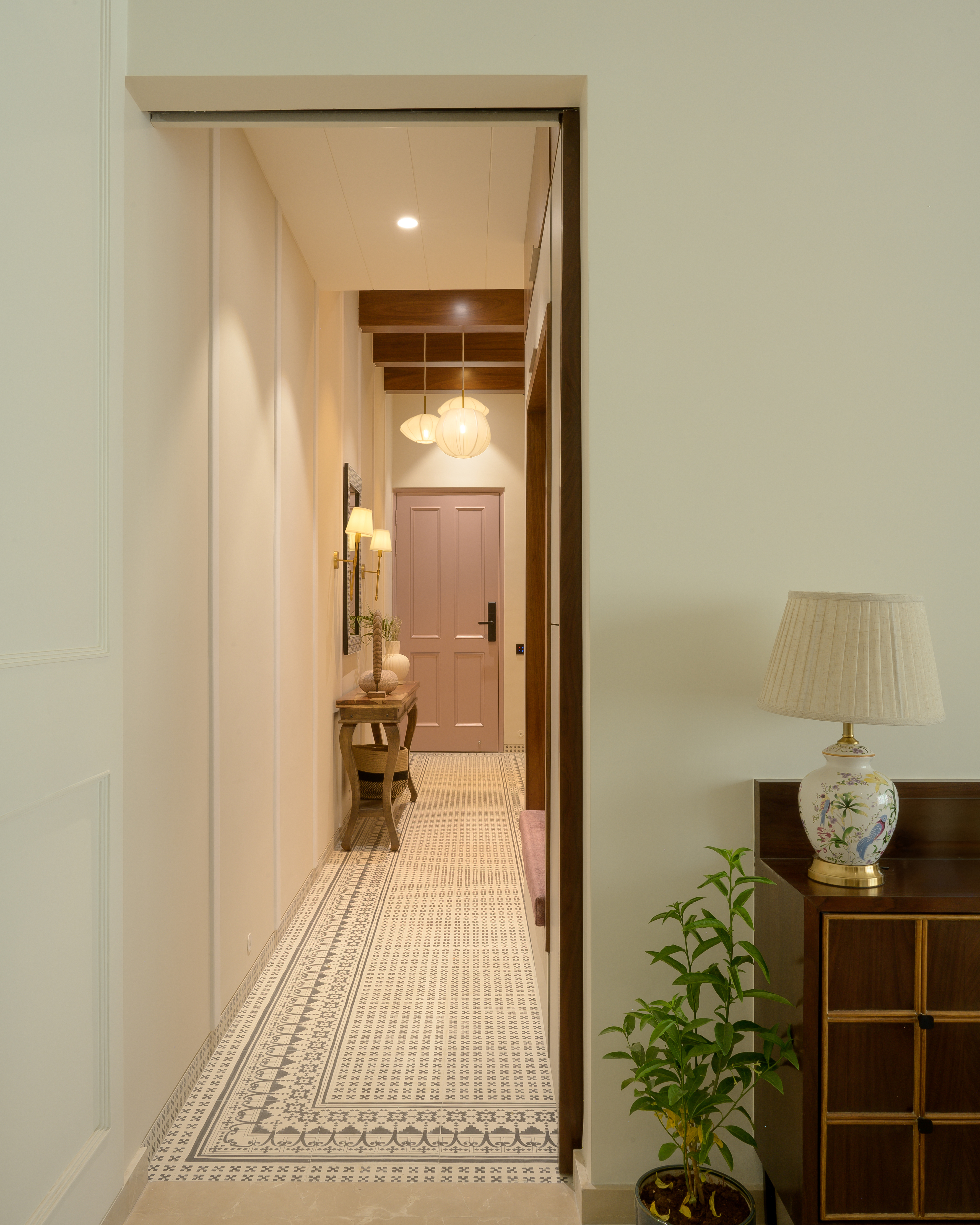 In most urban apartments, the entrance foyer is an afterthought, functional at best, forgettable at worst. But here, it becomes a celebration of scale and detail. With a soaring 11.5-foot ceiling, the entry passage instantly commands attention. Hand-printed geometric floor tiles framed by a delicate border lend artisanal charm, while above, wood-finished veneer rafters and a trio of pendant lights imbue the space with warmth and rhythm. One wall is thoughtfully treated with textured paint and decorative mouldings, accentuated by a classic console table and gold-accented wall sconces. A mosaic-bordered mirror enhances the depth and detail, while the other wall is kept seamless with PU-painted doors. At the end of the passage, a built-in bench with mirror paneling adds both character and clever concealed storage, an elegant prelude to the home’s layered design story.