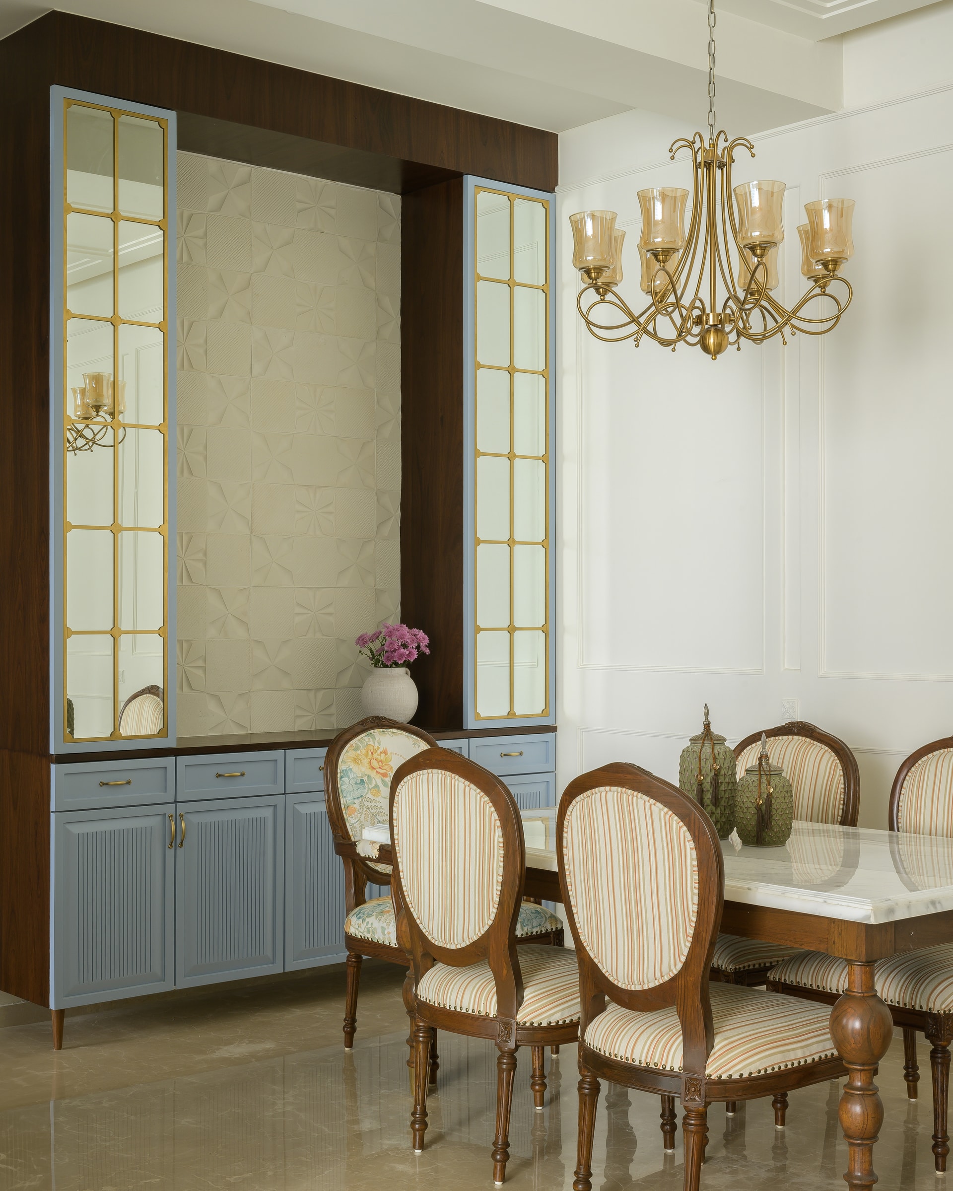The dining zone flows seamlessly from the living room, housing a six-seater marble-top dining table paired with wooden upholstered chairs that strike the perfect balance between comfort and sophistication. A crockery unit finished in powder blue PU paint adds a refreshing yet muted contrast to the neutral tones. Gold-framed mirror shutters and veneered detailing elevate this unit from functional furniture to a refined design element. Together, the open-plan living and dining zones embody a quiet luxury, one that doesn’t clamor for attention, but impresses through restraint and elegance.