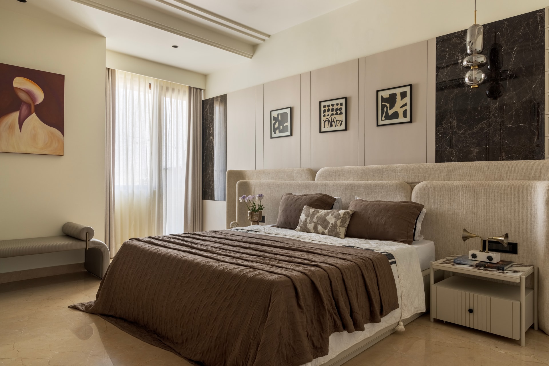 The private spaces within this Jaipur residence are designed as quiet sanctuaries, continuing the home’s overarching narrative of lightness, restraint, and material harmony. Each bedroom is approached as an individual retreat, yet unified through a cohesive palette of soft neutrals, tactile finishes, and carefully calibrated lighting that promotes rest and visual ease.