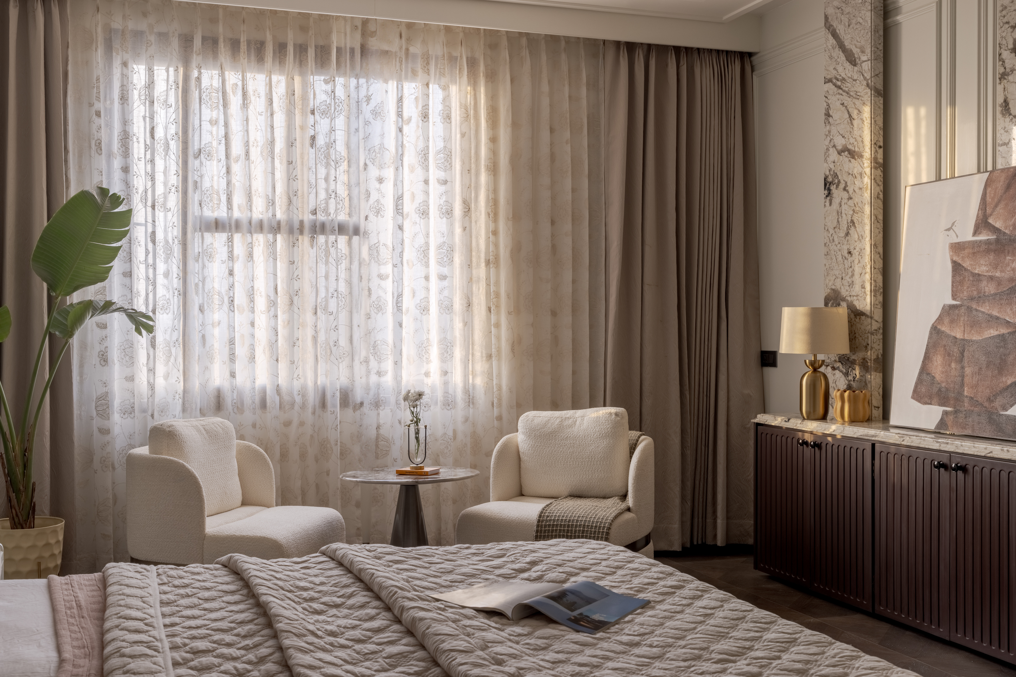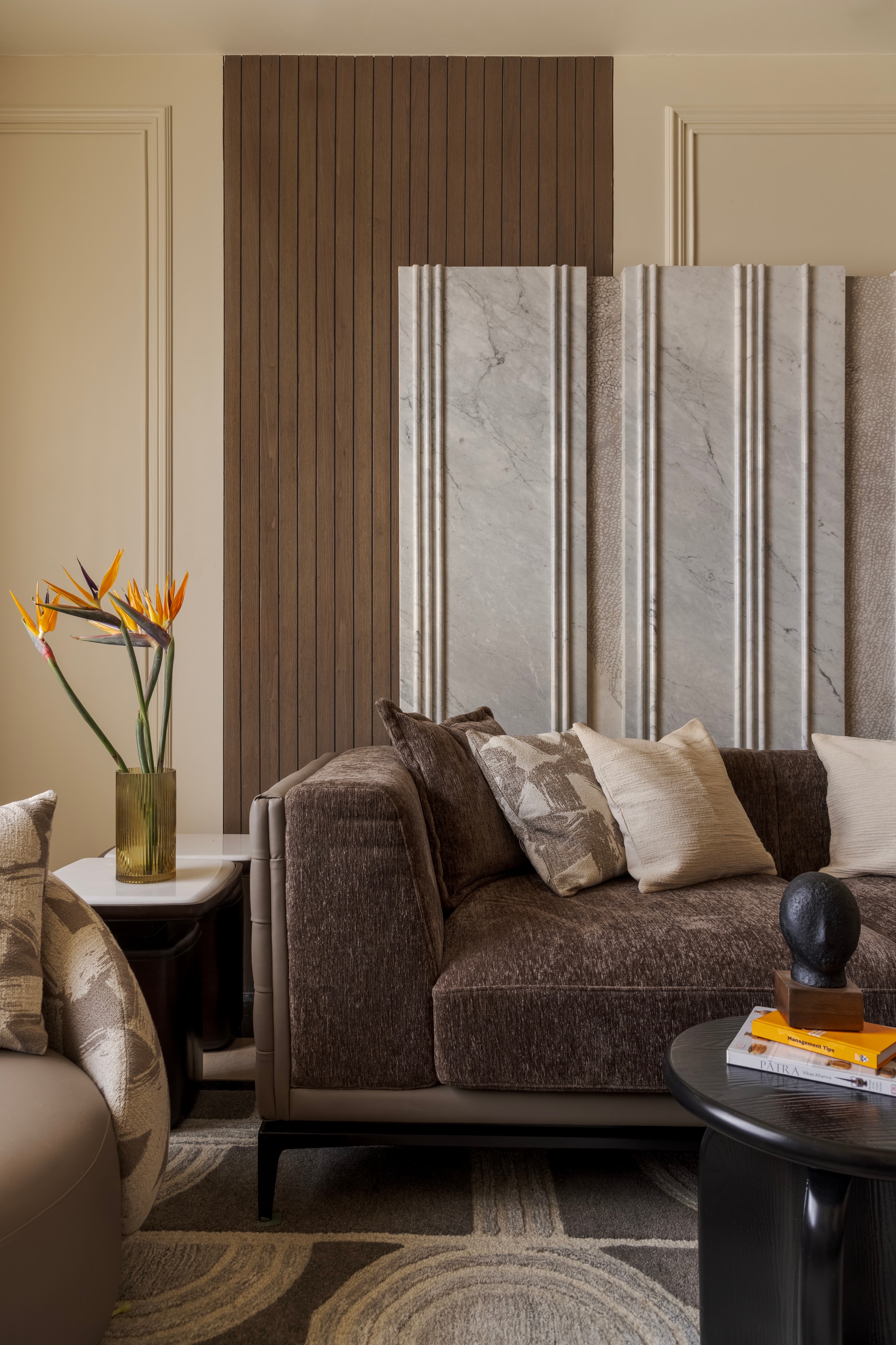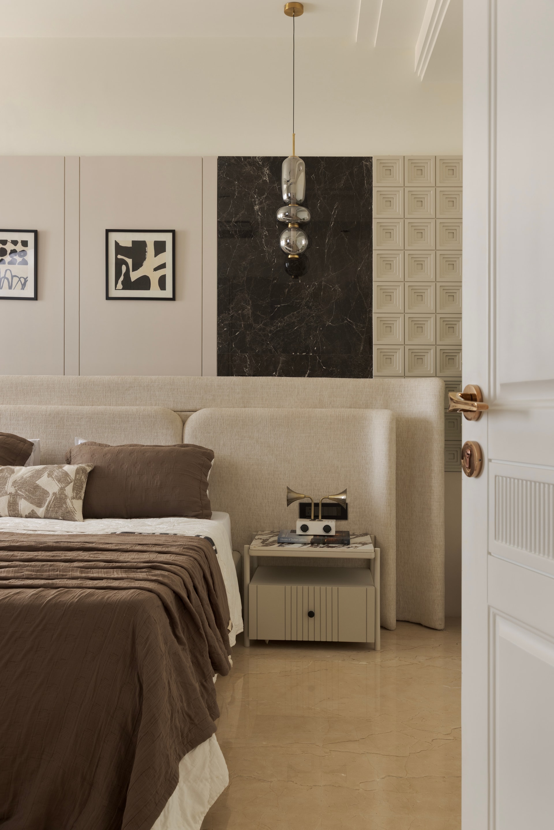Designed for formal entertaining, the drawing room continues the home’s elegant restraint. A neutral colour scheme is complemented by symmetrical wall panelling that lends structure and balance to the space. Subtle marble fluting introduces texture without visual heaviness, reinforcing the refined material palette. Adjacent living spaces are articulated through gentle architectural gestures rather than partitions. A large uninterrupted wall in the living area is softened through a series of arches, creating rhythm and movement while avoiding monotony. These arches are finished with intricately embroidered wallpaper, adding a layer of craftsmanship and tactile richness to the otherwise minimal setting.