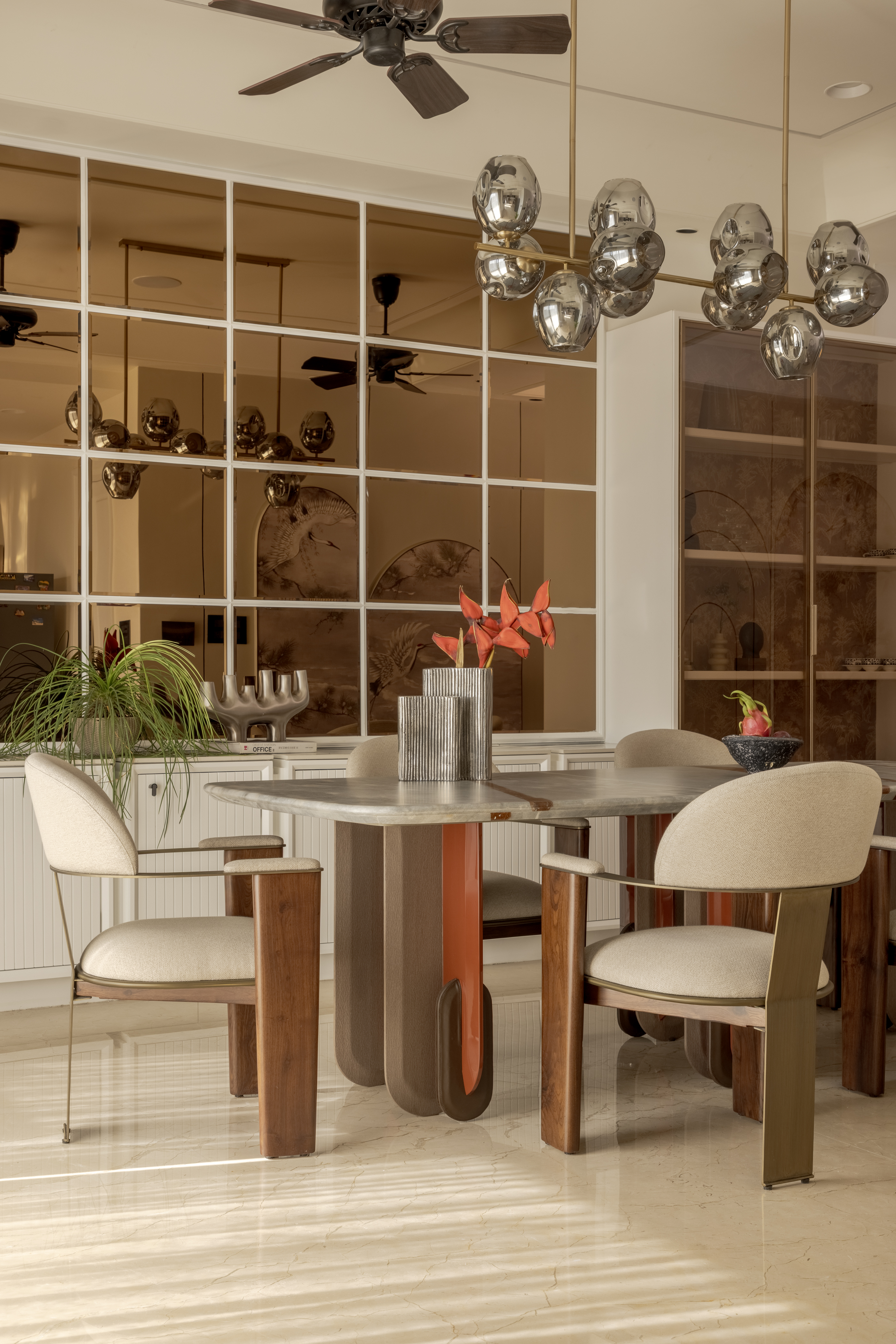 The dining area is conceived as a refined yet expansive space. Tinted mirror panelling with moulding details enhances light reflection while adding a touch of understated glamour. A marble-topped dining table with leather-detailed legs anchors the room, striking a balance between elegance and material tactility. Overhead, statement lighting fixtures act as sculptural elements, subtly reinforcing the design narrative without overpowering the space.