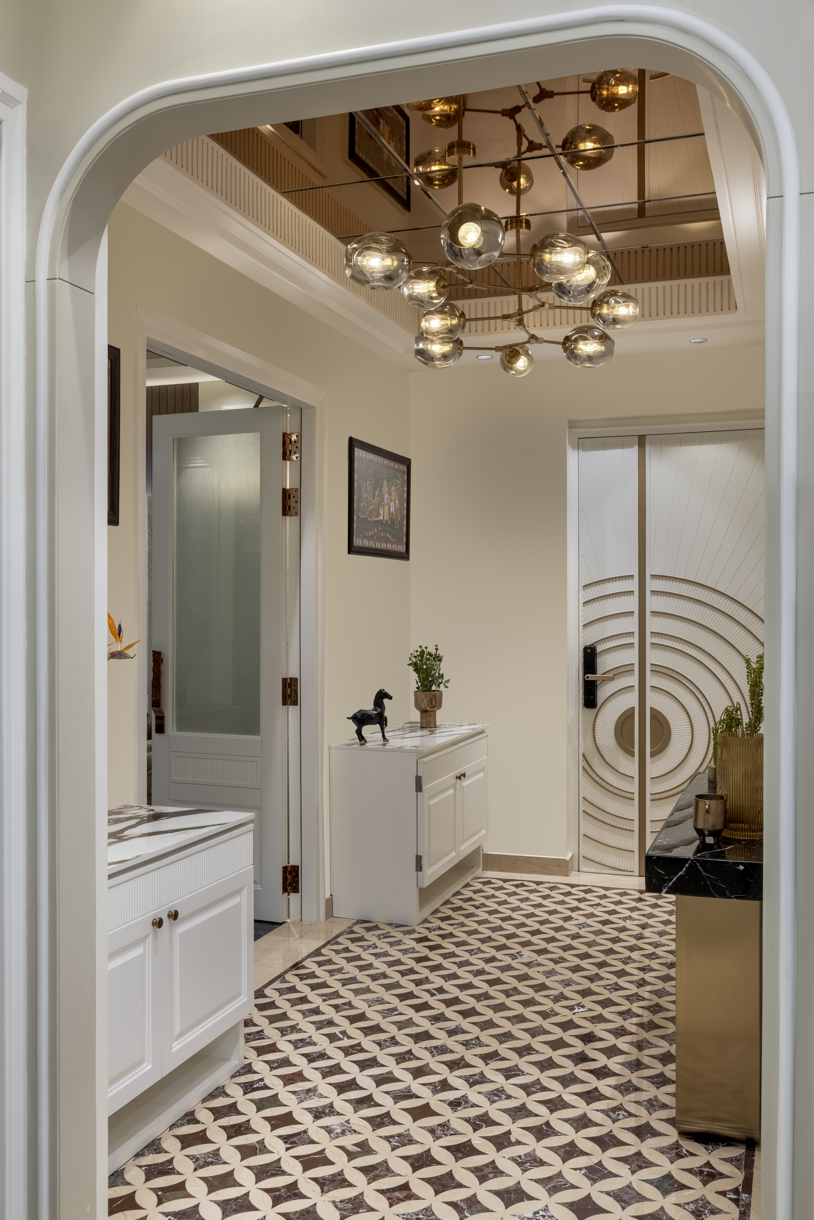 The entrance foyer establishes an immediate sense of refinement. While the base beige marble flooring was originally provided by the builder, it is elevated through a custom Lavante marble inlay that adds sophistication and visual rhythm. Integrated wall panelling conceals the shoe storage seamlessly, maintaining a clean and composed first impression. A hand-painted mural introduces an artistic focal point, while the mirror-finished ceiling reflects the patterned floor below, enhancing both light and spatial volume. Carefully selected statement lighting completes the foyer, creating a sense of arrival that feels understated yet impactful.