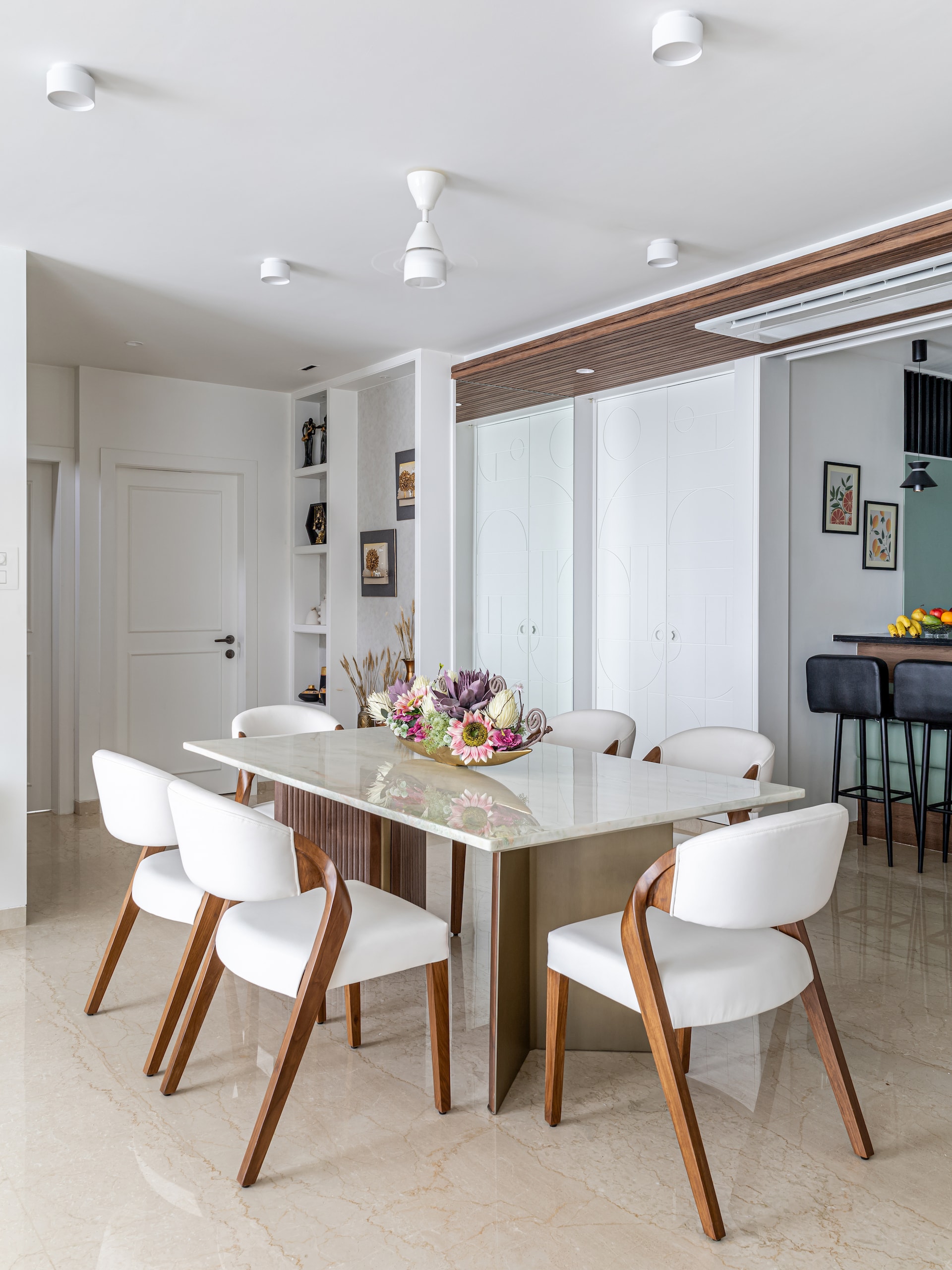 Adjacent to the kitchen, the dining area is distinguished by an exquisite onyx tabletop paired with sleek ivory chairs, fostering a sophisticated yet inviting ambiance for family gatherings. Complementing this space is a custom-designed bar unit featuring CNC-cut shutters finished in PU, infusing a luxurious touch that enhances the overall aesthetic and elevates the entertaining experience.