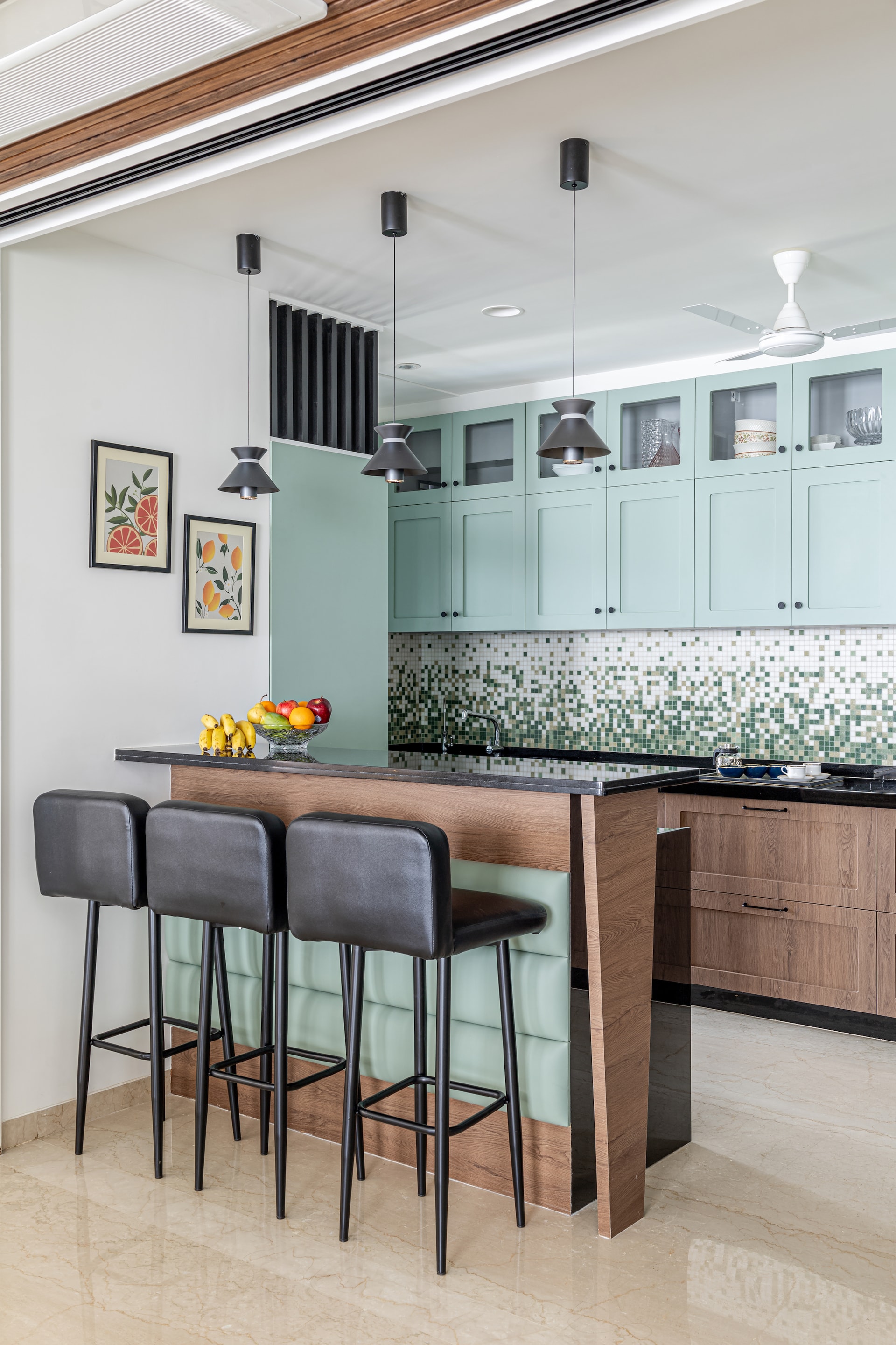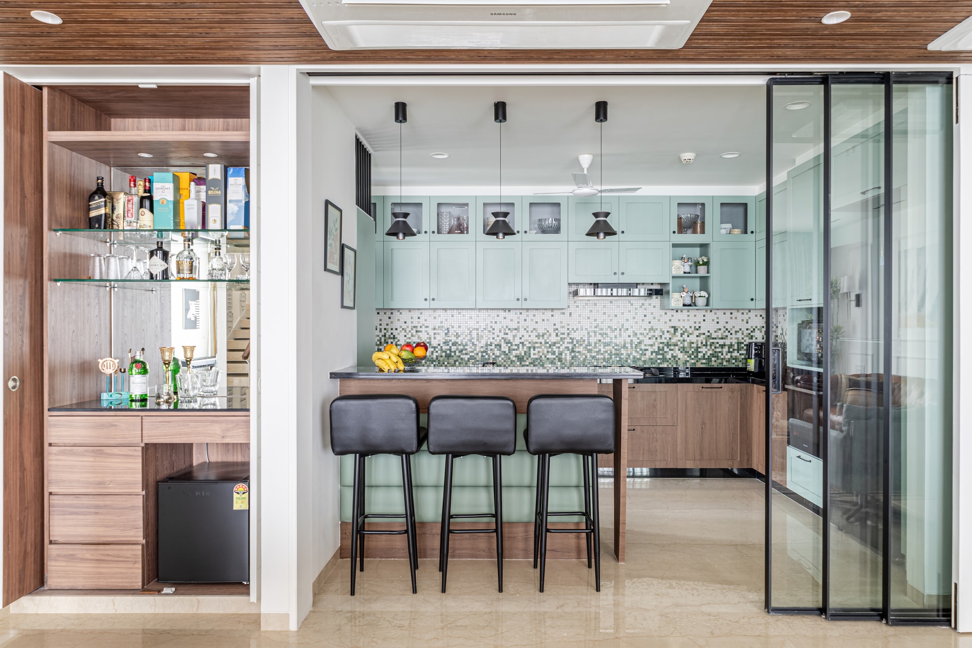 The shaker-style kitchen is a stunning focal point, showcasing a sophisticated blend of sage green cabinetry, wooden-texture laminates, and a striking Bisazza glass tile backsplash. Designed with modern living in mind, the kitchen seamlessly flows into a breakfast counter, creating a casual yet elegant space perfect for morning routines. Glass sliding shutters enhance the sense of openness while providing effective noise control, ensuring a peaceful cooking environment. The minimalist design of the kitchen masks its impressive functionality, with ample storage solutions and thoughtful details that transform everyday use into a delightful experience.
