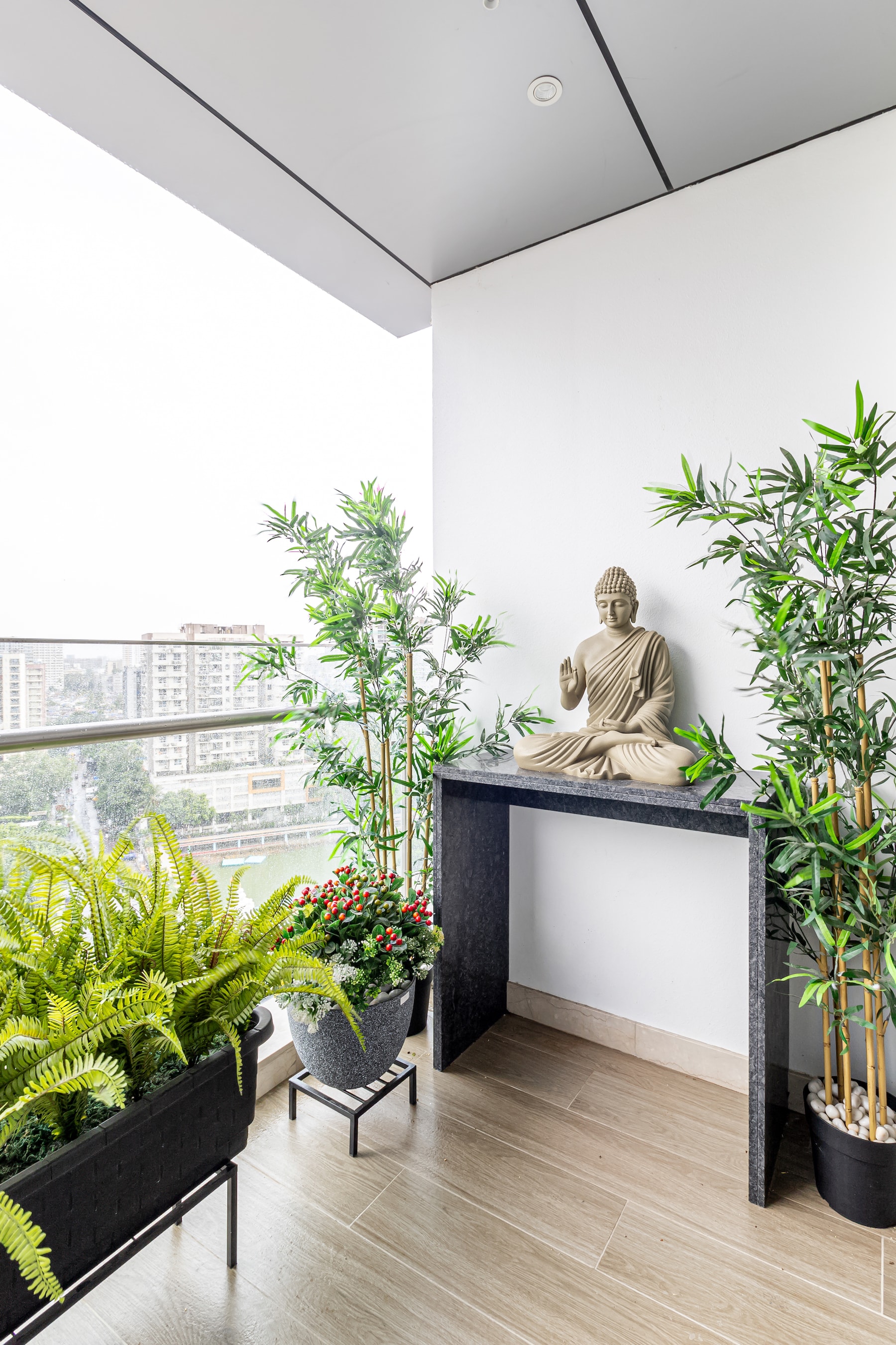 The balcony extends the home’s tranquility into the outdoors. A sleek granite counter adorned with a Buddha statue brings a sense of calm, while an area dedicated to the family’s African parrot ensures their feathered companion has a comfortable perch. Lush plants complete the space, creating a refreshing, natural retreat amidst the urban landscape.