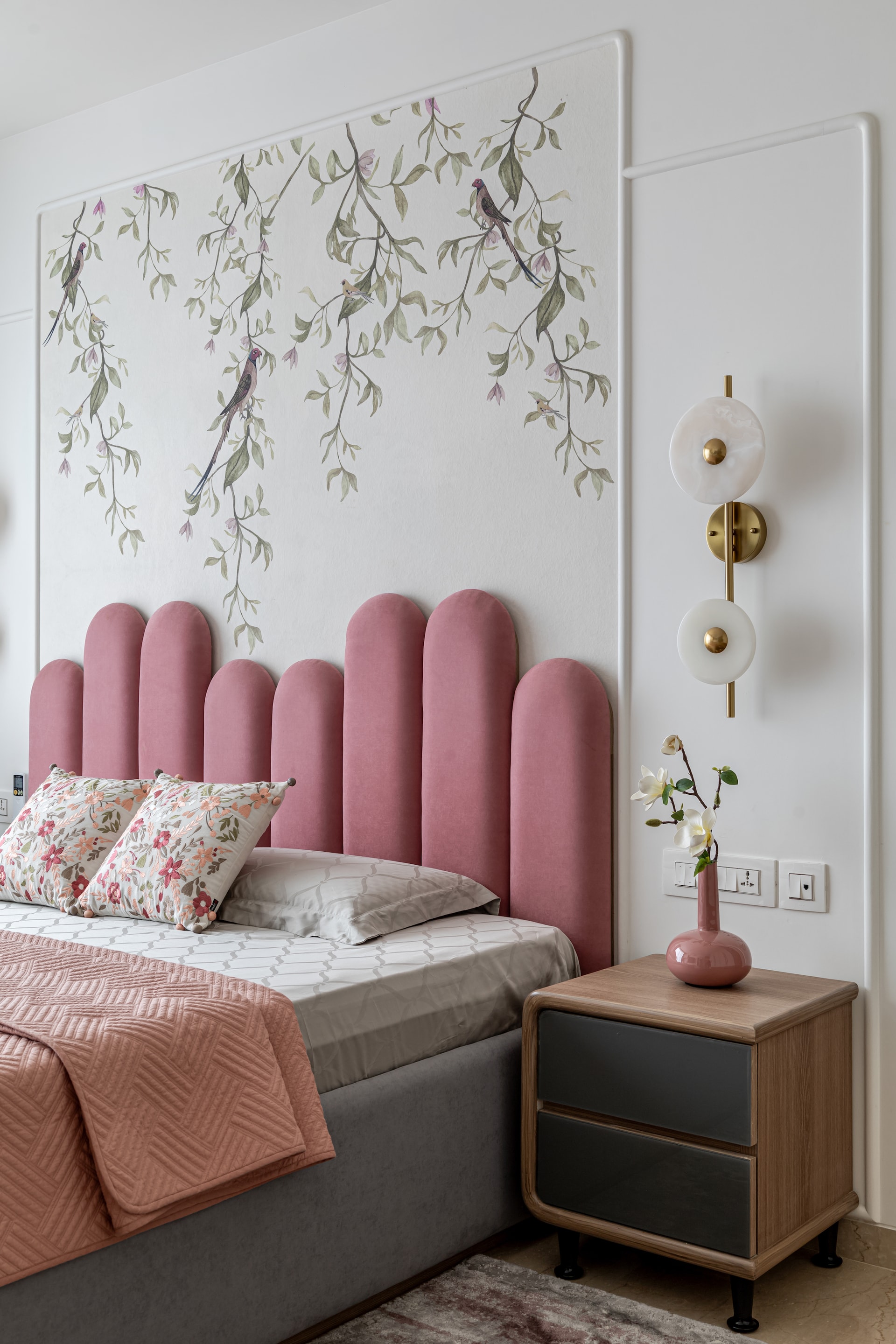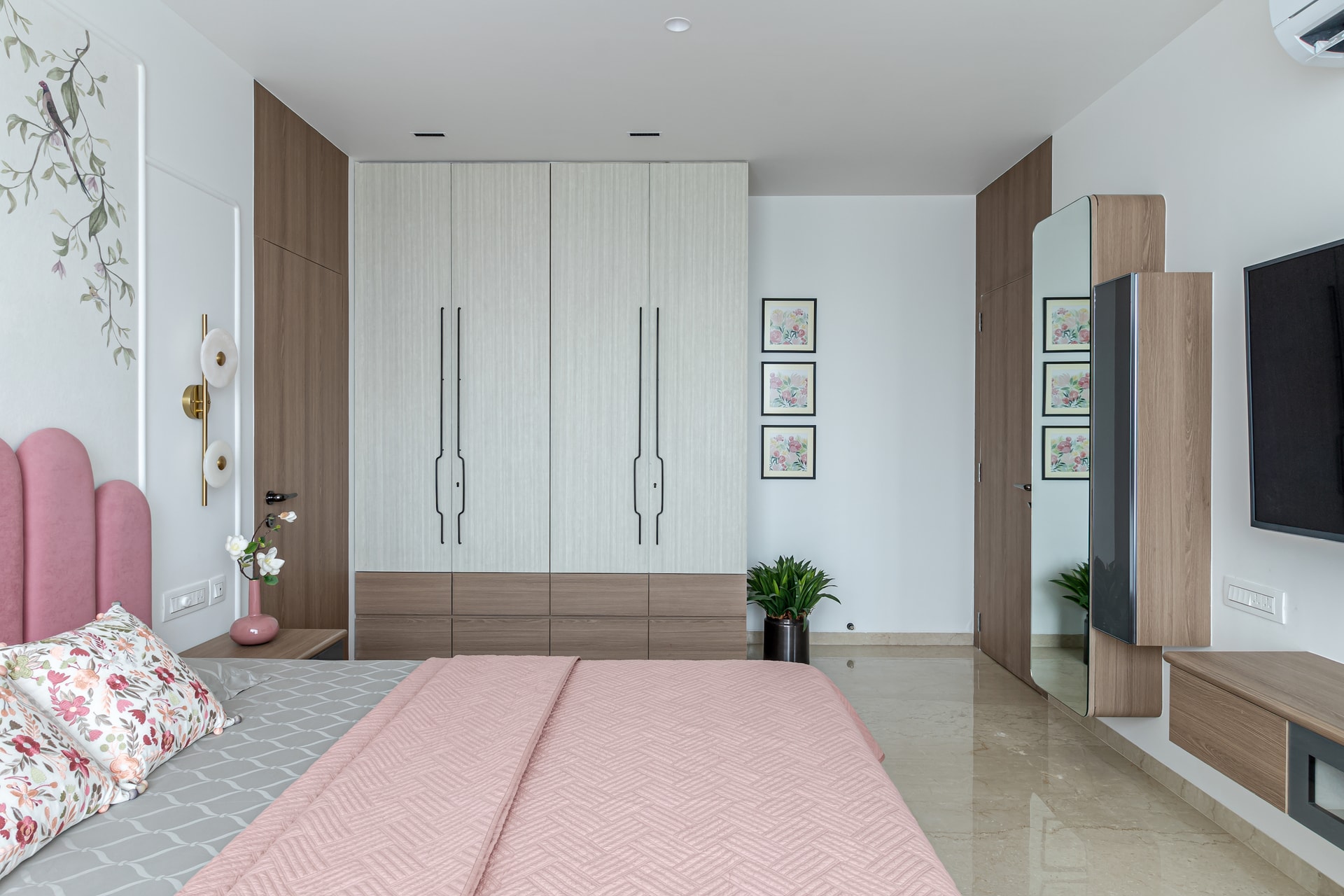 In contrast, the daughter’s room embraces a soft, serene palette, with accents of blush pink, warm grey, and natural wood tones. A delicate wallpaper adds sophistication, while the room’s furniture—a sleek study table and a storage-friendly dressing unit—balances playfulness with practicality.