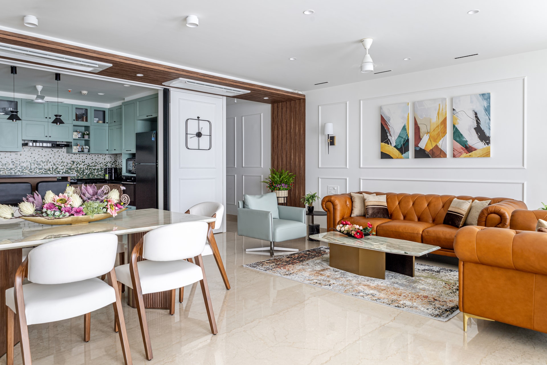 With natural light pouring in from expansive south- and west-facing windows, the design maximises brightness while ensuring a seamless flow between the living, dining, and kitchen areas. The entrance, defined by a walnut-veneered door with teakwood handles, sets an inviting tone that immediately hints at the understated luxury found within.