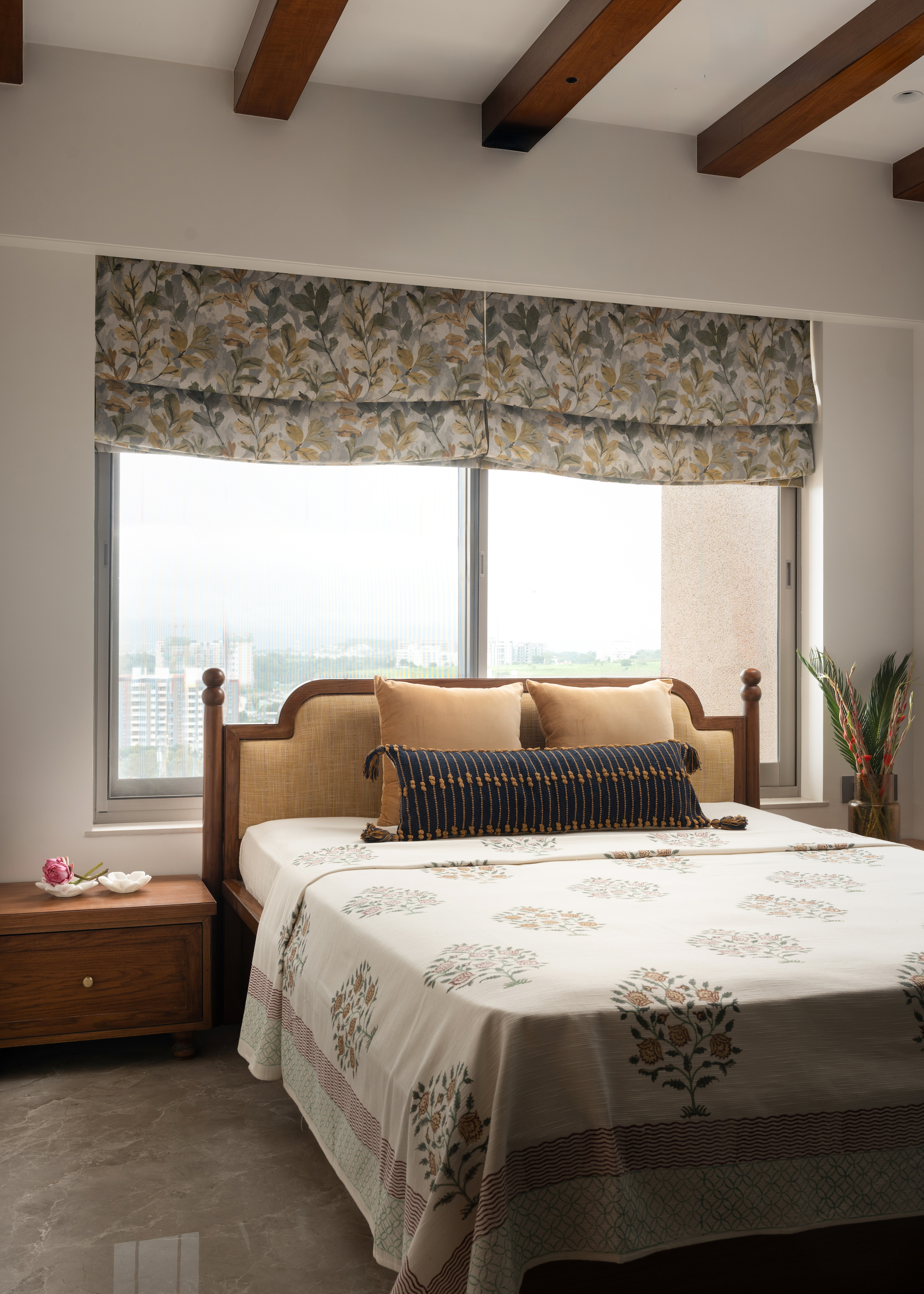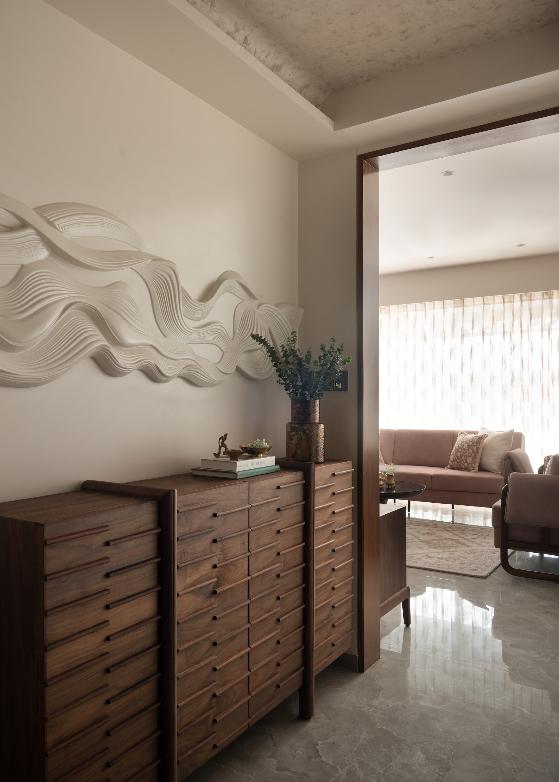 Materiality becomes the narrative thread that binds the home. Teak veneer, walnut finishes, brass accents, and curated textiles create a tactile vocabulary that feels authentic and grounded. The journey begins at the foyer where a sculpted wall detail, wooden console, and glimmering glass bead ceiling set a tone of subtle craftsmanship. Moving inward, the residence opens into fluid living and dining spaces anchored by the handcrafted wooden swing designed with a swivel back that reorients between the two zones. More than furniture, it becomes an emotional centrepiece that brings nostalgia into everyday moments.