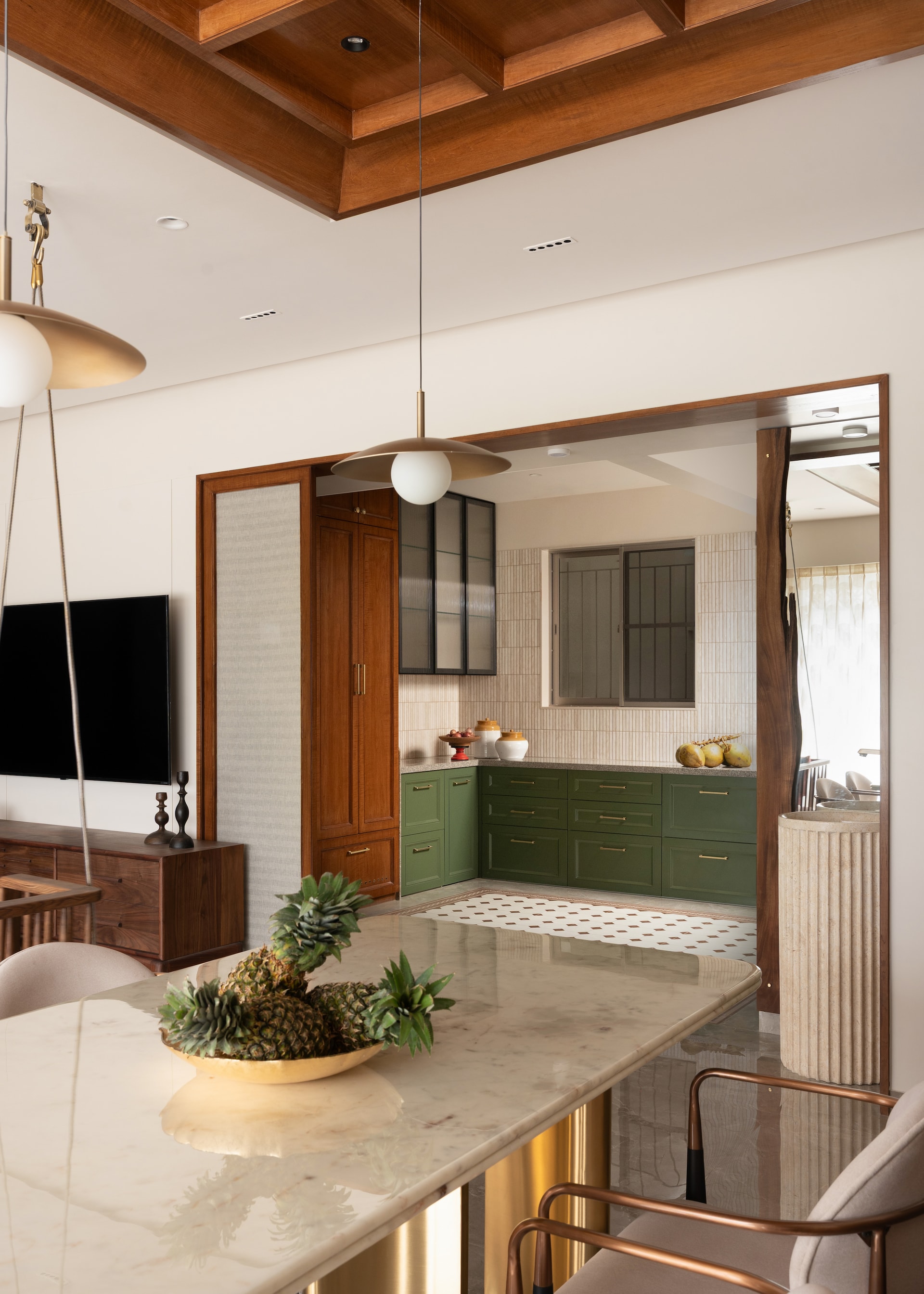 Modern functionality and heritage inspired elements coexist seamlessly. The marble and brass dining ensemble exudes elegance without excess. The mandir, lined in a striking red interior, becomes a quiet moment of pause. The kitchen, with patterned flooring, clean forms, and warm finishes, balances precision and personality.
