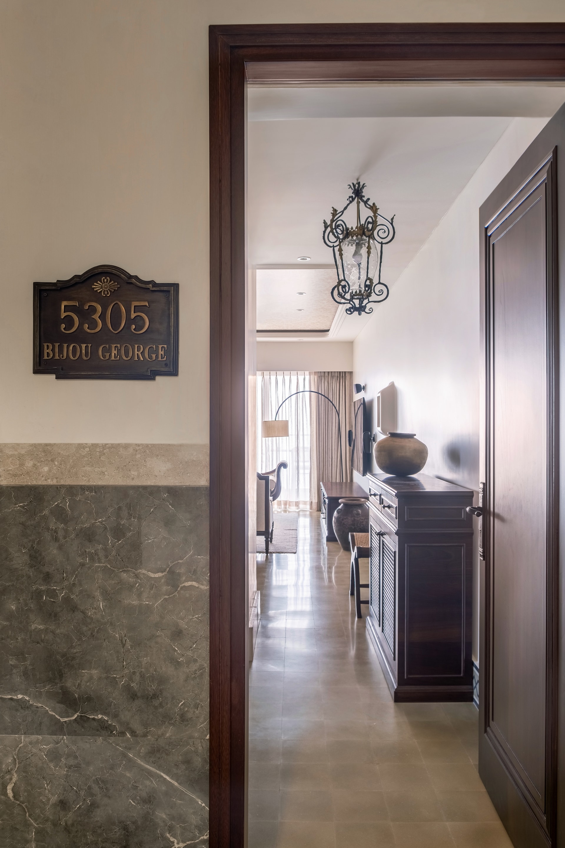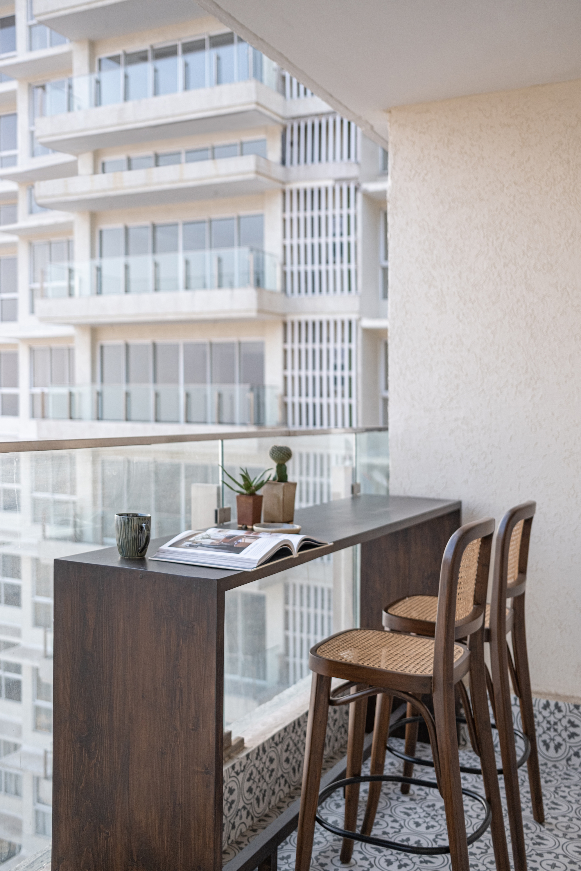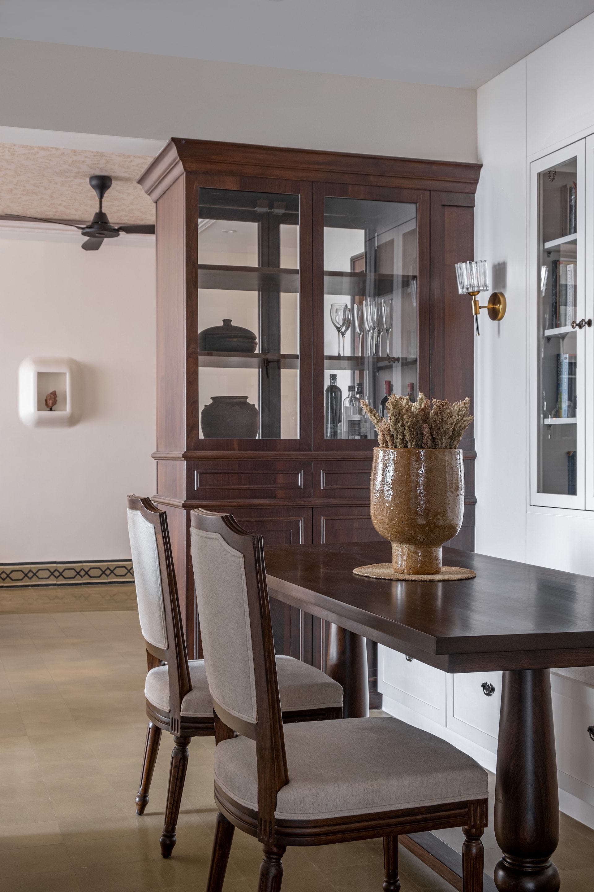 The inception of Vintage Vista was driven by homeowner Bijou George’s desire to transform his newly purchased apartment into a home that exudes warmth, character, and a sense of place. George, a financial writer and former hedge fund professional found the original finish of the apartment uninspiring. He sought a space that would reflect his passion for vintage aesthetics while maximising the apartment’s intrinsic advantages, such as its prime location and stunning views. The design inspiration for Vintage Vista was deeply rooted in the artisanal heritage of South India, particularly the Chettinad architecture known for its intricate detailing and use of traditional materials. Each design element was carefully chosen to pay homage to the past while ensuring a harmonious flow of textures and colours throughout the home.