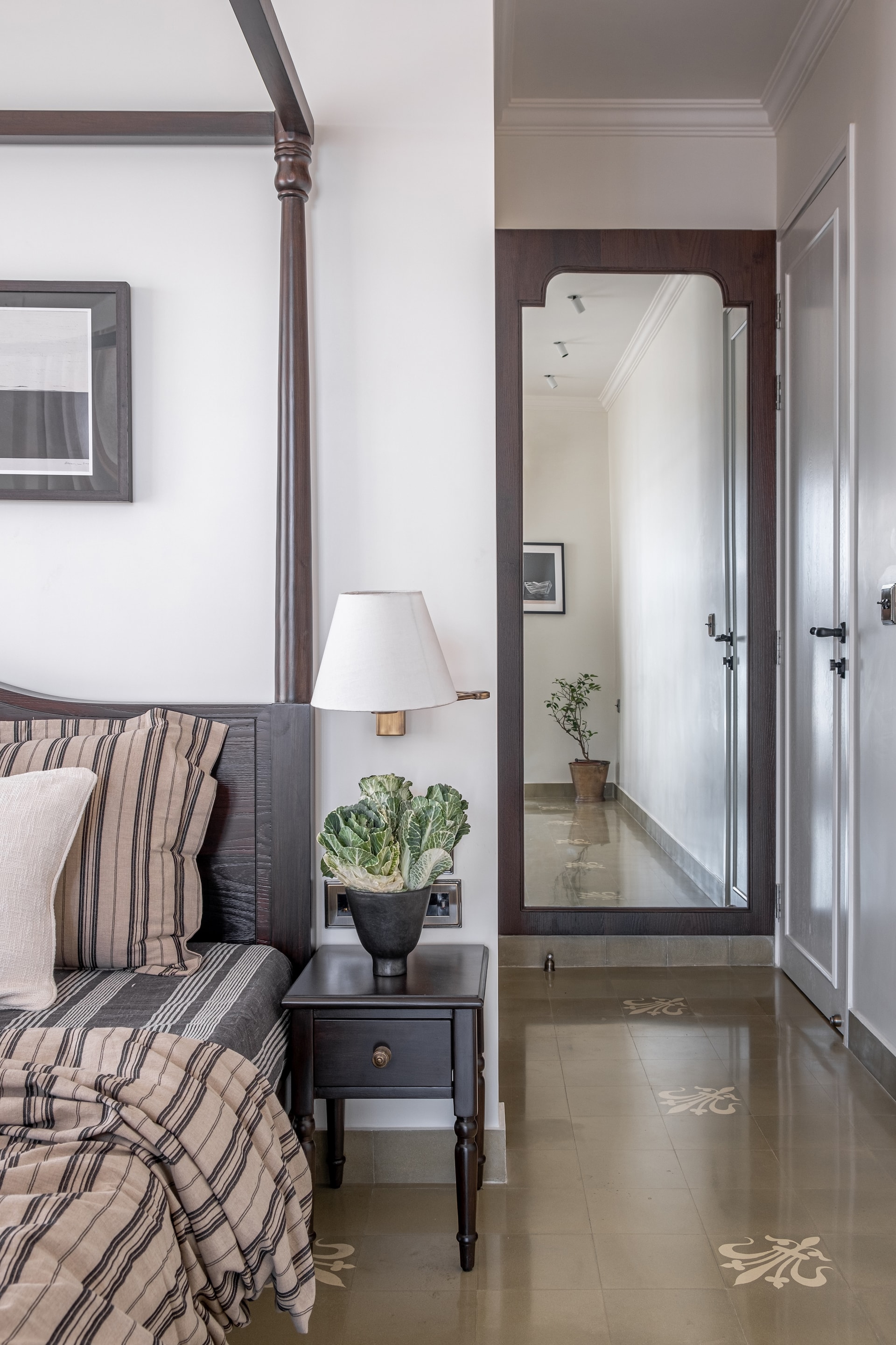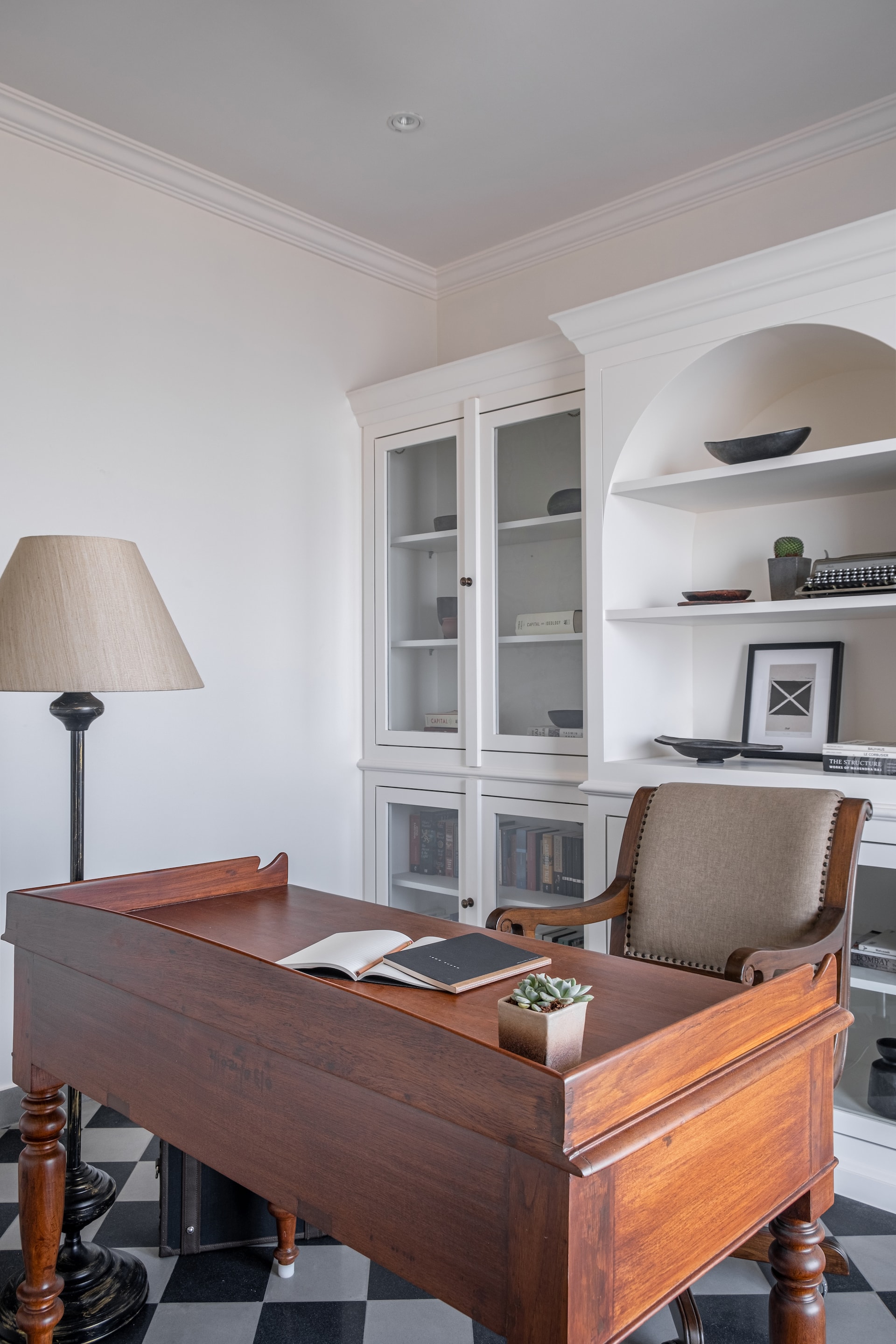 The transformation of Vintage Vista involved a thoughtful resolution of each space to meet the client’s needs both functionally and aesthetically. The master bedroom was designed to offer a serene view of the sea from the four-poster bed, with minimal clutter to emphasise the natural beauty outside. The adjacent study features a desk positioned to avoid screen glare while offering a sea view, and a massive bookshelf that serves as a backdrop for virtual meetings. This room shows us the client’s intellectual pursuits, providing a space that encourages creativity and productivity.