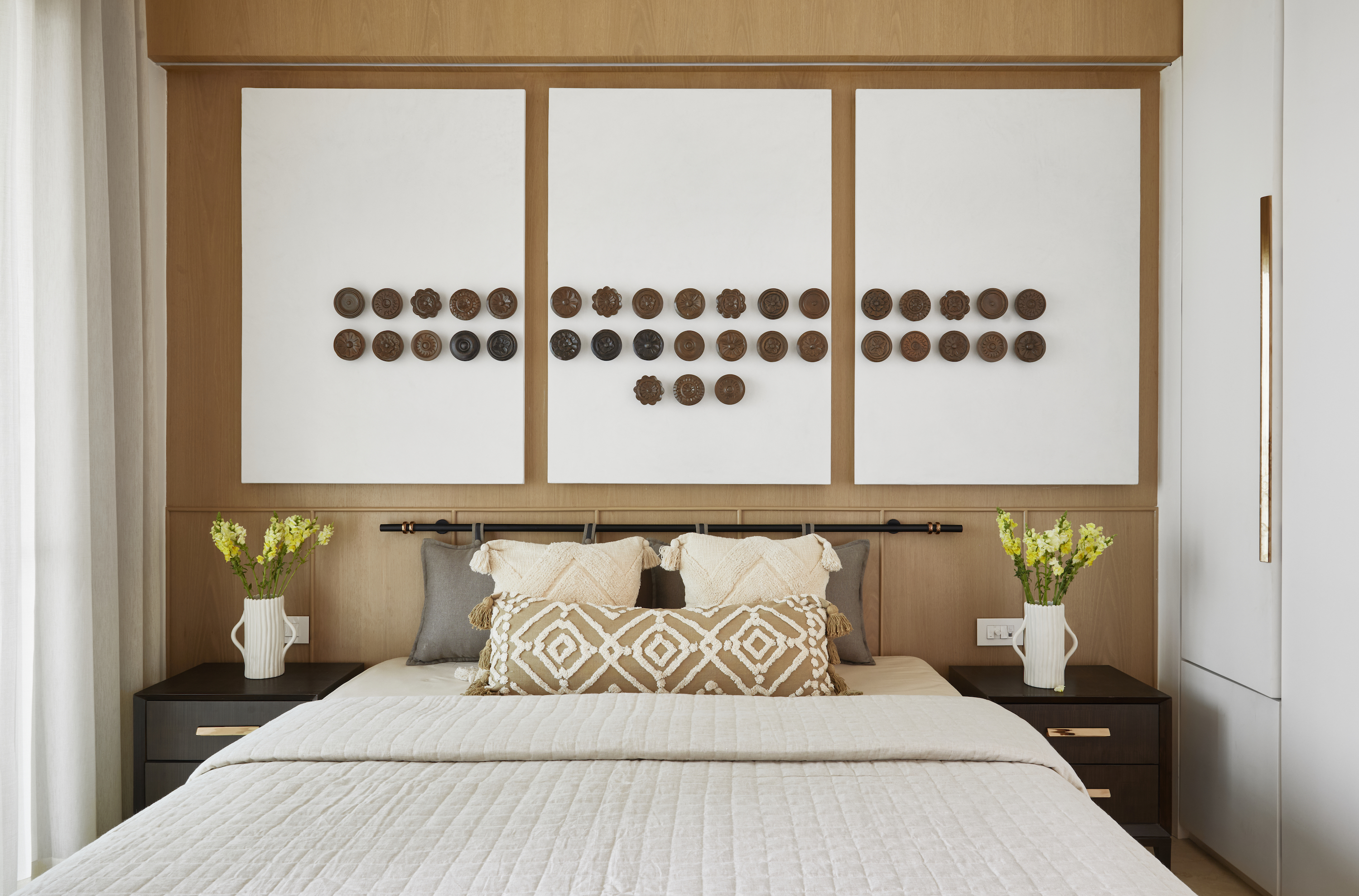 Each bedroom reflects individual preferences while adhering to the overall design concept. The son’s bedroom features his favorite characters and a color scheme of blue, greys, and yellows. The daughter’s room, designed with a chic and edgy atmosphere, incorporates blacks, greys, and blues, with arches as a dominant feature. The parents’ bedroom maintains a minimalist aesthetic with simple white wardrobes and a custom-made metal rod with hanging pillows as the bed wall’s highlight.