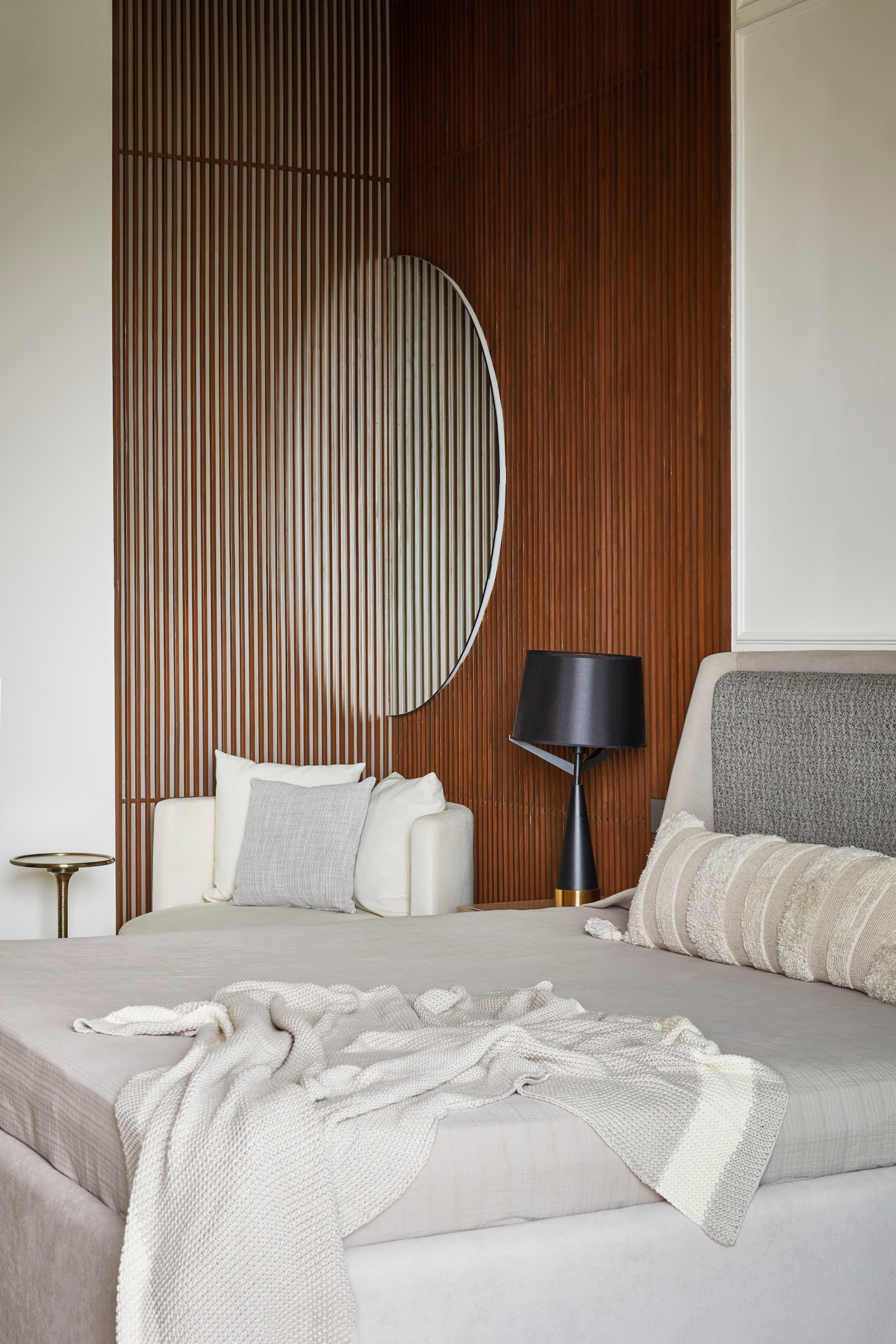 The master bedroom boasts a walk-in area, slatted walnut wood paneling, herringbone-style wood flooring, and mirrored shutters concealing storage, contributing to an elegant and cohesive space.