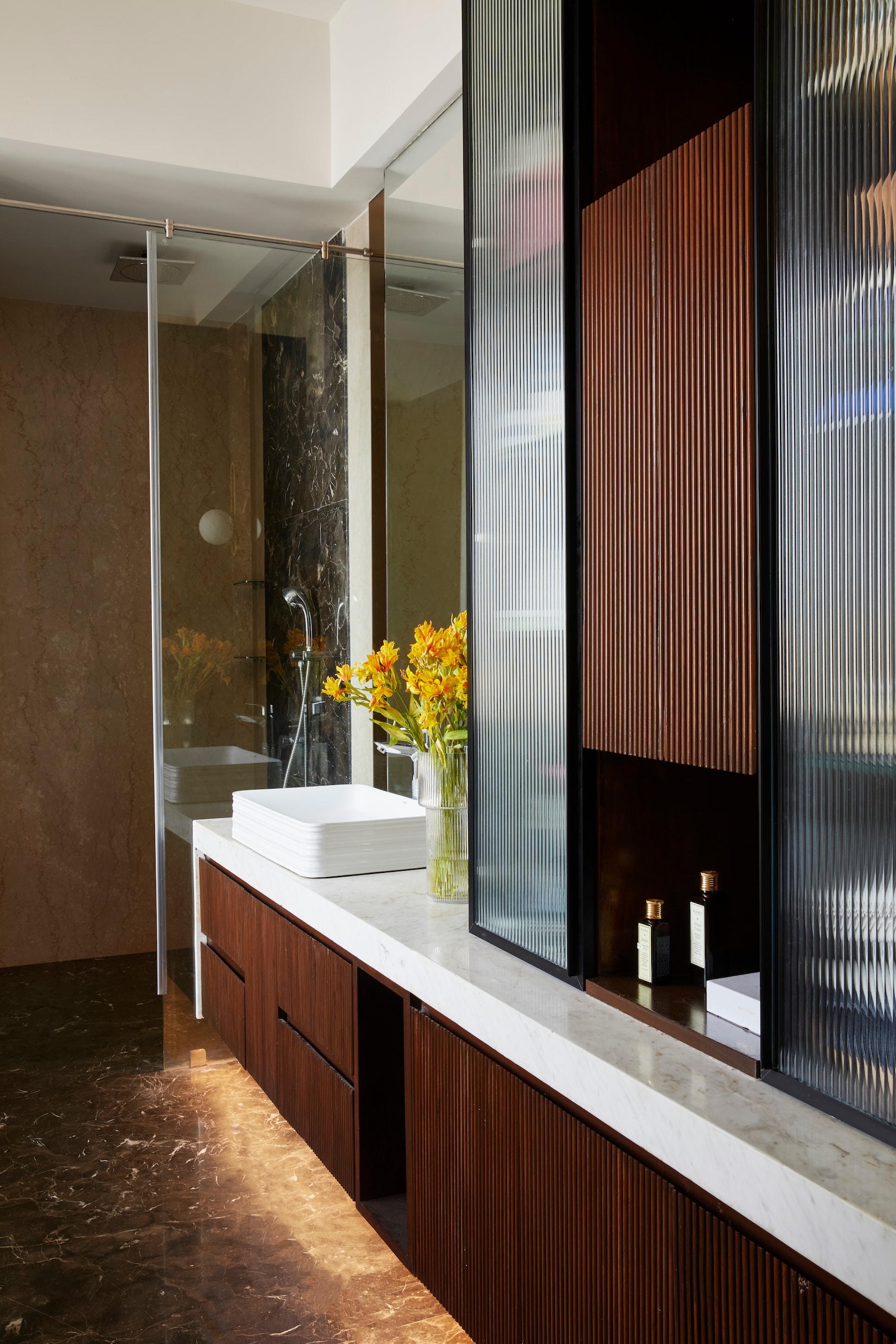 A reinterpretation of the mandir jali design creates a privacy screen between the entry and living space, while light-coloured furnishings maintain a fresh, airy ambiance. The mandir area was reconfigured to include a study corner, separated by a laser-cut wood panel jali adorned with brass bells. The passage, with its 38-foot length, features a dramatic chevron pattern with marble inlays, adding visual interest. The powder bathroom was revamped with honed finish terrazzo walls, a black marble portal, and a pedestal wooden basin to create a chic, character-filled space.