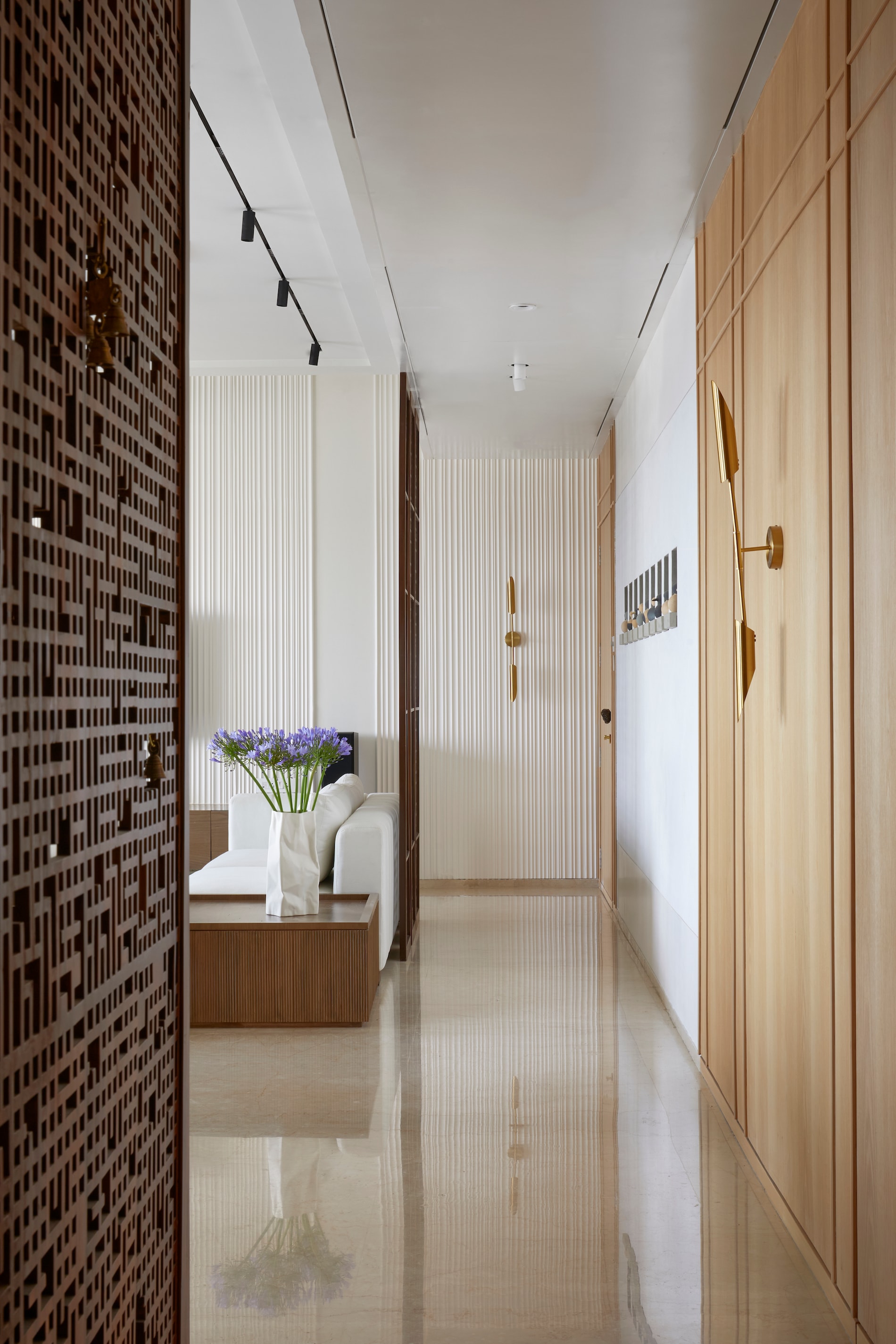 The design narrative emphasizes a clutter-free, visually elongated concept with a neutral-toned palette, creating a light and airy ambiance. Intricate detailing on functional elements and the use of textural elements add visual interest. The apartment’s standard doors were modified to 9 feet in height, featuring flushed door detailing and paneling to accentuate the 11-foot ceilings, contributing to a grander and more spacious feel.