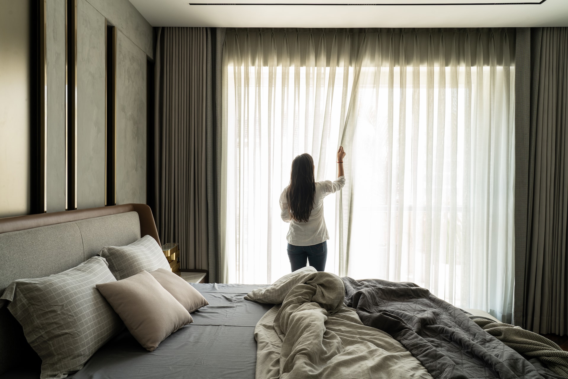 Moving further into the home, we find the heart of the residence—the living and dining room—where natural light pours through expansive windows, enveloping the contemporary furniture and accent walls. Veneer and marble panelling add a touch of sophistication to the sitting area, with a refined beige and blue colour scheme. The dining space features white concrete fluted panels that beautifully complement the marble-topped dining table and grey chairs.