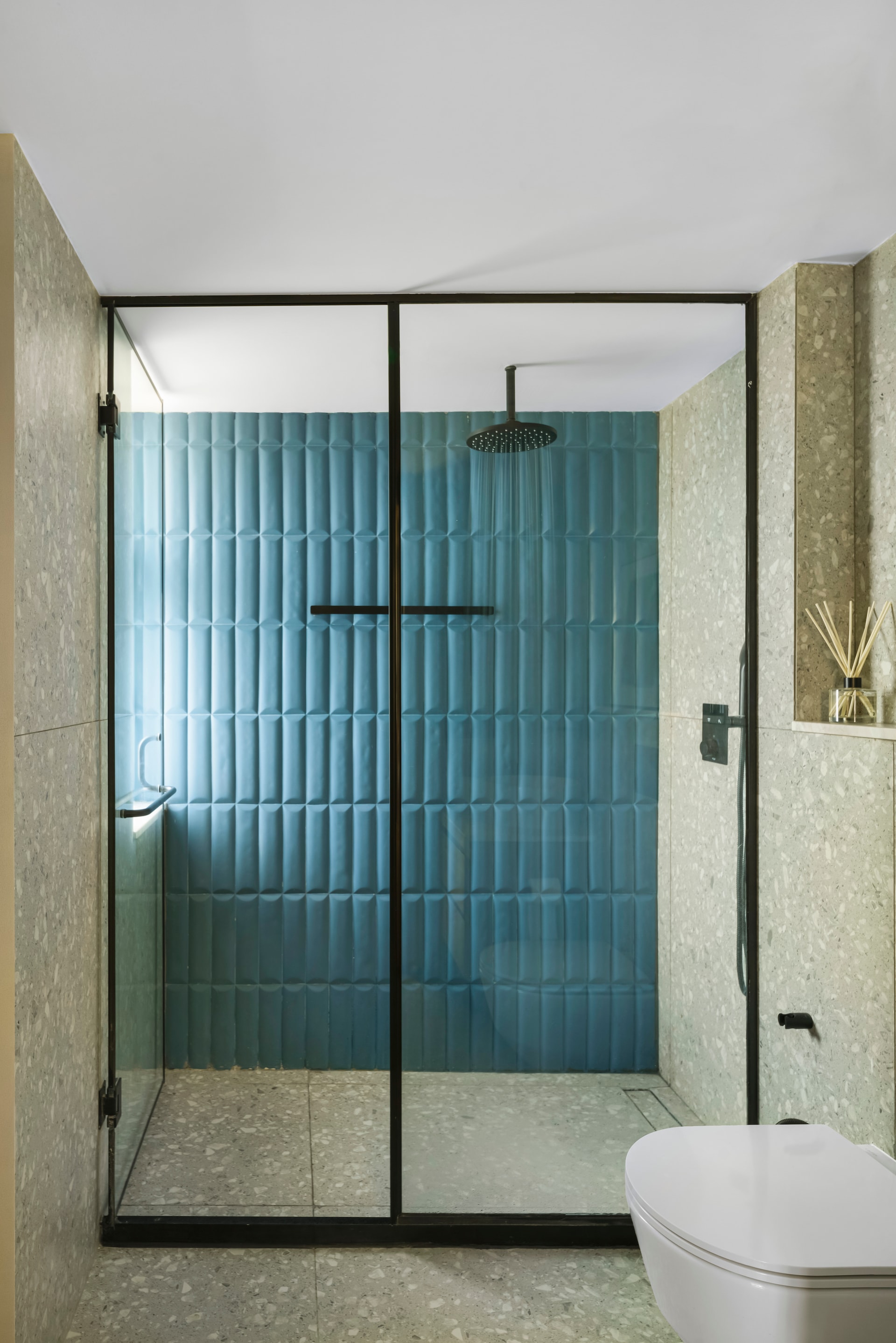 Adjacent to the mother’s bedroom, we find the study, where symmetry takes centre stage in the wall-length bookshelf, finished in veneer and adorned with brown-tinted glass shutters. The en-suite washroom showcases a unique interplay of grey terrazzo and blue subway accent tiles. And finally, the master bedroom captivates with its intricate bed back panelling, painted in dark grey textured tones and highlighted with antique gold metal profiles. A charcoal grey and black colour palette reign supreme in the room, while the warmth of wooden flooring and a luxurious tan leatherette finished bed add an understated luxury. The lavish en-suite bathroom boasts three sets of wardrobes and features double vanity mirrors mounted on sinuously fluted walls, echoing the bedroom’s design elements.