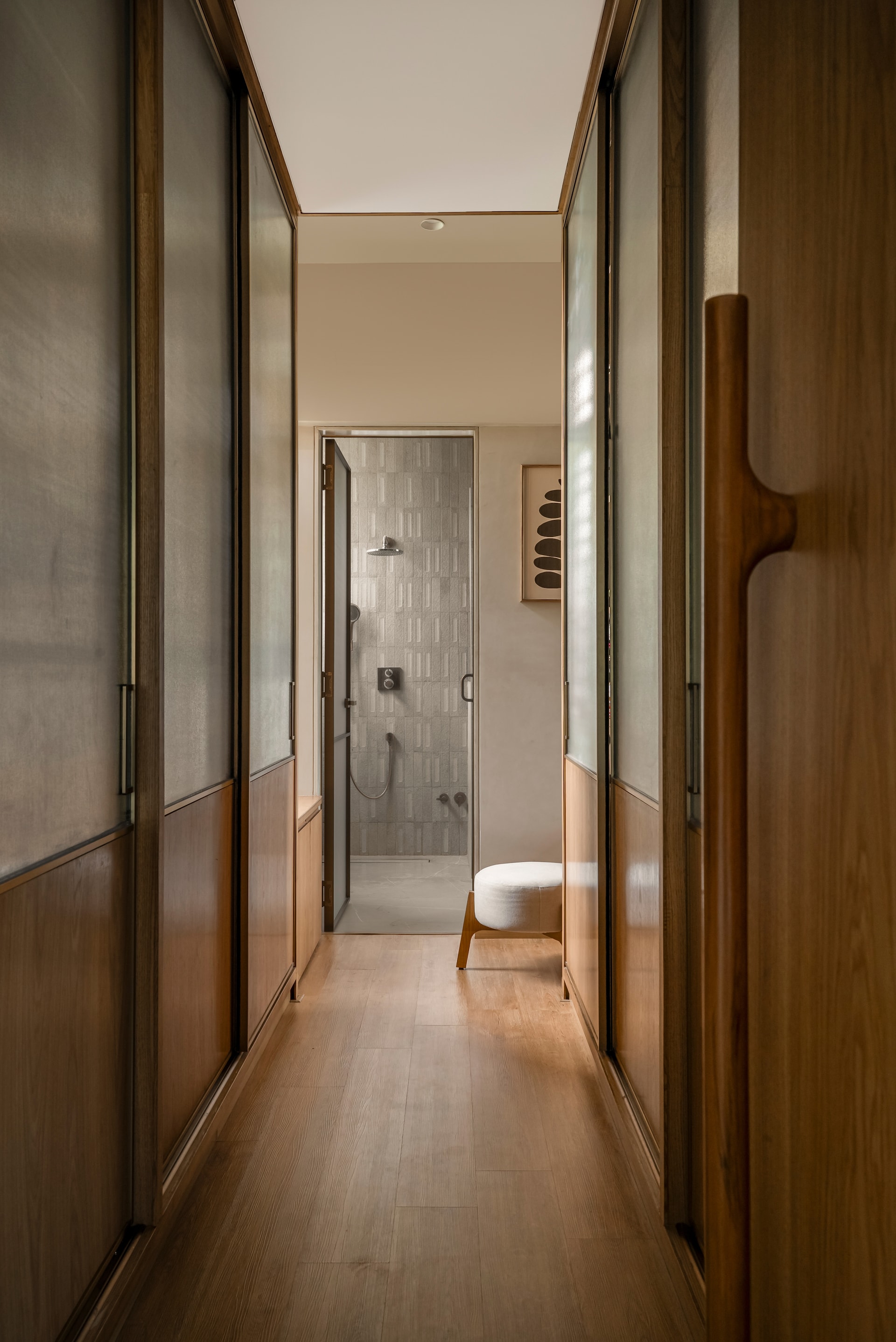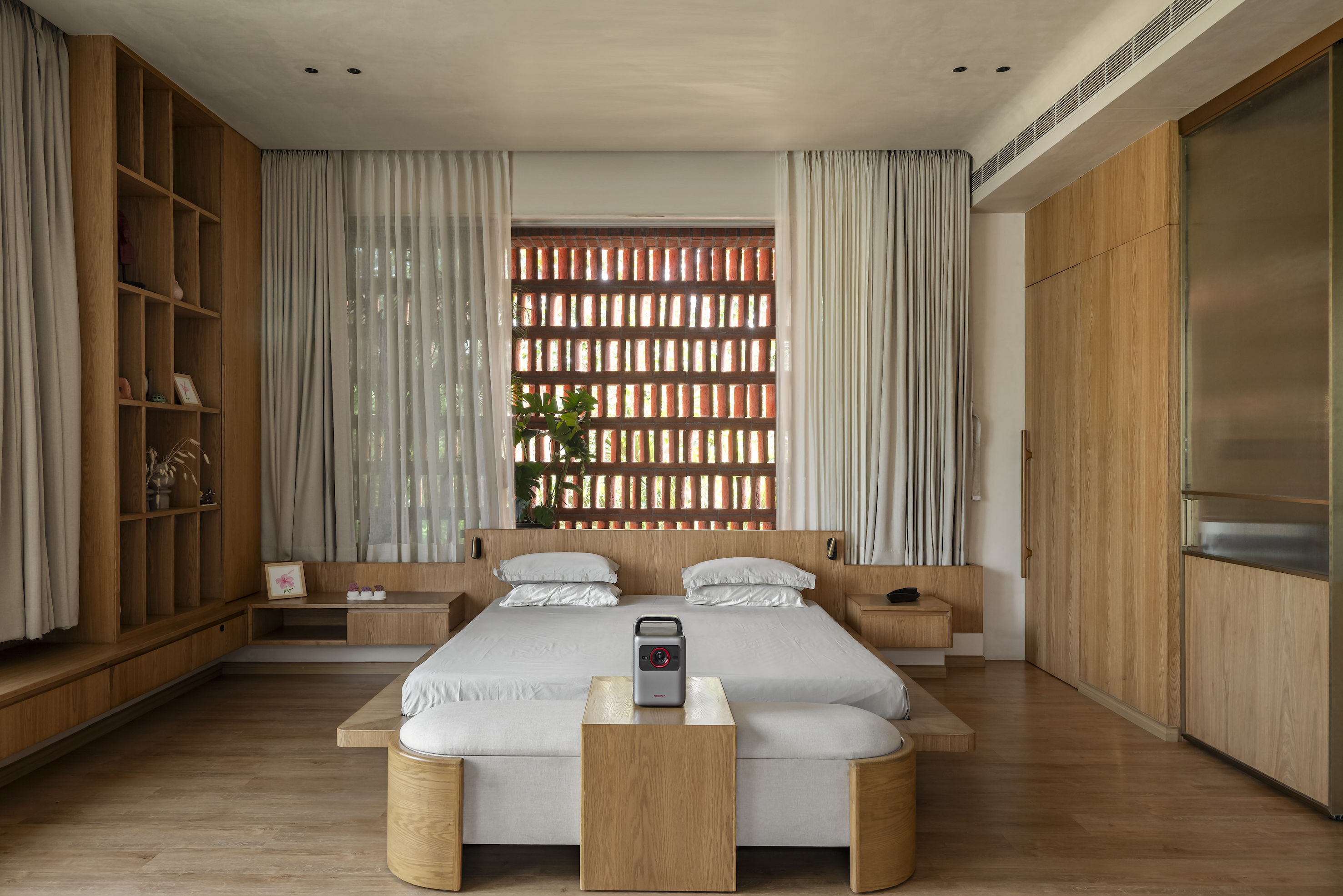 The design brief called for a premium bedroom extension that would remain deeply connected to the outdoors. Orientation became the guiding force, with the east-facing terrace and south-facing bedroom wall shaping the spatial strategy. Large openings, cross-ventilation, and filtered daylight allow the interiors to breathe, creating a constant dialogue between inside and out. Rooted in Japandi aesthetics, the material palette is intentionally restrained—lime-wash plaster, warm wood, natural veneers, and SPC flooring come together to create a soft, tactile environment. Sheer curtains diffuse daylight across the rooms, while rounded bespoke furniture, built-in window seating, and subtly toned fabrics maintain visual lightness. Indigo cyanotype-inspired artwork punctuates the neutral canvas, adding depth without disrupting the overall calm.