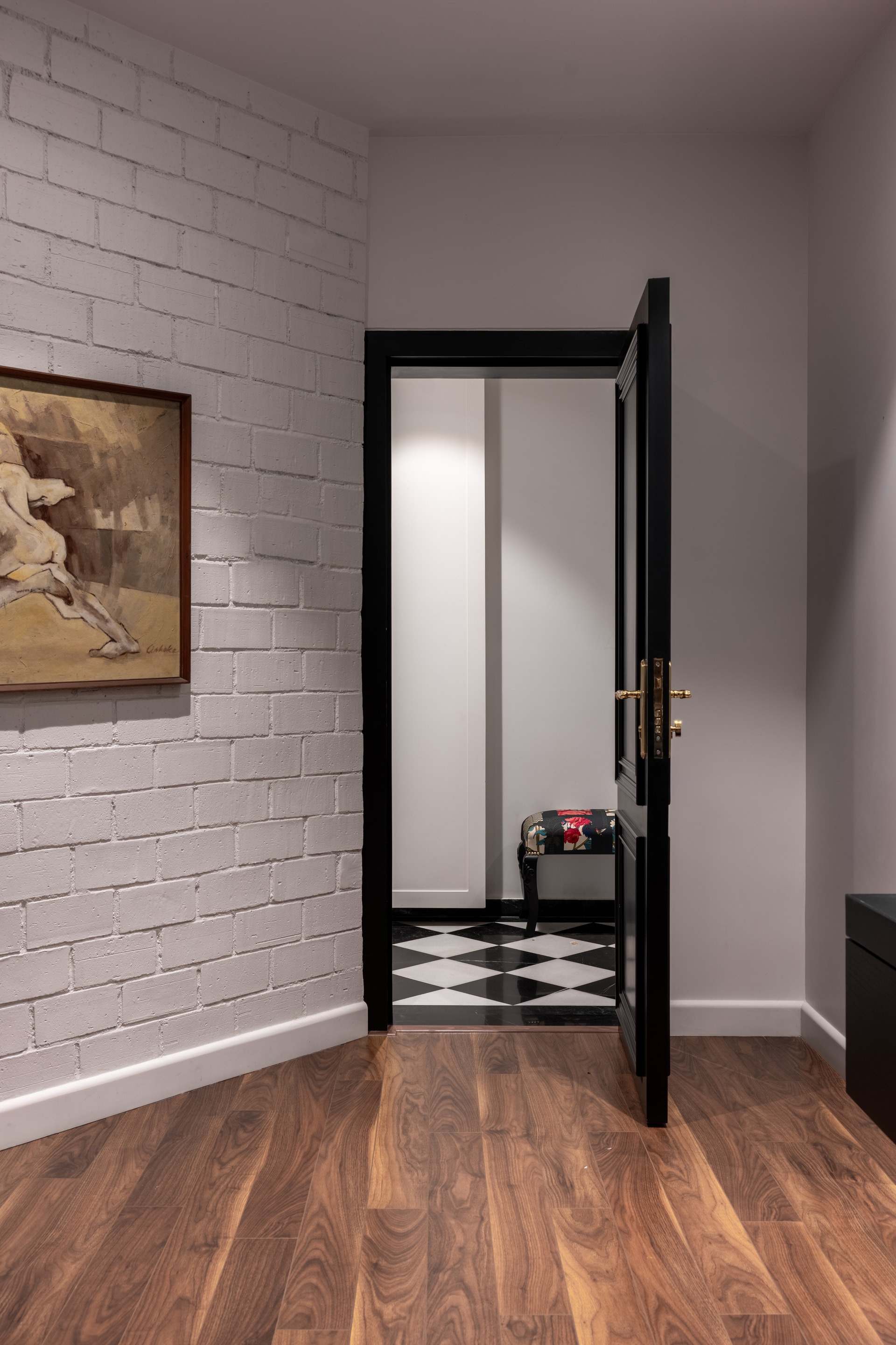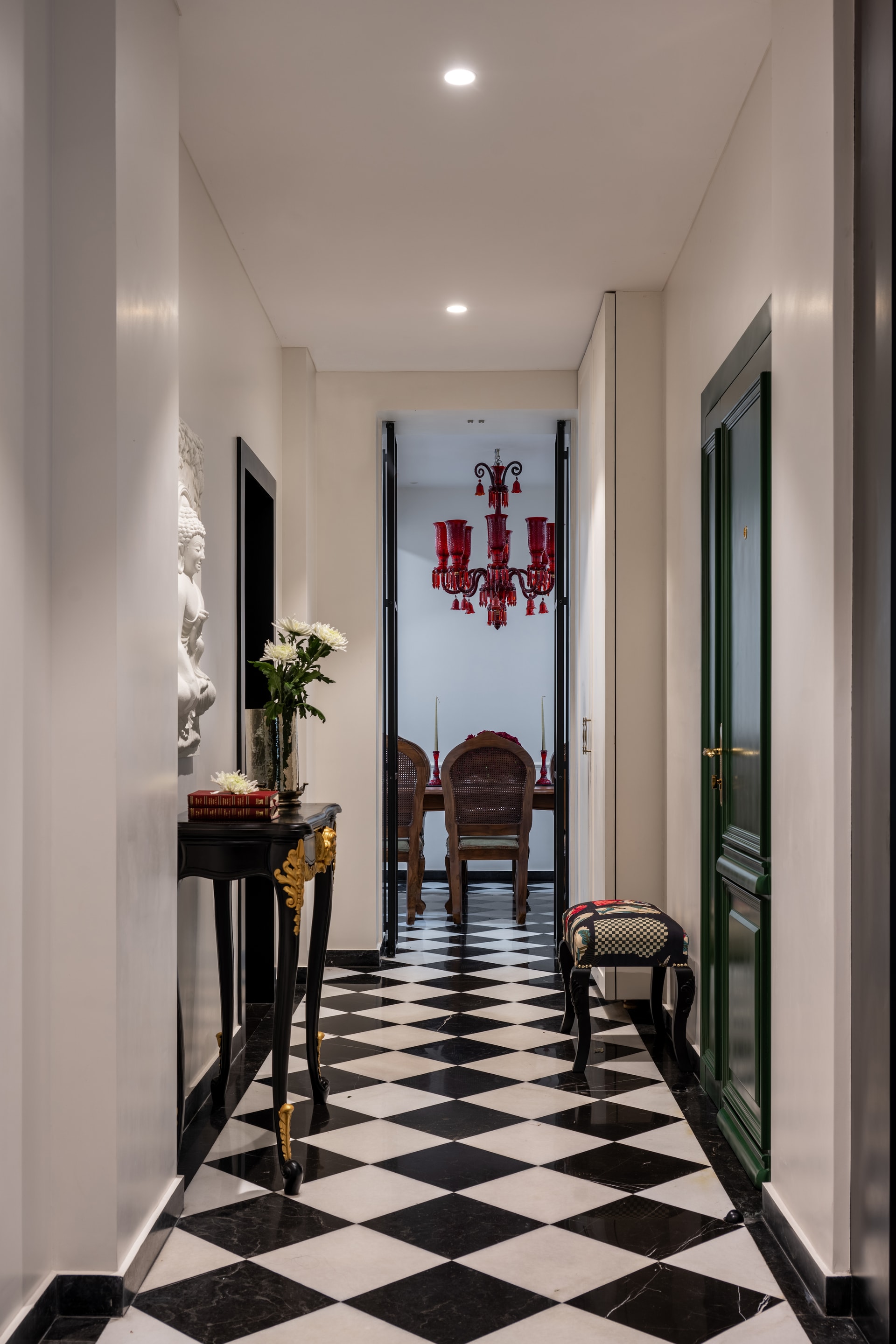 The entryway is dramatic yet restrained—announced by a bold green door that opens into a corridor laid with a chequered black-and-white marble floor, instantly evoking a sense of classical order. The passage is lined with sculptural elements and an ornate console, flanked by a large mirror and another sculpture on the left, creating a visual dialogue between form and reflection. Four black columns frame the corridor in a quiet architectural rhythm, forming an arcade that serves both as a privacy screen and a structural anchor, teasing glimpses of the spaces beyond.