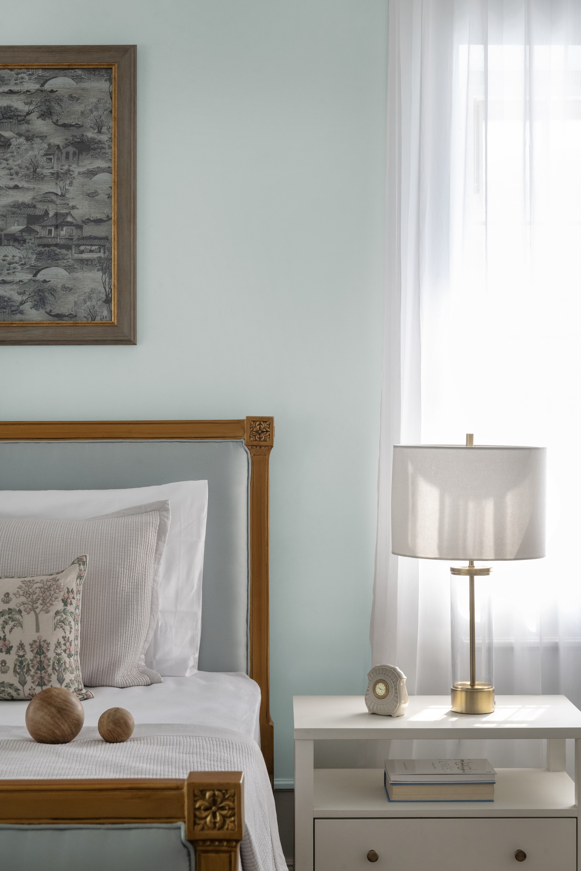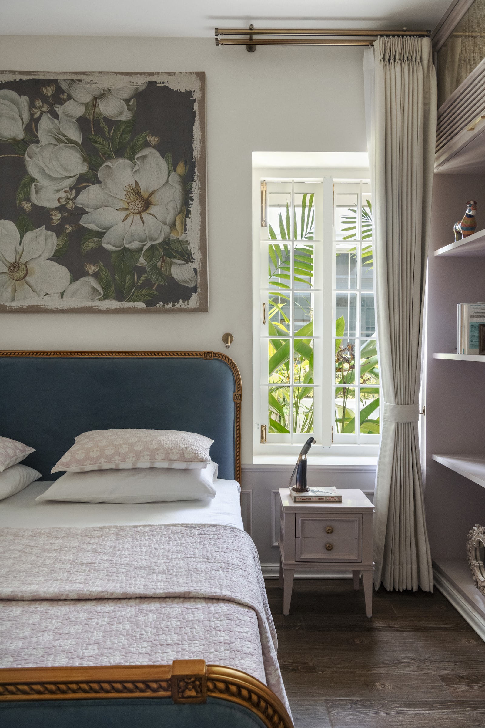 The ground floor guest bedrooms are cozy retreats that embrace a soft pastel palette. One bedroom features a rattan wardrobe accented with lilac paint and anchored by a large artwork, while the headboard showcases subtle, intricate carvings. These details, though understated, command attention, tying the room together with a sense of harmony and tranquility.