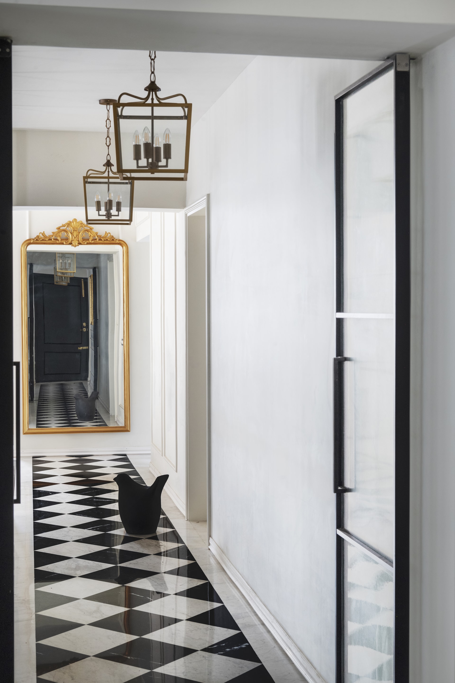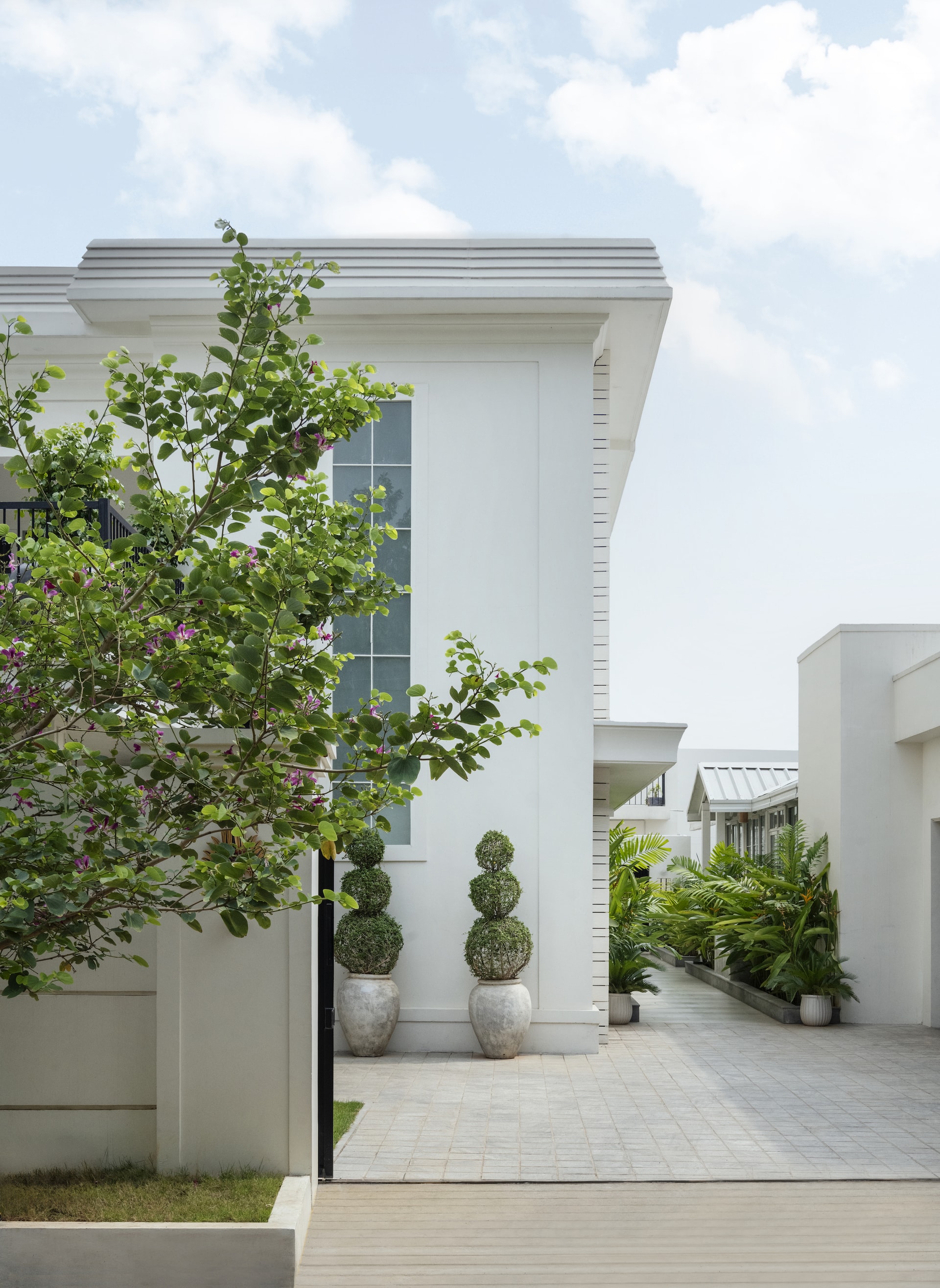 Upon arrival, the villa greets guests with a bright, white façade, serving as a canvas for vibrant Bougainvillea blooms that set a tone of understated sophistication. The entrance patio, with its black and white chequered marble flooring, echoes a classic charm, further enhanced by a brass handrail that guides visitors into the heart of the home. This striking pattern extends into the passageway, creating a seamless transition from the exterior to the interior, where it leads to a French-inspired carved mirror—a focal point that introduces the home’s theme of timeless elegance.