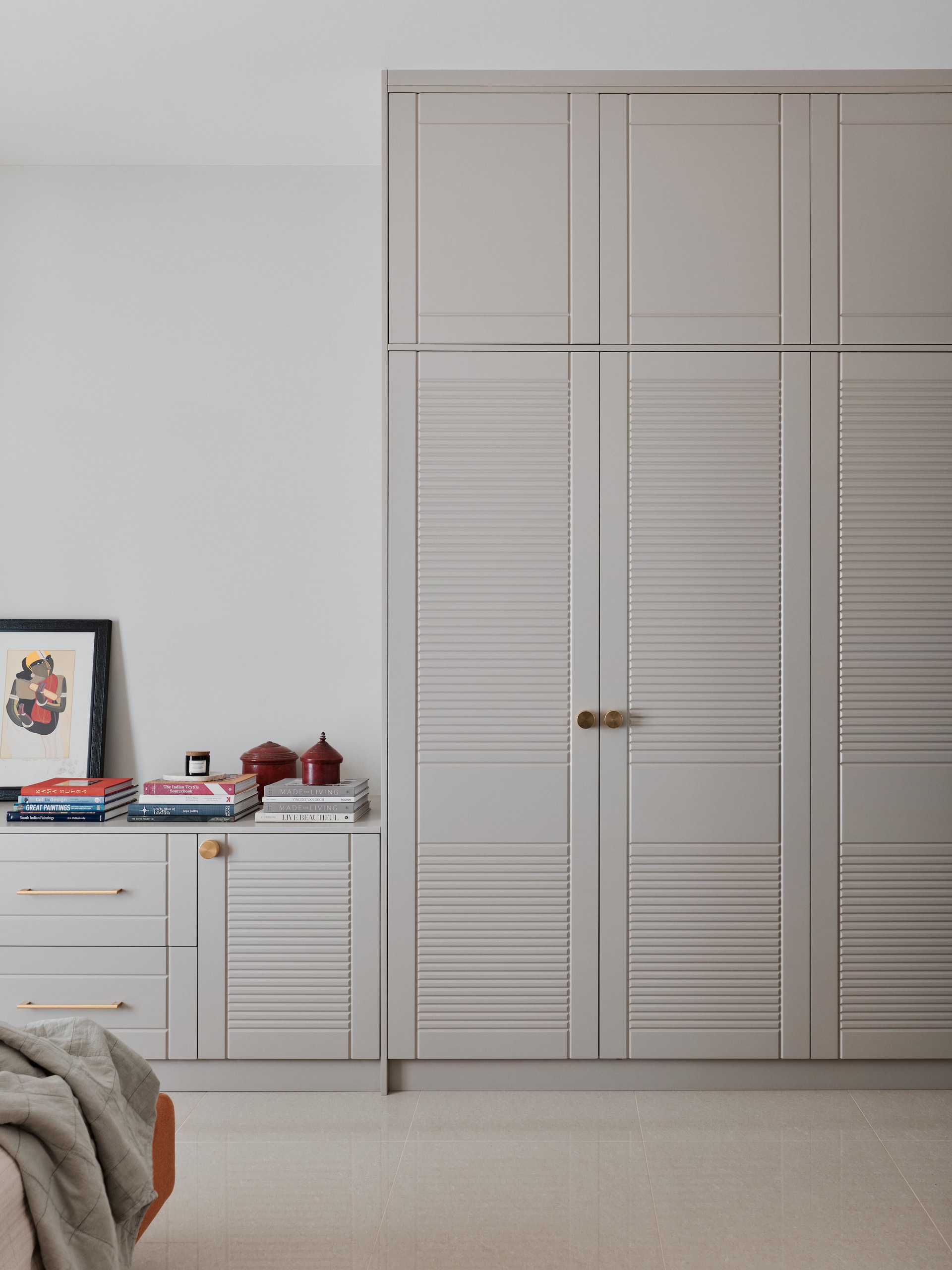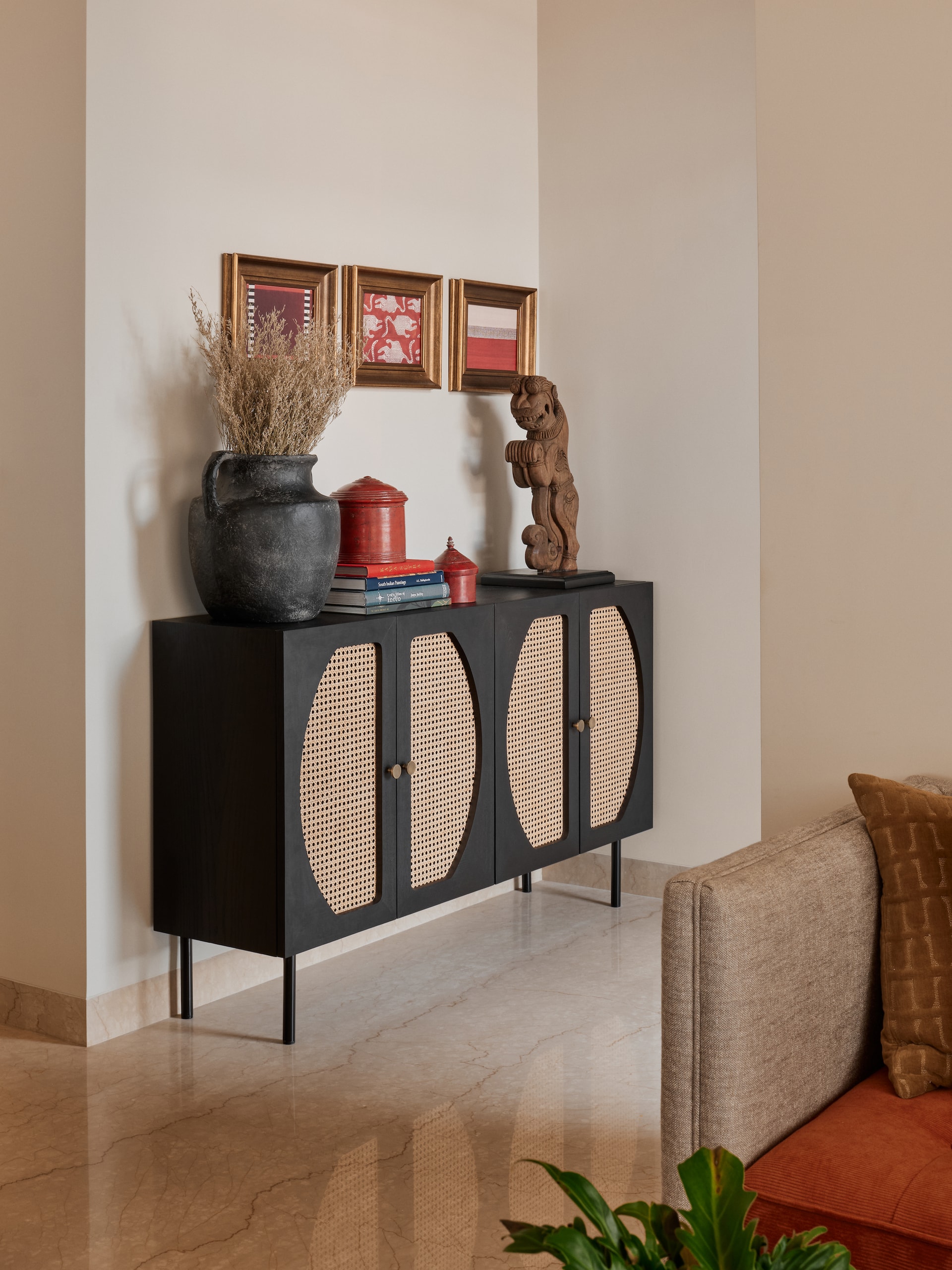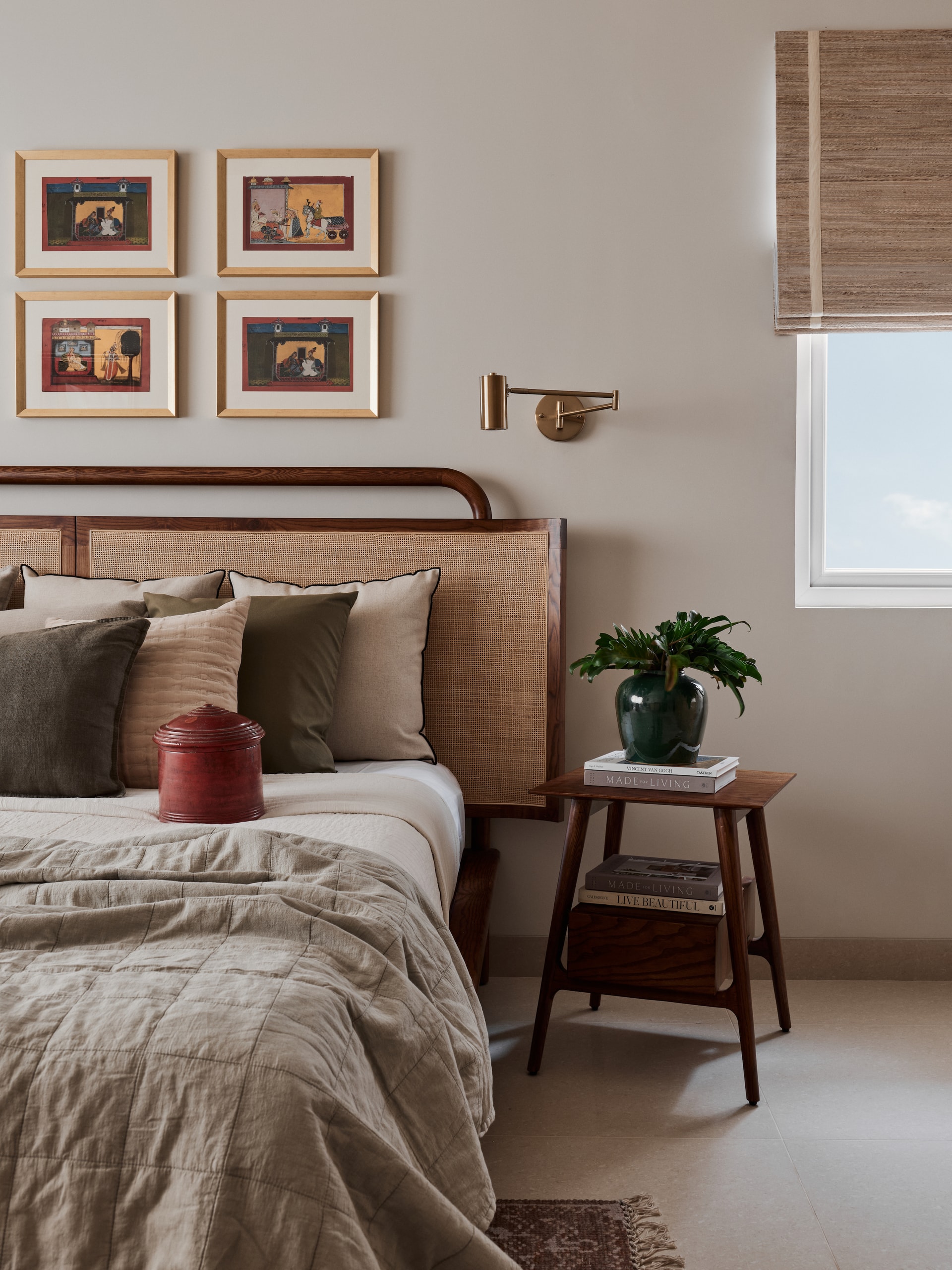 The bedrooms continued the theme, with muted tones and clean silhouettes. Wooden and cane detailing carried through, like a soft refrain in a familiar song, provides textural interest and visual continuity. In the master ensuite, a cane-woven headboard, wardrobe shutters and blinds attain a cohesive look, while in the second bedroom, the upholstered backrest extends on either side, wrapping the side tables in an embrace, just like a tree hugging you back. The guest bedroom, by contrast, achieves a minimal look with dark brown hues timber and white plastered walls. “Every design decision, from colours, furnishings to details were made with both intention and empathy,” says Manisha. “How would this feel to live in, day after day? How would this wear, age, and evolve with the people inhabiting it?” she adds.