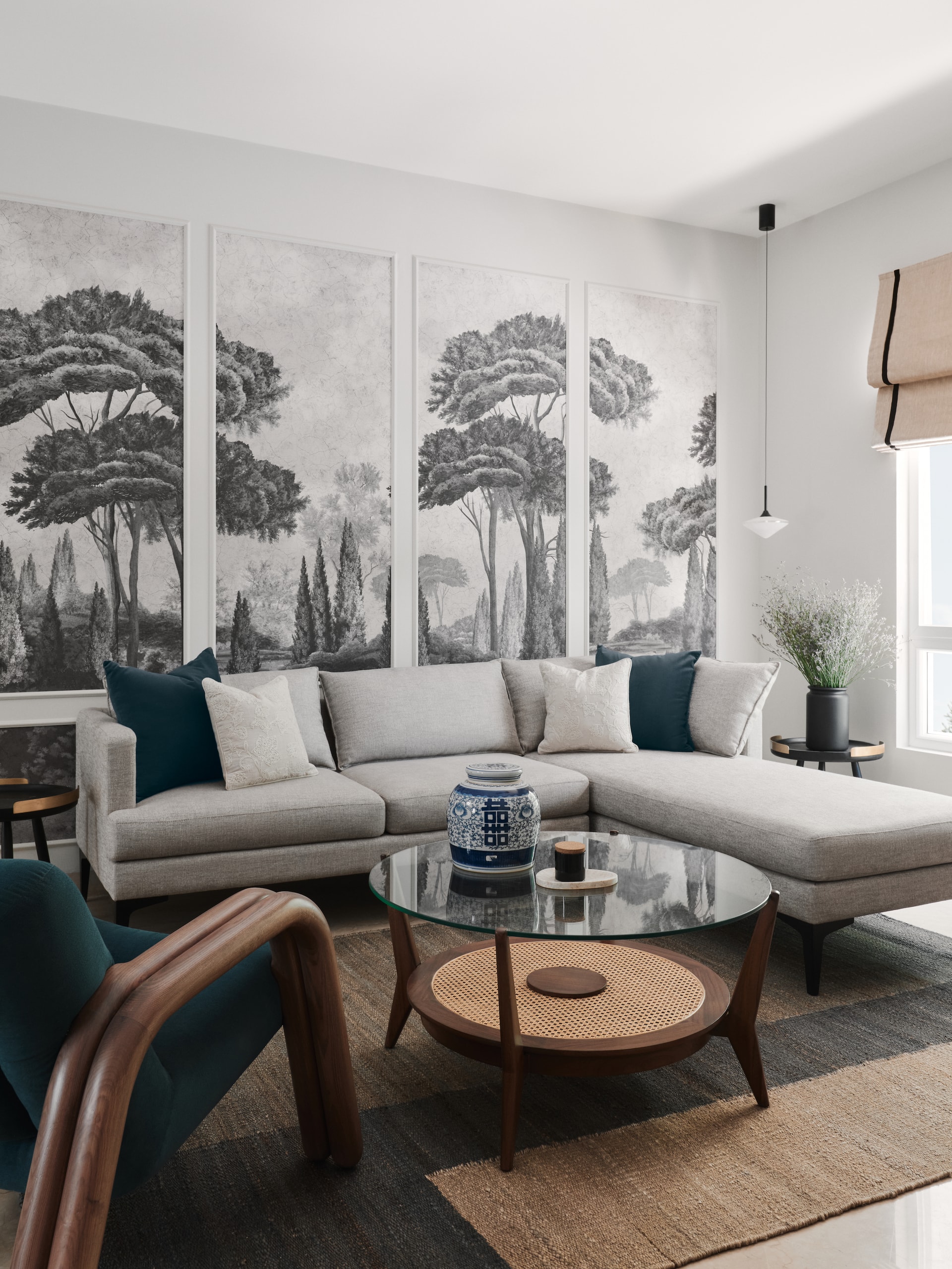 The spatial layout of Abhir unfolds like chapters in a carefully crafted story. The living room establishes the home’s design language through elegantly upholstered sofas paired with handwoven rope-detailed chairs. A wooden accent panel, running across the intersection of wall and ceiling, establishes its connection with the teak grove outside, while furniture pieces lend the space much needed warmth. Smaller corners receive equal thoughtful attention through handpicked artifacts, contributing to the overall narrative. Strategic placement of expansive windows ensures that nature becomes an integral part of the interior experience, blurring the boundaries between indoor and outdoor living.