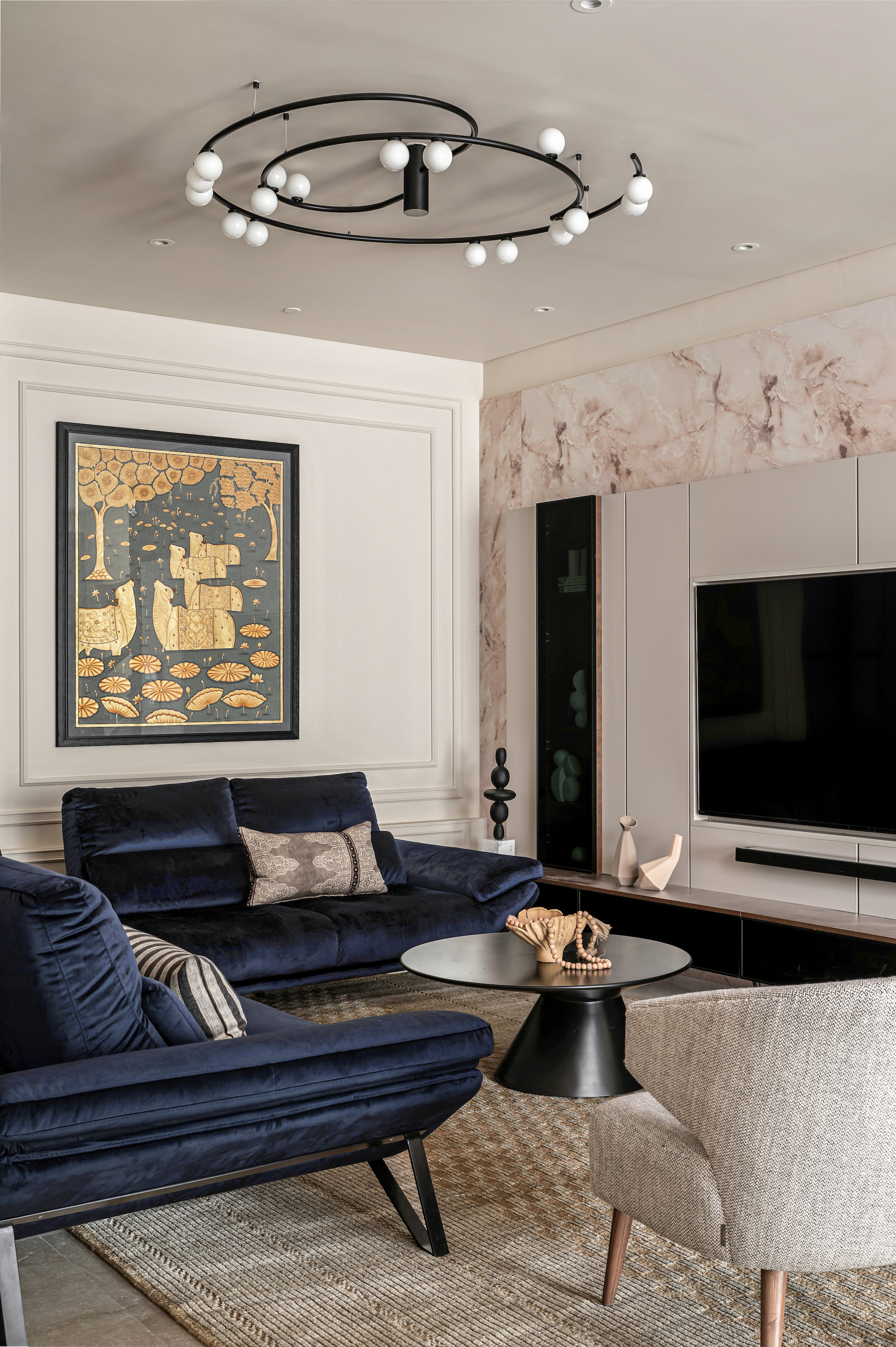 The lounge area champions both form and function, where sinuous, custom-made seating configurations balance understated luxury with tactile comfort. Anchored by a neutral palette, bold accents of deep blues and soft pinks punctuate the composition, further elevated by sophisticated black detailing. A striking pink onyx marble laminate forms the backdrop of the TV unit, its ethereal glow offset by the rich, hand-painted allure of a Pichwai artwork—a reverent nod to India’s artistic heritage. Wainscoted walls provide continuity, acting as a subtle bridge between past and present.