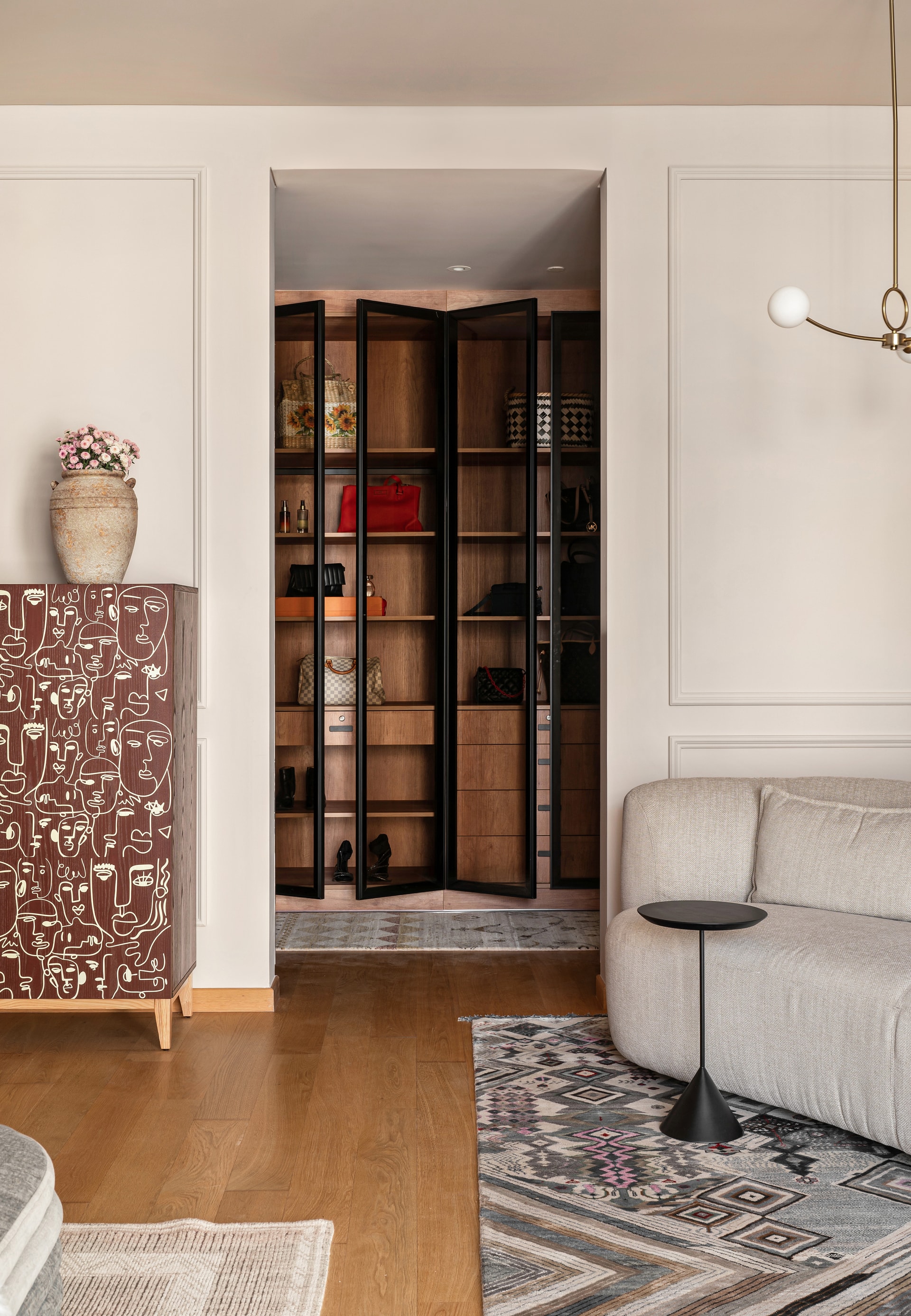 Seamlessly extending from the living room, the dining area embraces an open-plan ethos. A marble-topped dining table from Magari commands attention at its center, surrounded by plush suede chairs that exude both comfort and refinement. A suspended pendant light casts a warm, ambient glow, enriching the sensory experience of every gathering. Adjacent, a multifunctional storage unit—wrapped in a sophisticated medley of wood, grey, and gold—houses crockery, a buffet counter, and a Vastu-compliant pooja corner, seamlessly integrating practicality with cultural reverence. At its heart, an organic mirror from Sage Living disrupts the rigidity of structured lines, introducing an element of whimsical intrigue.