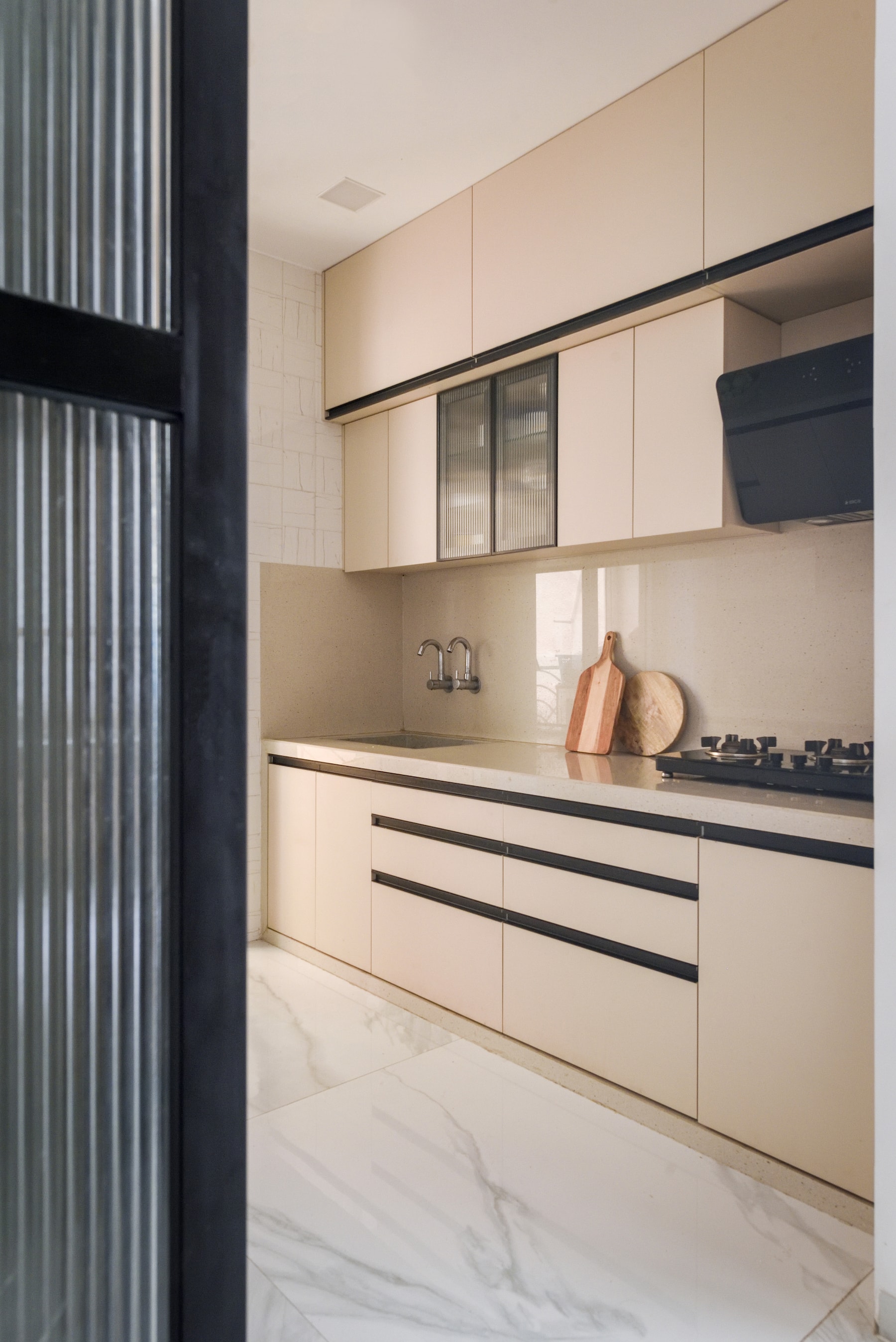 The kitchen epitomises the Japandi design philosophy with its commitment to minimalism and functionality. This space has been meticulously designed to ensure that every element serves a purpose while maintaining a sleek, uncluttered aesthetic. The cabinetry, finished in a soft, matte hue seamlessly integrates with the clean lines of the room, contributing to an overall sense of calm and order. Countertops are crafted from durable, neutral-toned materials that enhance the kitchen’s minimalist appeal while providing ample workspace. Thoughtful design details, such as integrated appliances and streamlined storage solutions, ensure that the kitchen remains highly functional without compromising its sophisticated, serene ambiance. This harmonious blend of form and function reflects the Japandi ethos, where simplicity meets practicality to create a space that is both beautiful and efficient.
