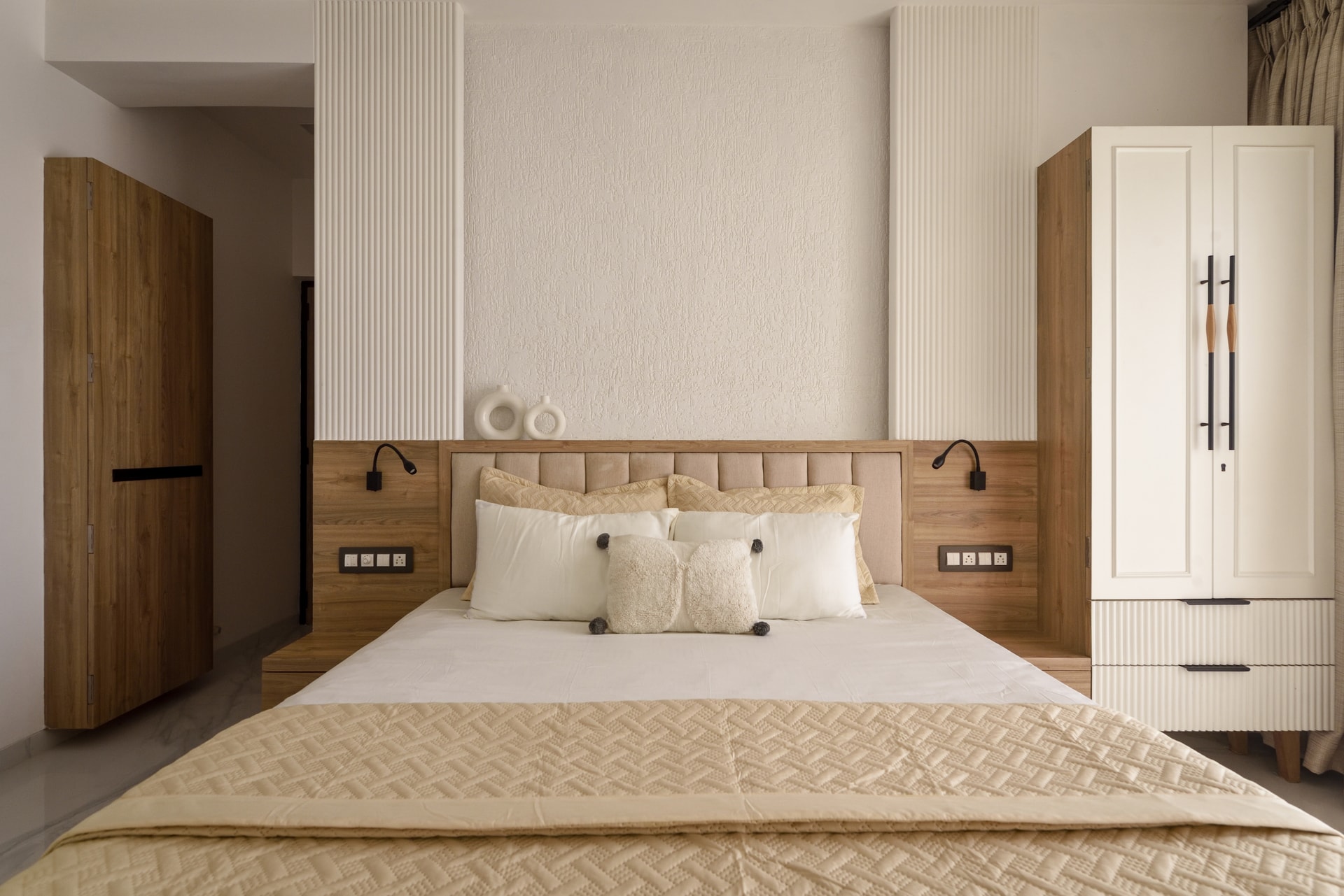 The bedrooms are thoughtfully designed to provide a serene and personalised retreat for each occupant. Embracing the Japandi style’s emphasis on tranquility and understated elegance, each room features a harmonious blend of soft, neutral tones and natural textures. The master bedroom showcases a minimalist aesthetic with a streamlined platform bed and carefully chosen bedding in muted shades, complemented by wooden accents that add warmth and depth. The guest bedroom continues the theme with a refined palette , punctuated by a subtle pop of colour in the bedding to create a welcoming atmosphere.