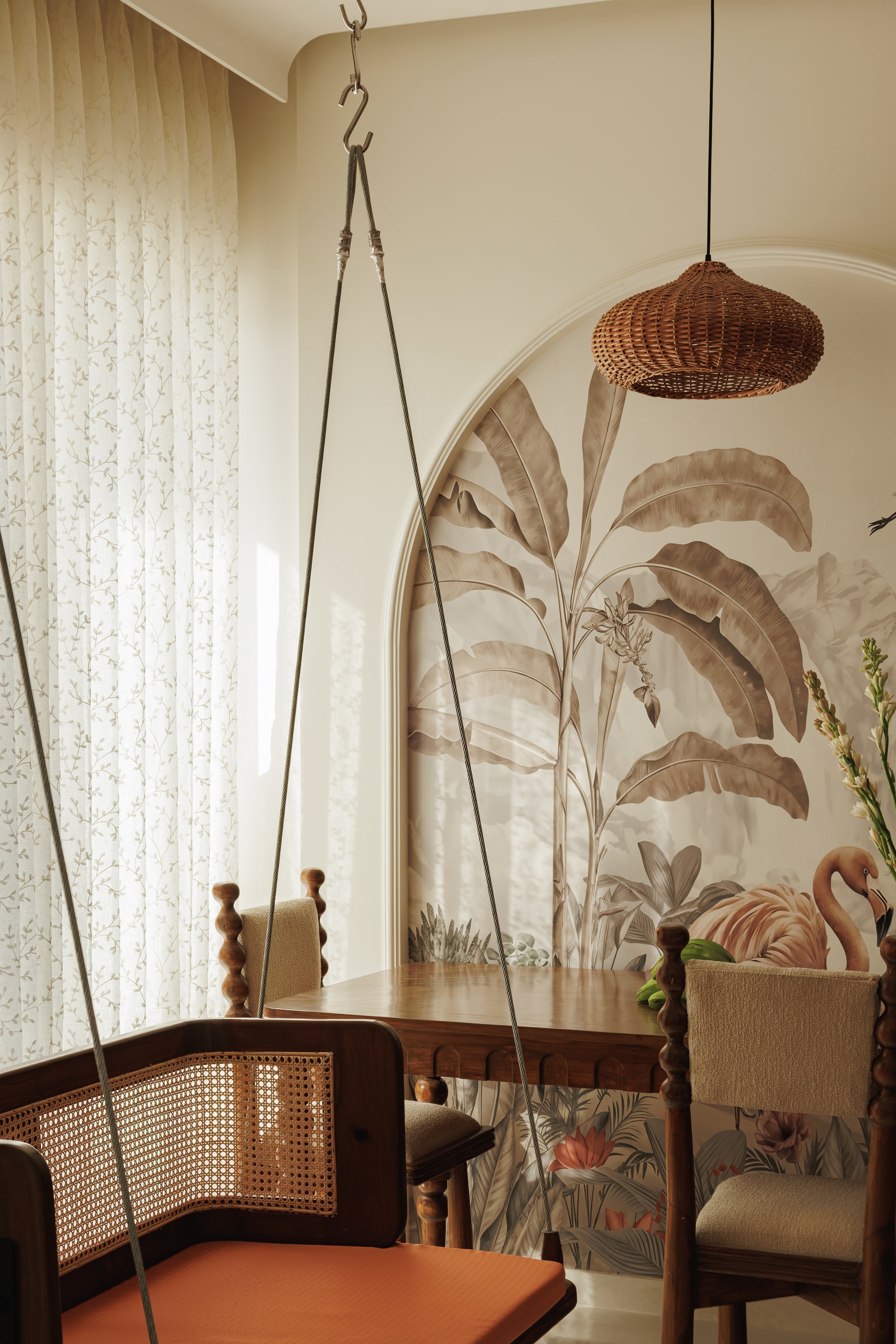 The living area emerges as the most evocative space in the home, anchored by a traditional cane-woven jhoola that instantly evokes memories of Indian homes of the past. Upholstered with a striking orange cushion, the swing becomes both a functional seating element and a cultural anchor. Behind it, a dramatic tropical mural wallpaper featuring banana leaves, cranes, and flamingos adds a layer of storytelling, bringing nature indoors while introducing colour, movement, and whimsy. This bold backdrop is carefully balanced by the otherwise neutral setting, ensuring the space remains elegant rather than theatrical.